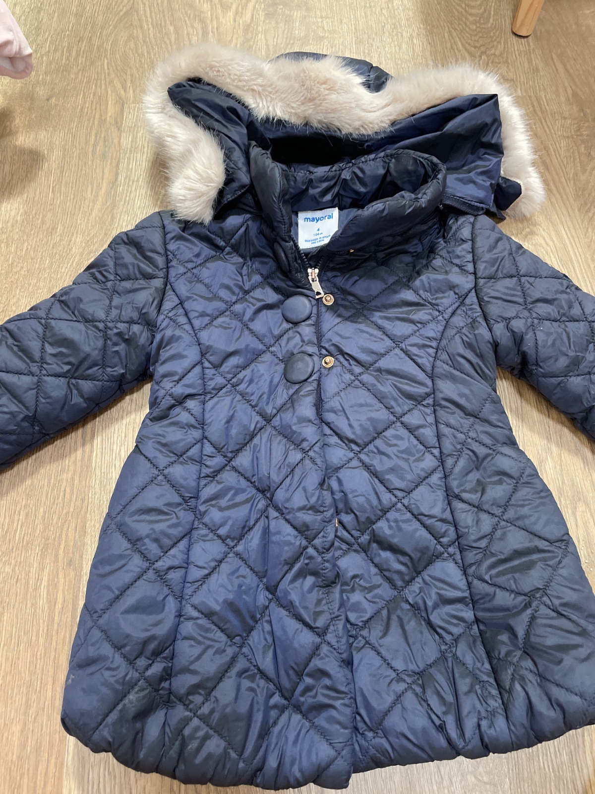 Krásna zimná bunda zn.Mayoral, veľ.104, predĺžený strih, podšitá flísom. Kožušina z kapucne sa dá odopnúť a aj celá kapucňa sa dá odopnúť. Je vo výbornom stave, jediné poškodenie sú ošúchané patent...