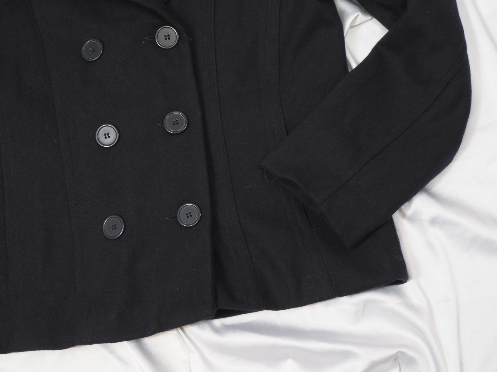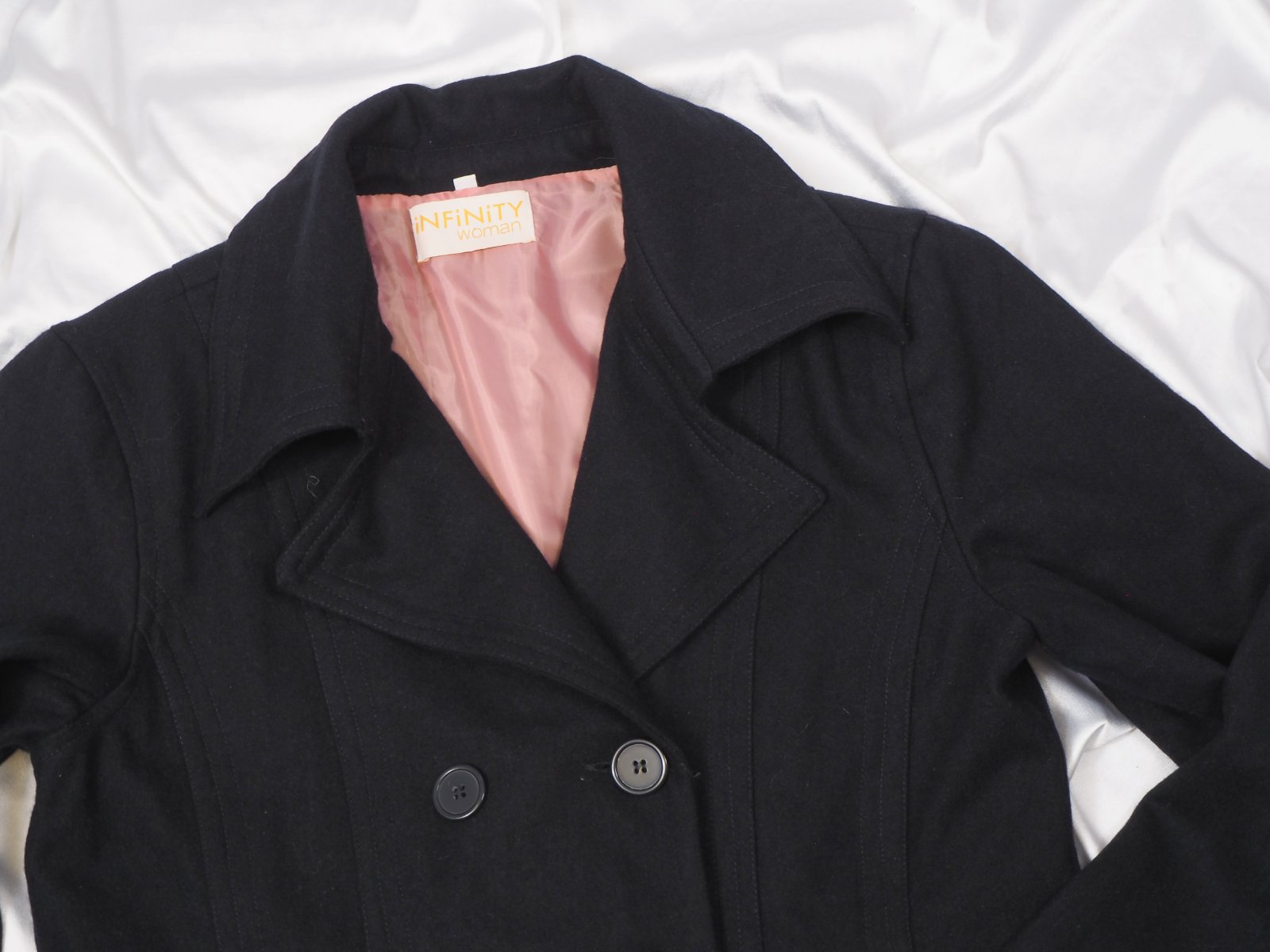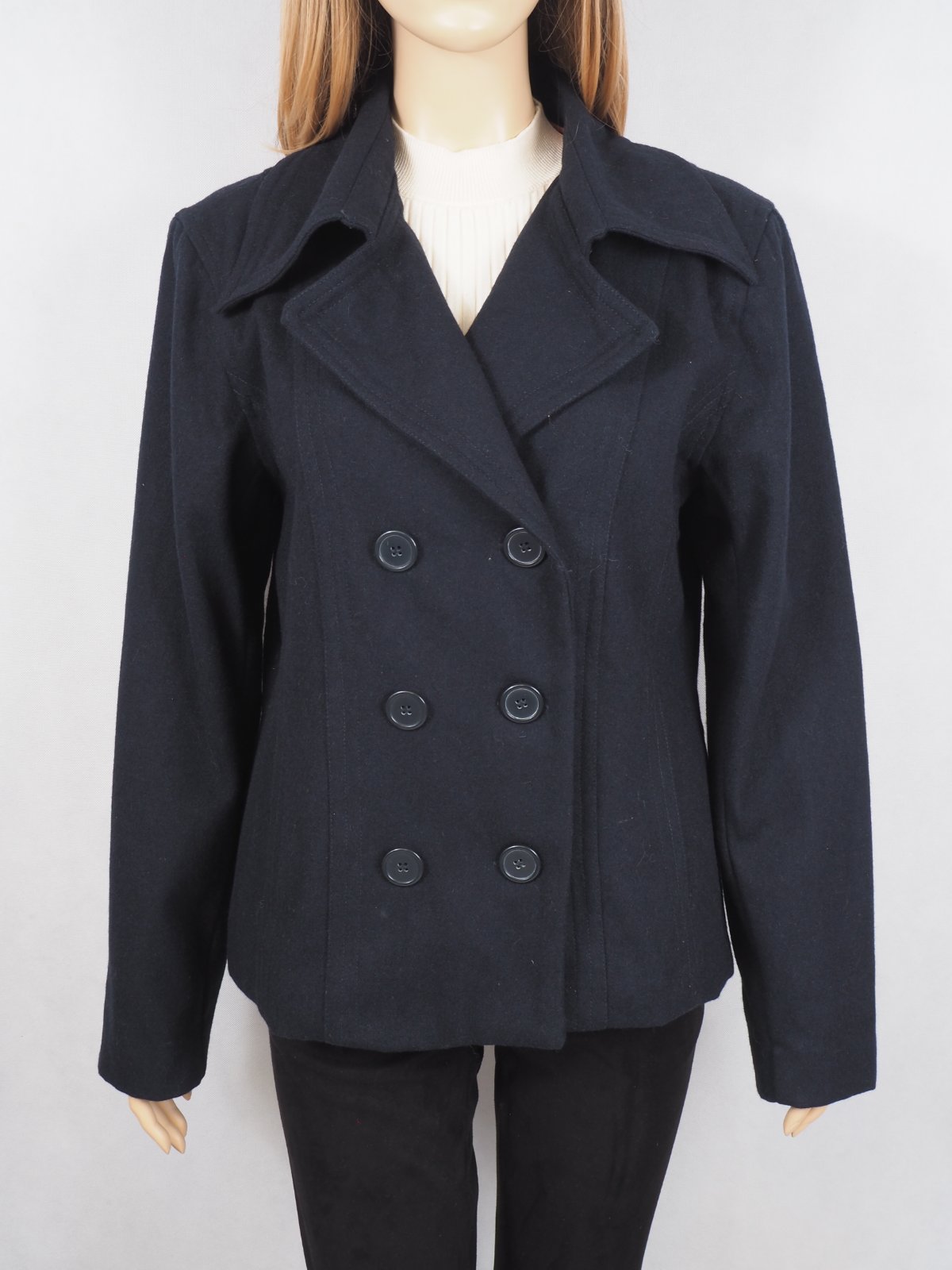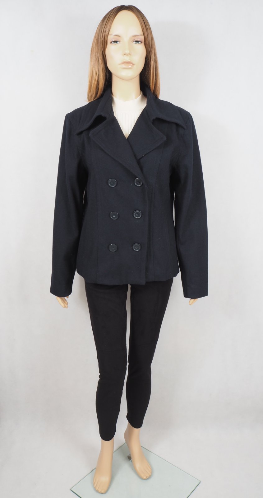 Kvalitný vlnený kabát tmavomodrej farby, zapínanie na gombíky v dvojrade, materiál 50% vlna, 50% polyester, super stav.