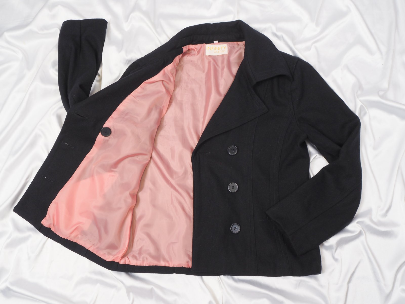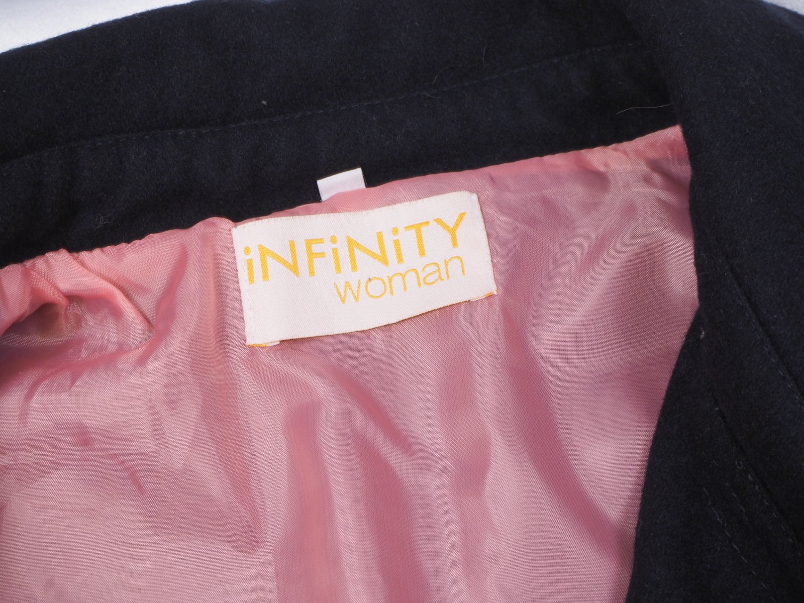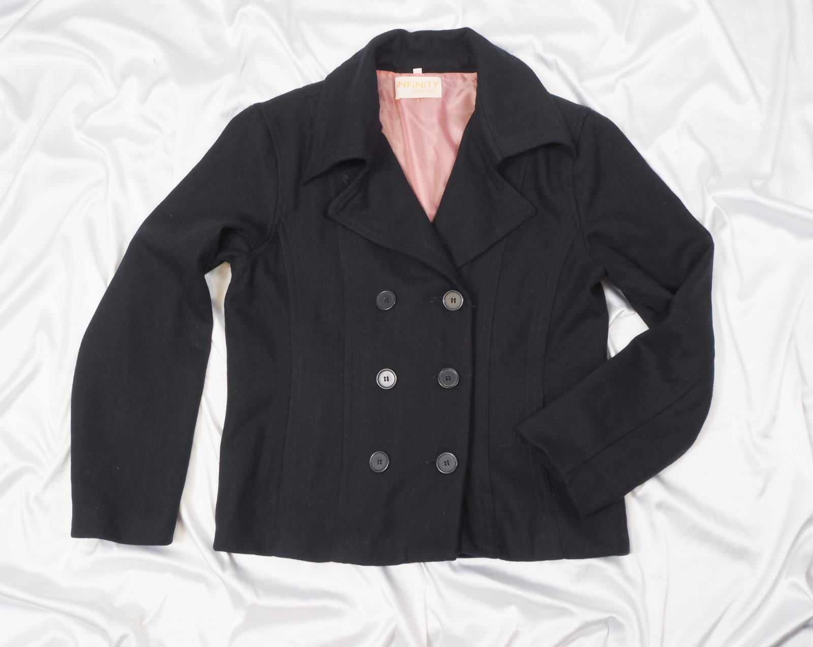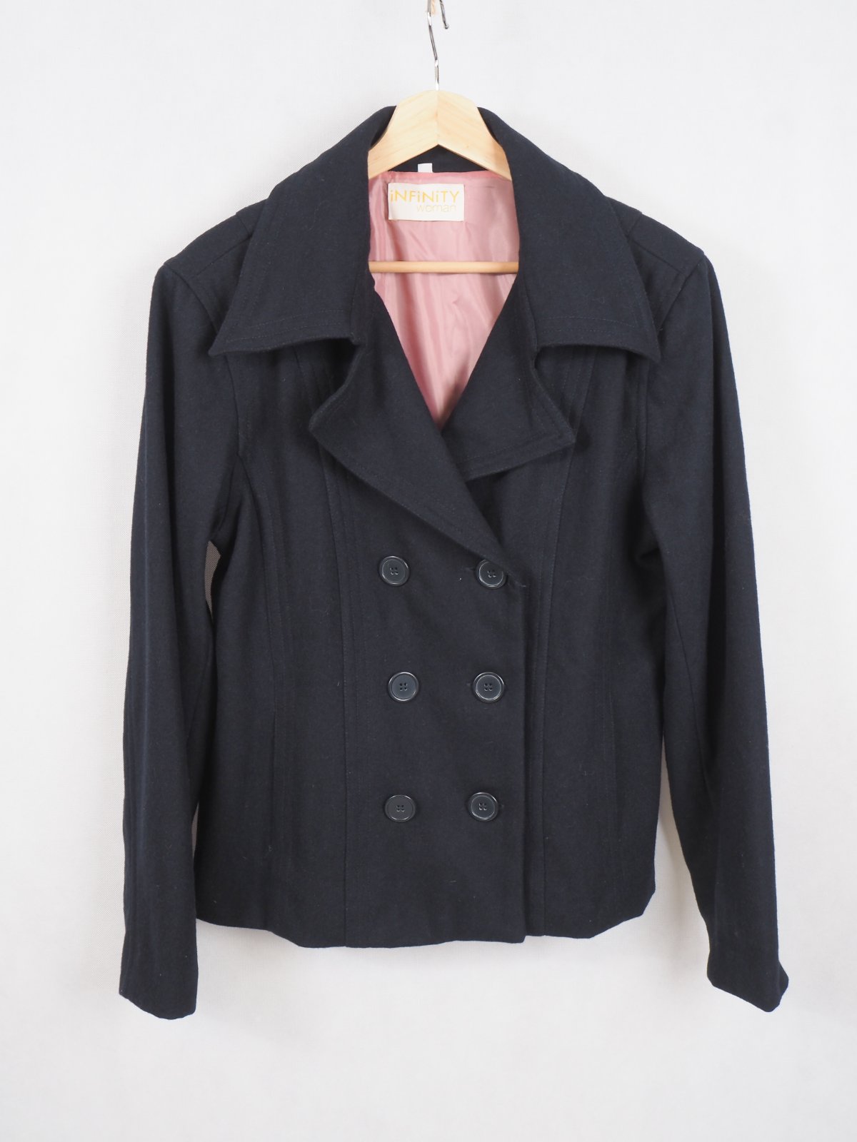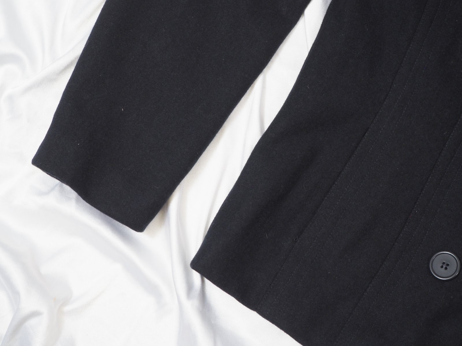 Kvalitný vlnený kabát tmavomodrej farby, zapínanie na gombíky v dvojrade, materiál 50% vlna, 50% polyester, super stav.