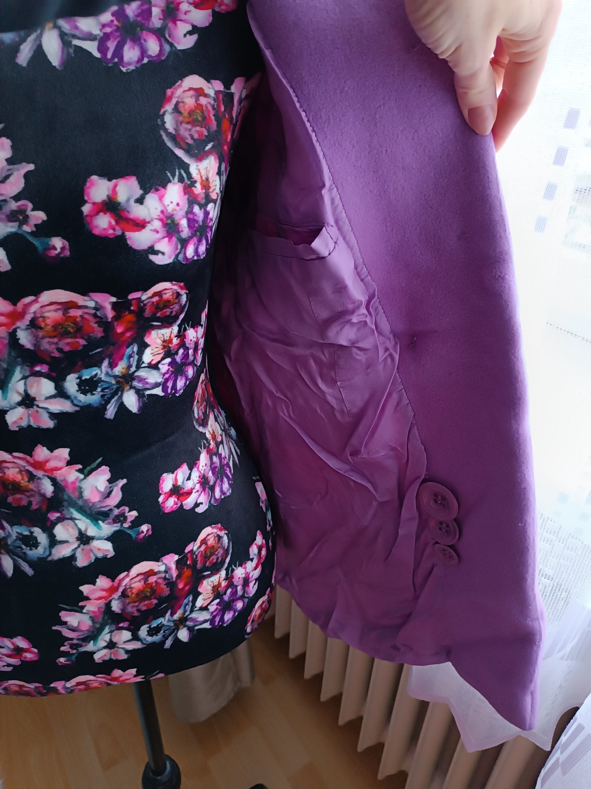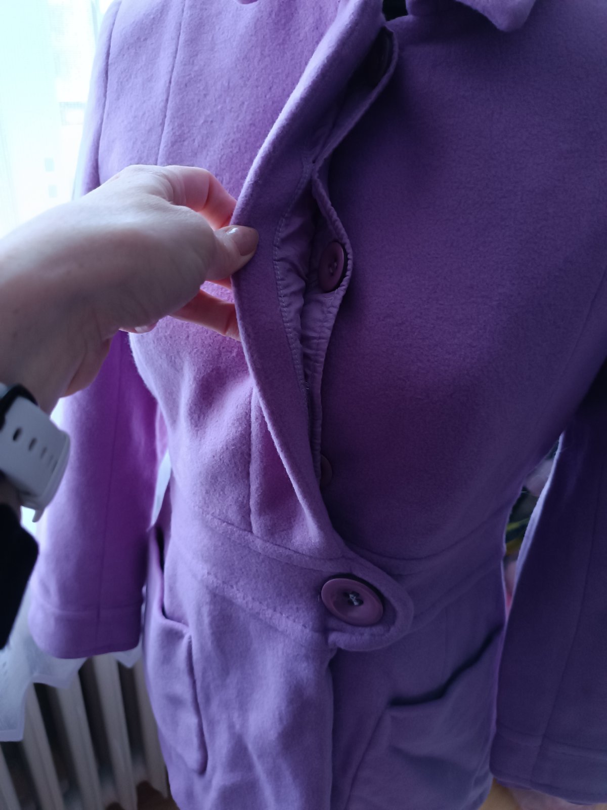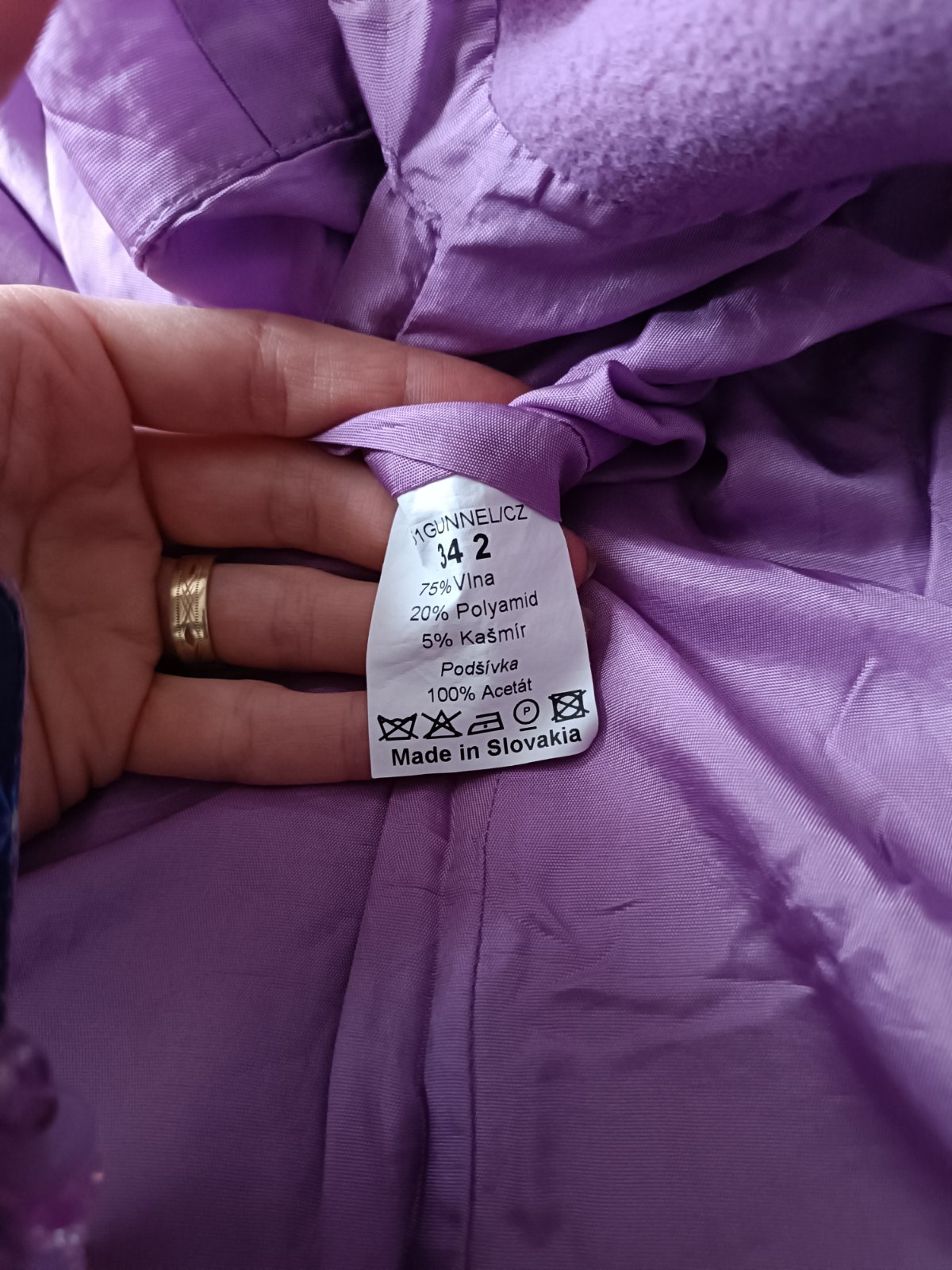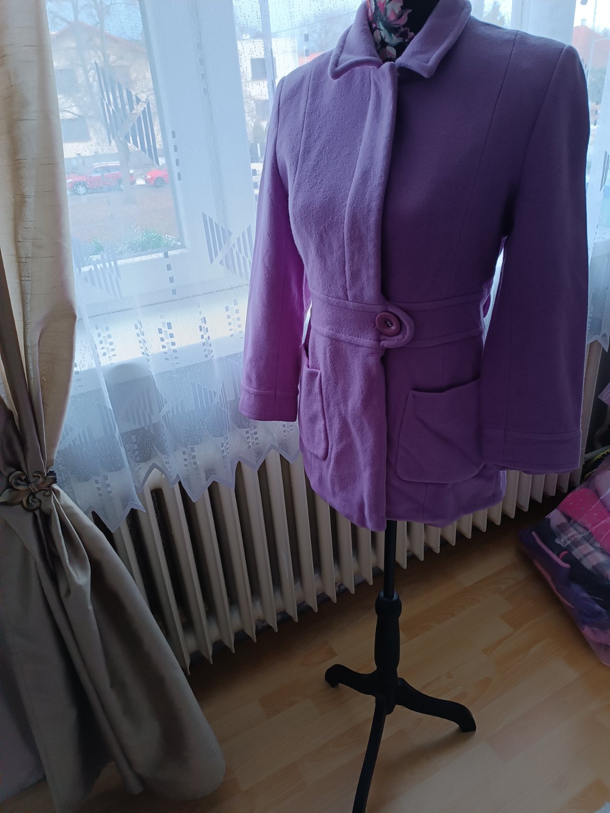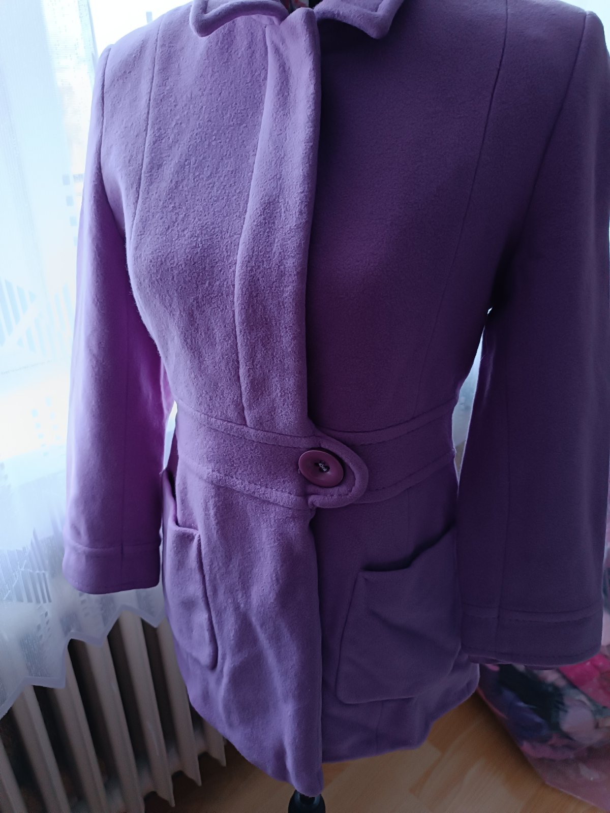 Nádherná lilava farba, nepoškodený,neznoseny, nemá žmolky. Použitý pár krát. Kvalitný -ziaden Aliexpress -vyrobene na Slovensku. Z vnútra sú prisite náhradné gombíky. Futrovaný je celý, aj rukávy, nie je zateplený -material 75% vlna -vyzaduje chemické čistenie (pred uskladnením bol v čistiarní ale keďže bol zložený treba ho napariť lebo je pokrčený).