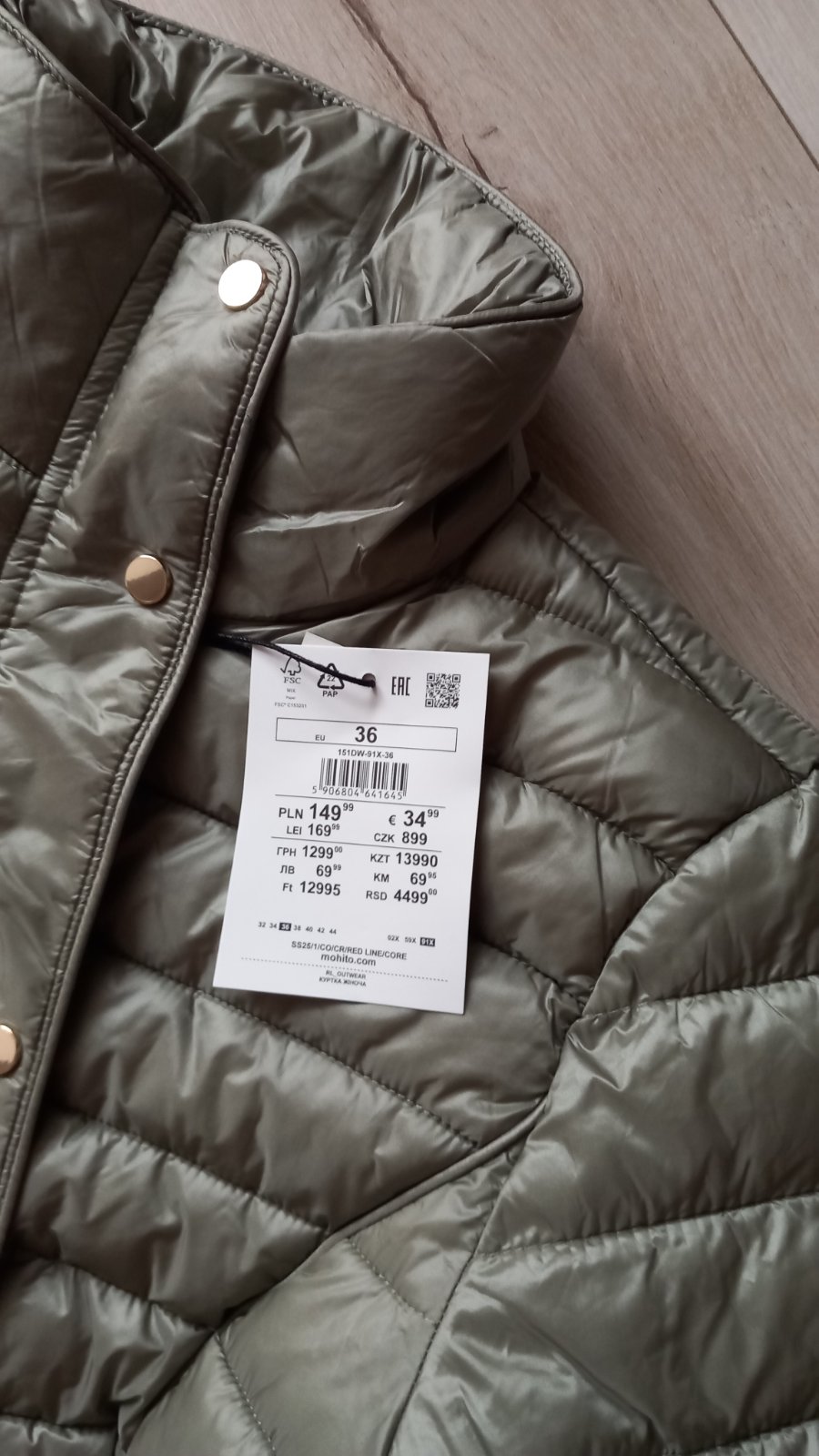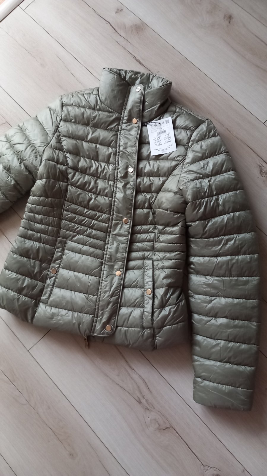 Vrchná látka má jemný lesk, ktorý nie je vo foto veľmi viditeľný, látka má mierne krčivý efekt. V golieri je skrytá kapucňa z rovnakého materiálu. Medzi ľavým vreckom a spodným lemom je drobná zaši...