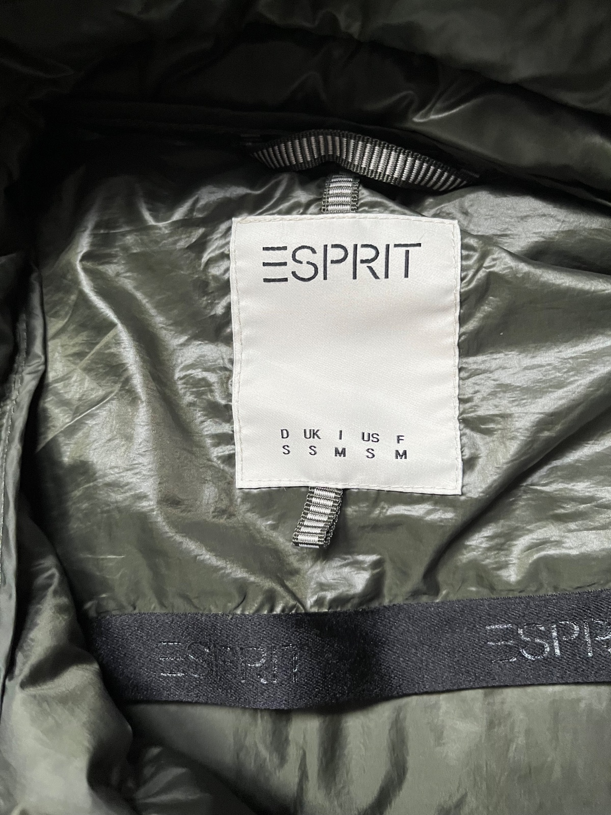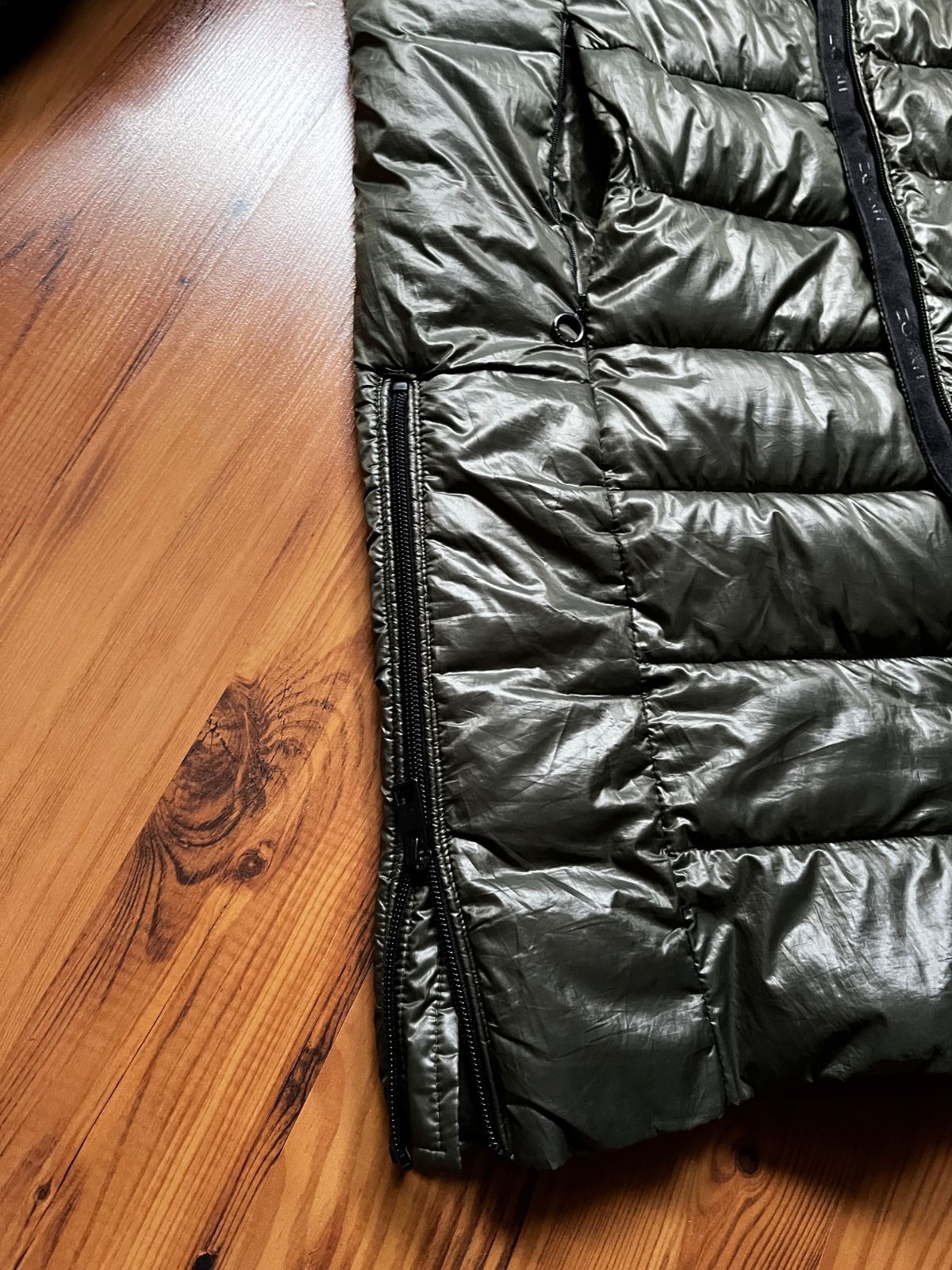 Olivovo zelena s čiernymi doplnkami zips .Na bokoch bundy sú zipsy otvárateľné ,tak sa da pododlne nosit pri chodzi.