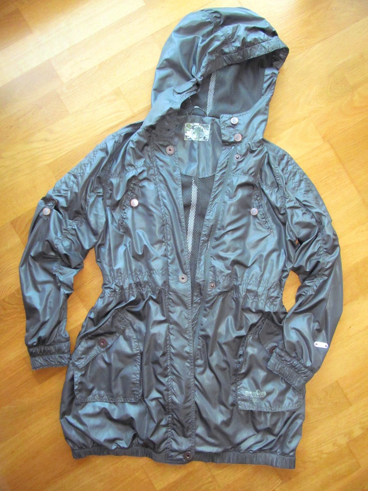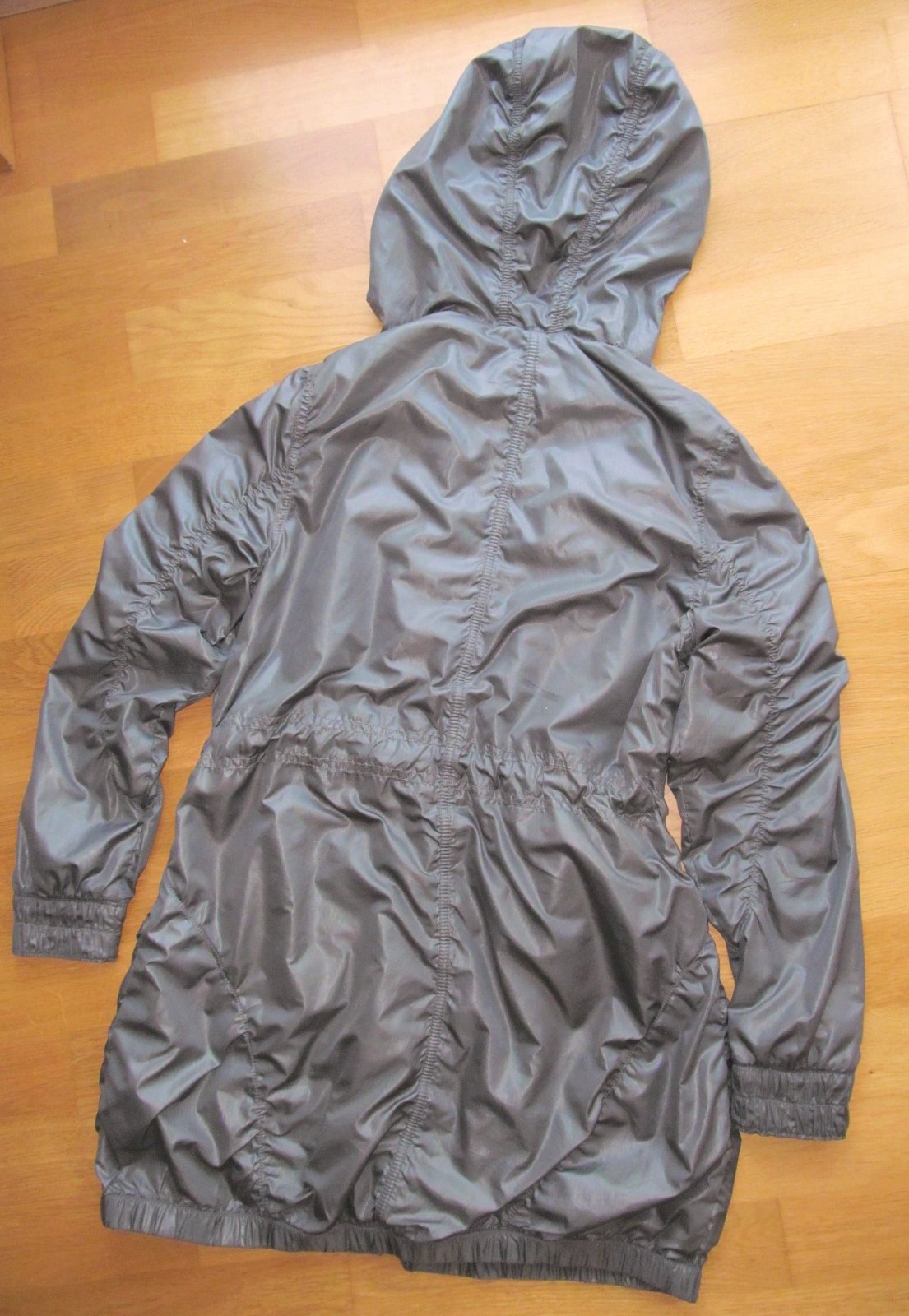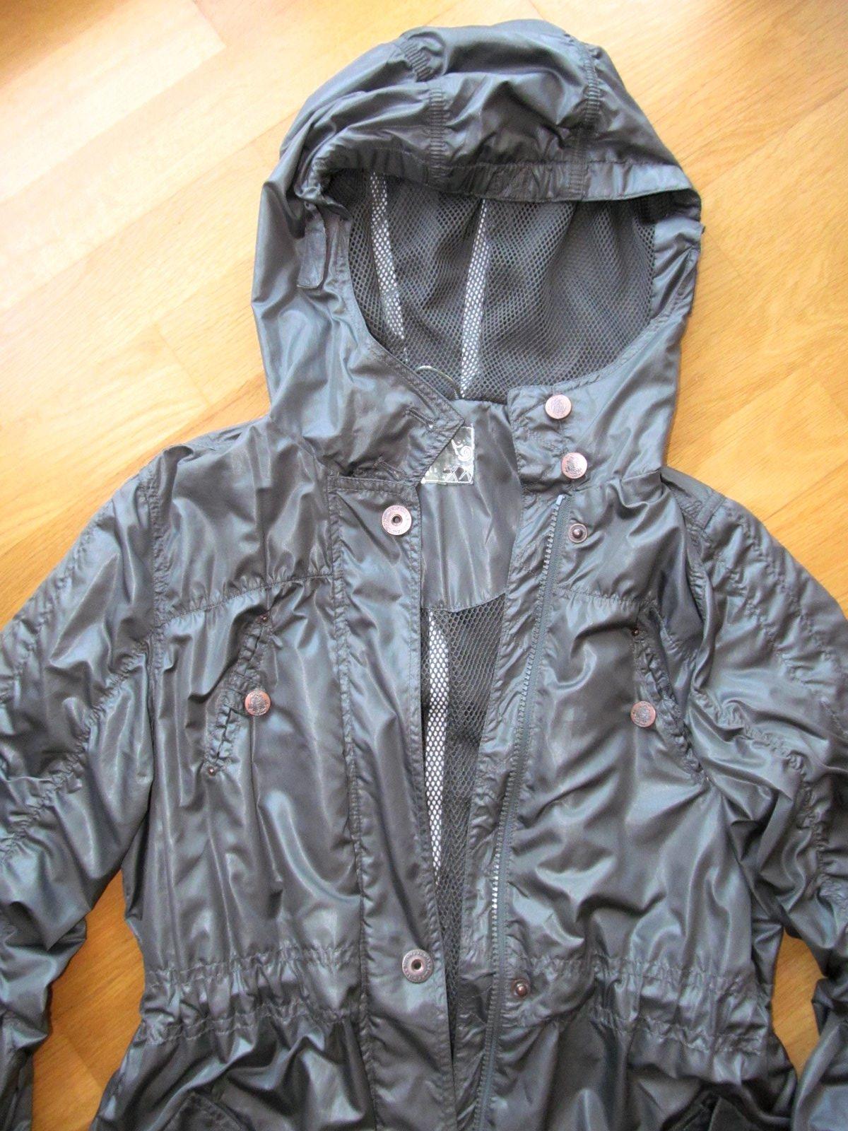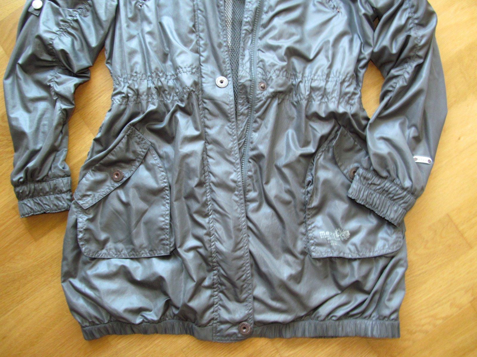 Prepracovana bunda Mexx, alebo skor plášť na prechodne obdobie. PC niekolko nasobne vyssia, vhodna pre dievca alebo aj mensiu stihlu maminku. Nosena malo. Farba je kaki, bunda je podsita sietovinou, material vonkajsi je jemnulinky sustiak, lesk je jemny, zle sa to foti. Bunda ma 4 vonkajsie vrecka a dve vnutorne, v pase sa da stiahnut, na spodnom okraji je vsita guma, čo vytvára jemne balonovy efekt, ale latka je padava, takze nie prilis. Kapucka je tiez podsita sietovinou. Rukavy maju zaujimave detaily a daju sa pomocou gombika mierne skratit. Bunda je sice dlha ale vdaka jemnemu materialu a sietovej podsivkovine pomene skladna. Je bez poskodeni, akurat malicky znak mexx na rukave je vstrede prasknuty.