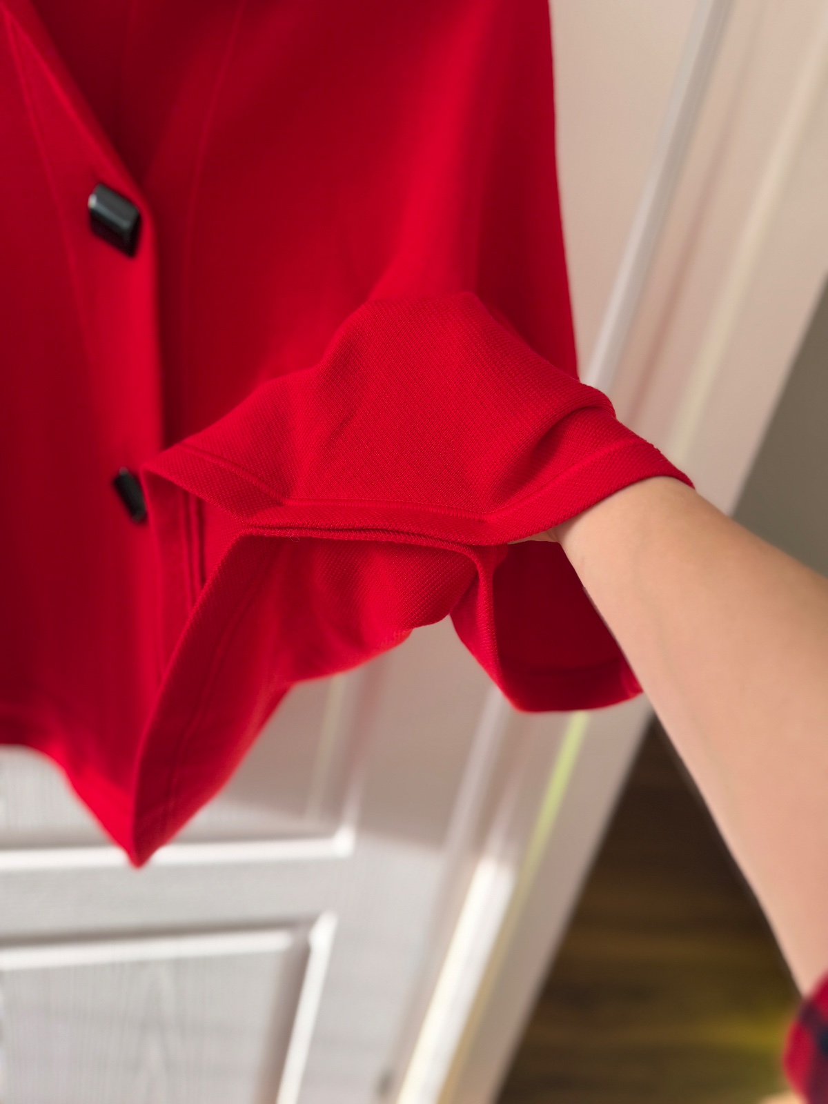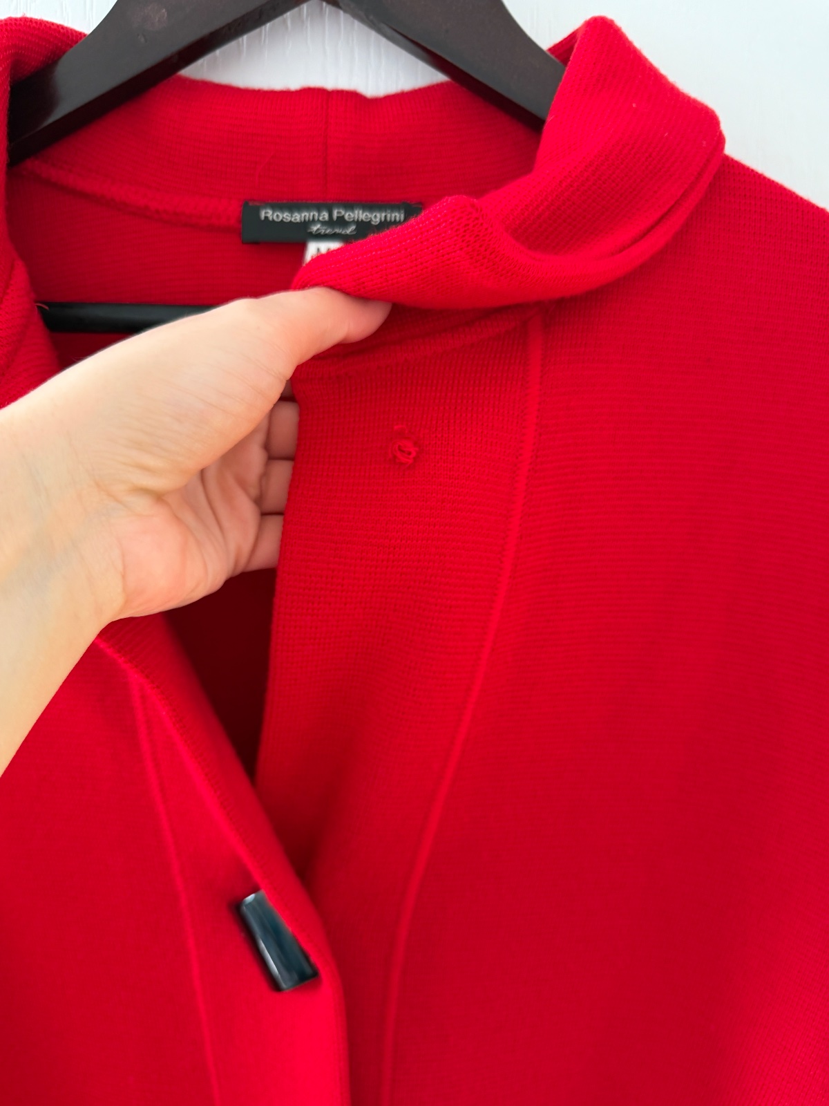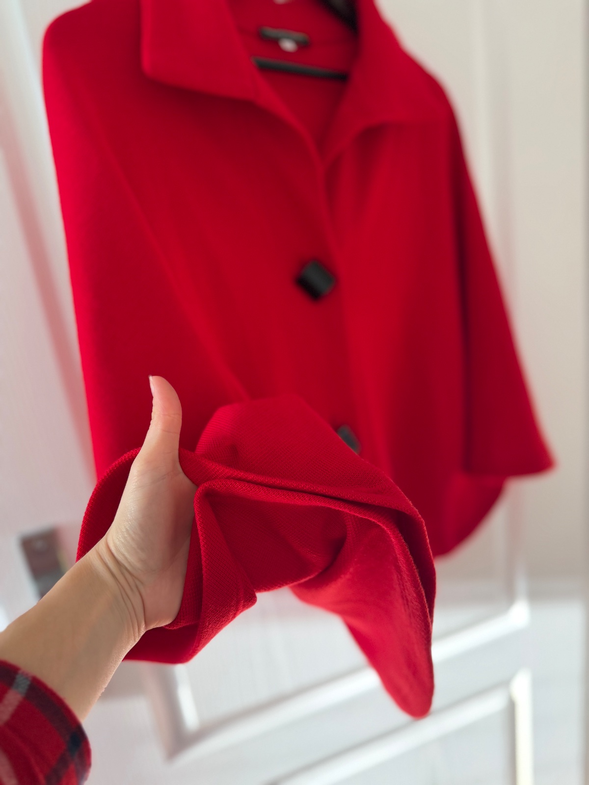 Toto luxusné pončo od talianskej značky Rosanna Pellegrini kombinuje sofistikovaný štýl s najvyššou kvalitou remeselného spracovania. Hlboký odtieň červenej v kombinácii s rafinovaným úpletom vytvára základný kúsok šatníka, ktorý upúta pozornosť a zaručí maximálne pohodlie. Kľúčové vlastnosti produktu: Prémiový materiál: Vyrobené zo 100 % extra jemnej merino vlny. Ide o jedno z najjemnejších vlákien na svete – je neuveriteľne mäkké, nesvrbí a má prirodzené termoregulačné vlastnosti. Taliansky dizajn: Rosanna Pellegrini je známa svojou pozornosťou k detailu a klasickou európskou eleganciou. Pončo sa vyznačuje elegantným golierom. Dekoratívne, veľké, čierne gombíky v geometrickom tvare (bohužiaľ, jeden chýba). Štýlové vlnité lemy dodávajú nádych ľahkosti. Toto voľné pončo s 3/4 rukávmi krásne splýva a poskytuje uvoľnený pocit. Perfektne sa hodí k priliehavým čiernym nohaviciam alebo ceruzkovej sukni. Môžete ho nosiť cez obyčajný rolák v chladnejších dňoch alebo cez elegantnú košeľu pre formálny kancelársky vzhľad.