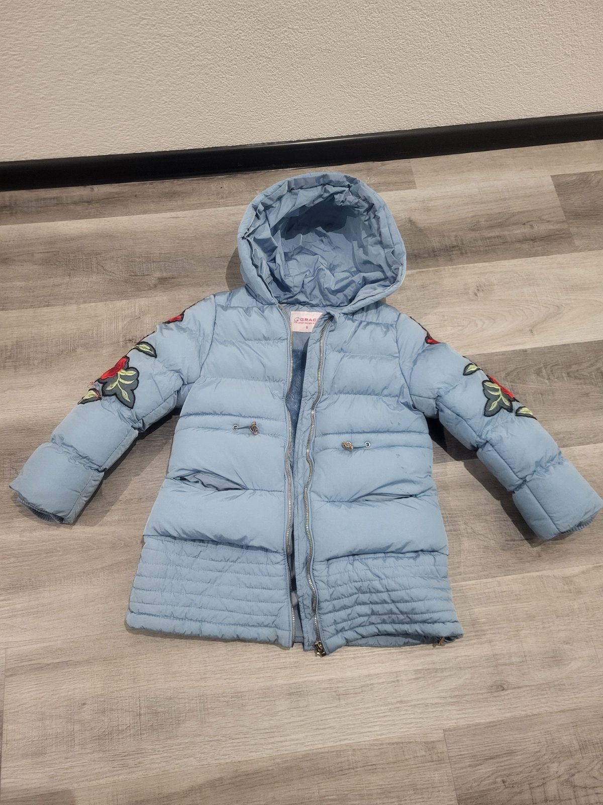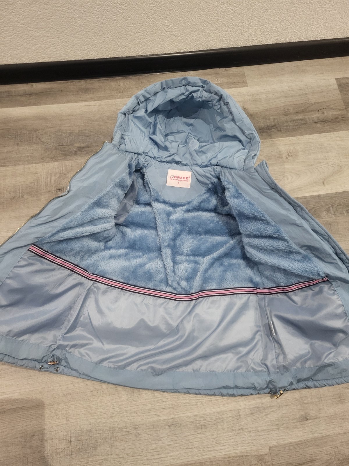 Veľmi teplá zimná bundička do pása a odopínateľnou kapucňou. Vo vnútri aj v kapucni je hrubá modrá kožušinka, v rukávoch nie je.Zapínanie je na zips aj gombíky. Okolo krku aj pása je hrubý patent. ...