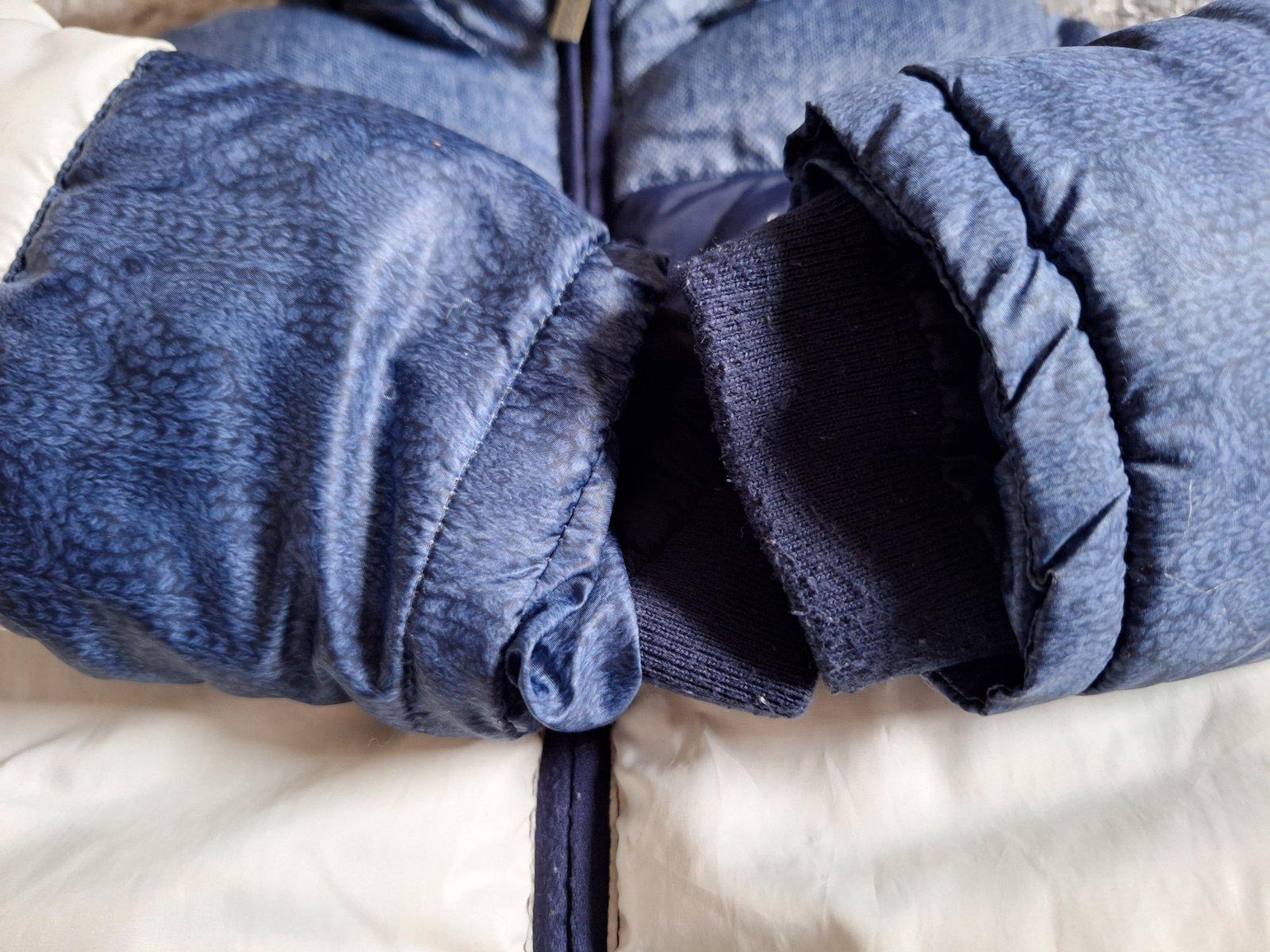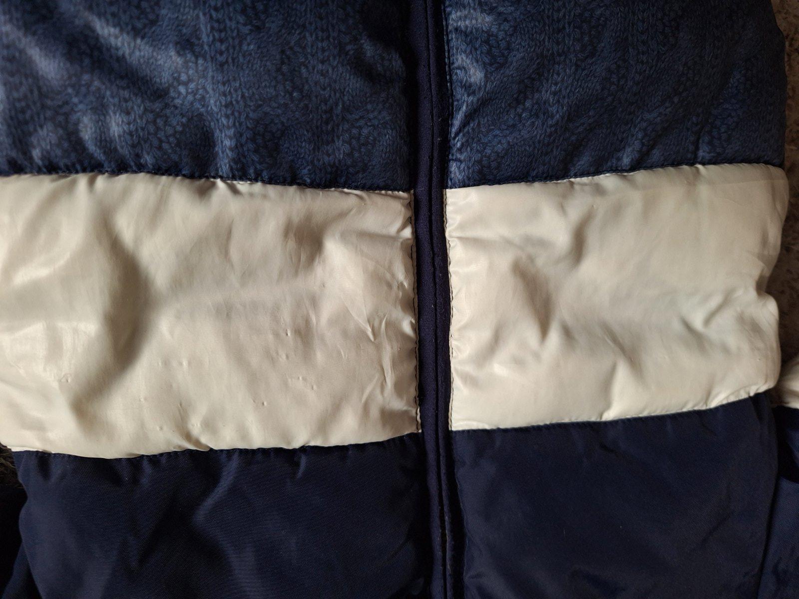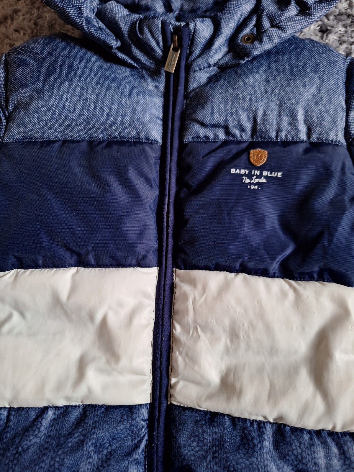 Teplá, hrubá, ale ľahká vetrovka už skôr na donosenie (viď foto nedostatkov), biela farba je už trochu zašlá.