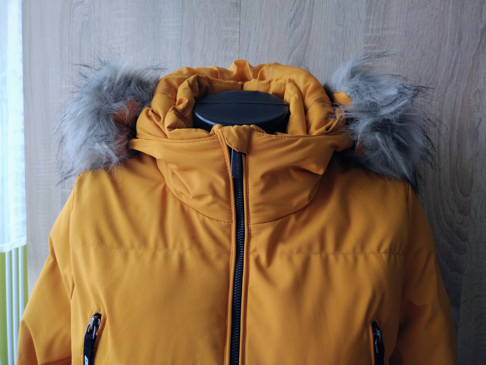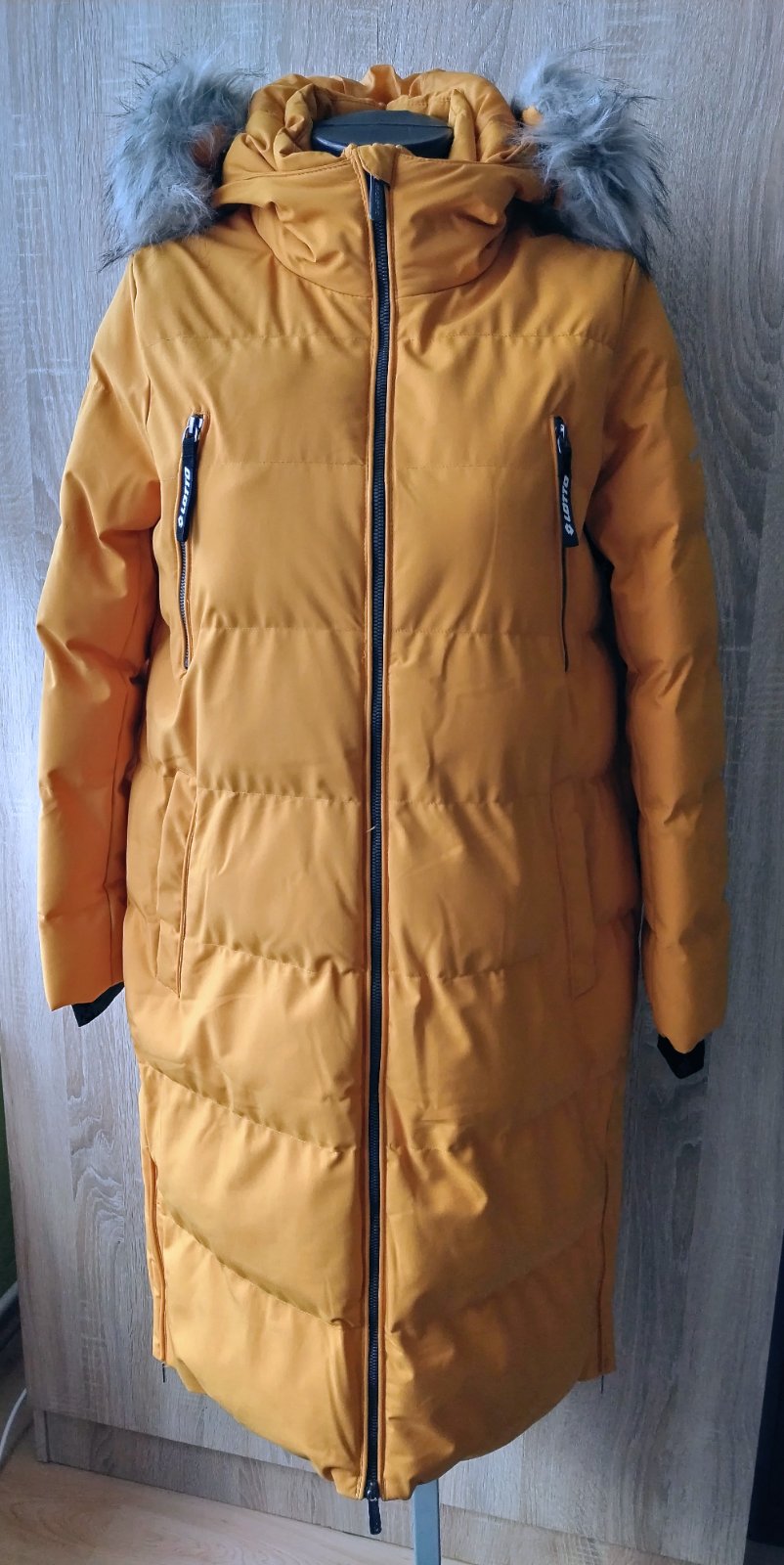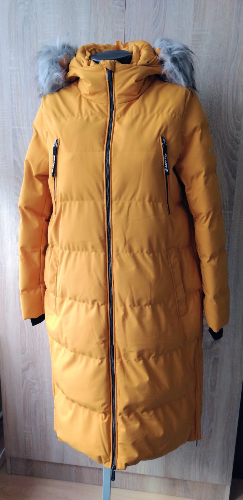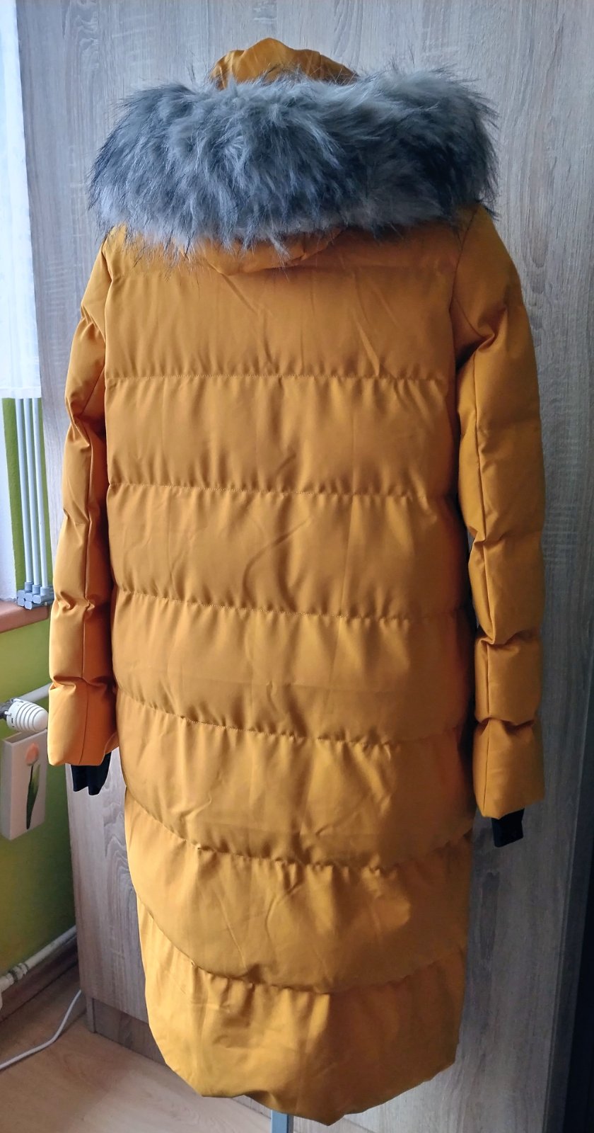 Výplň je z imitácie kačacieho peria, bunda má dvojcestný hlavný zips, vnútorná manžeta rukáva z pružného úpletu s otvorom na palec, bočné zipsy v spodnej časti kabáta, nenosený.