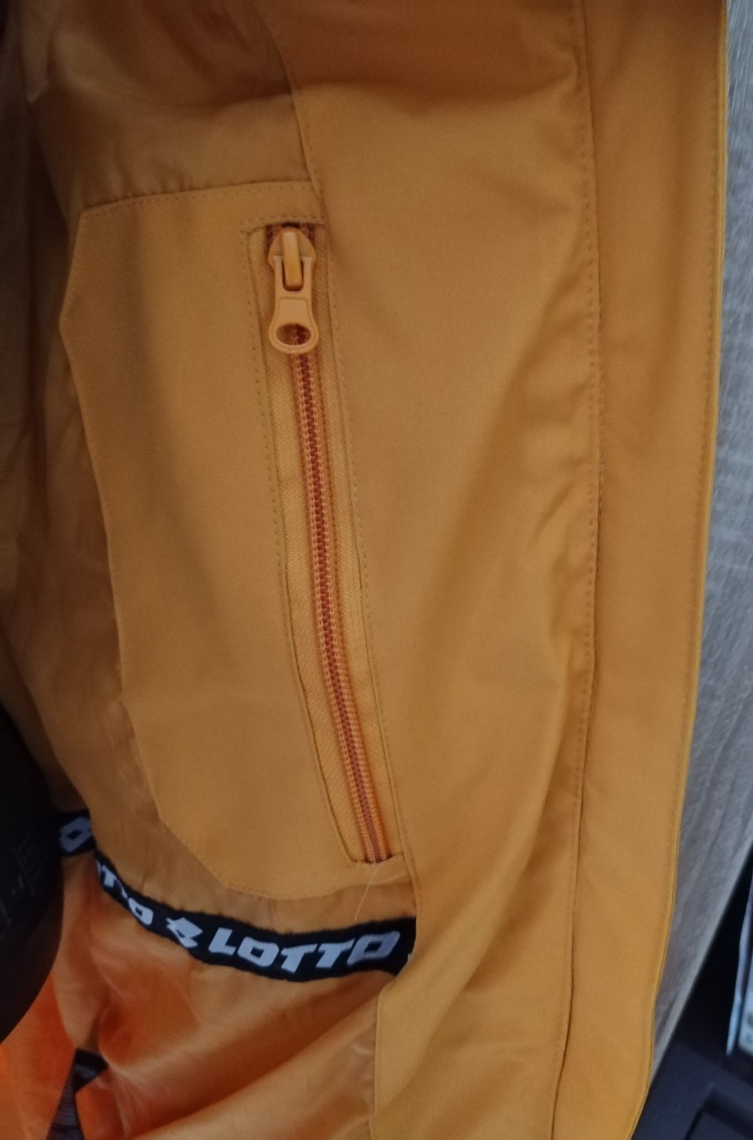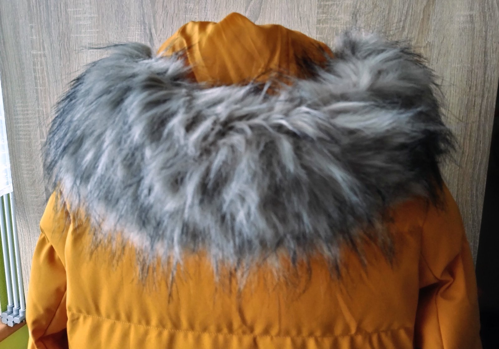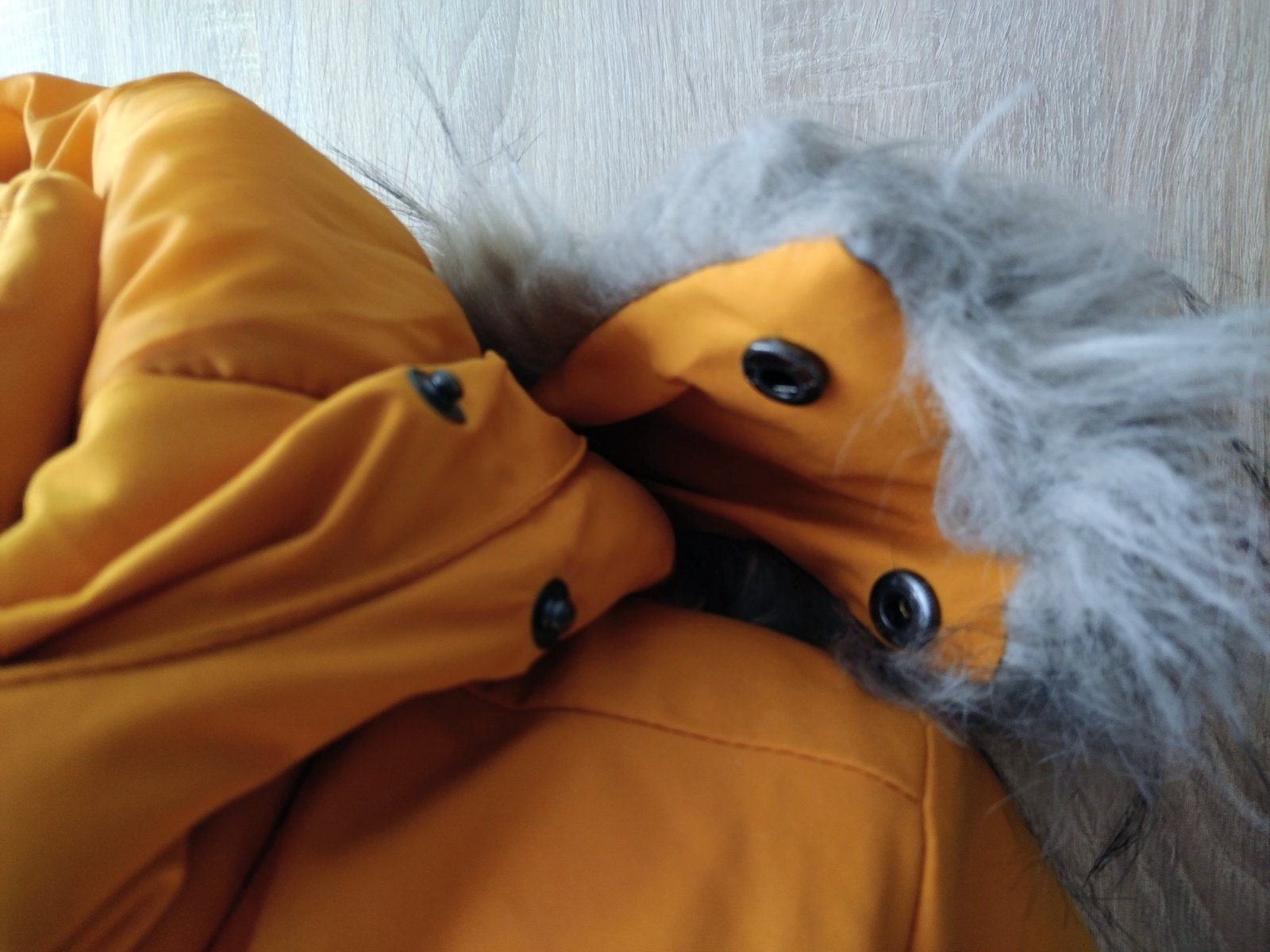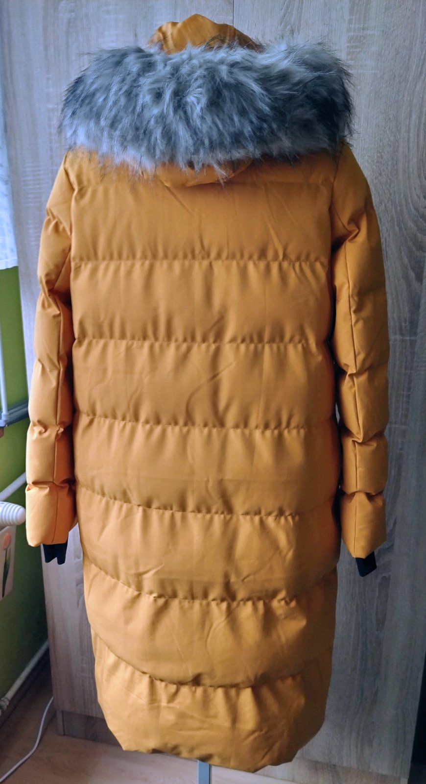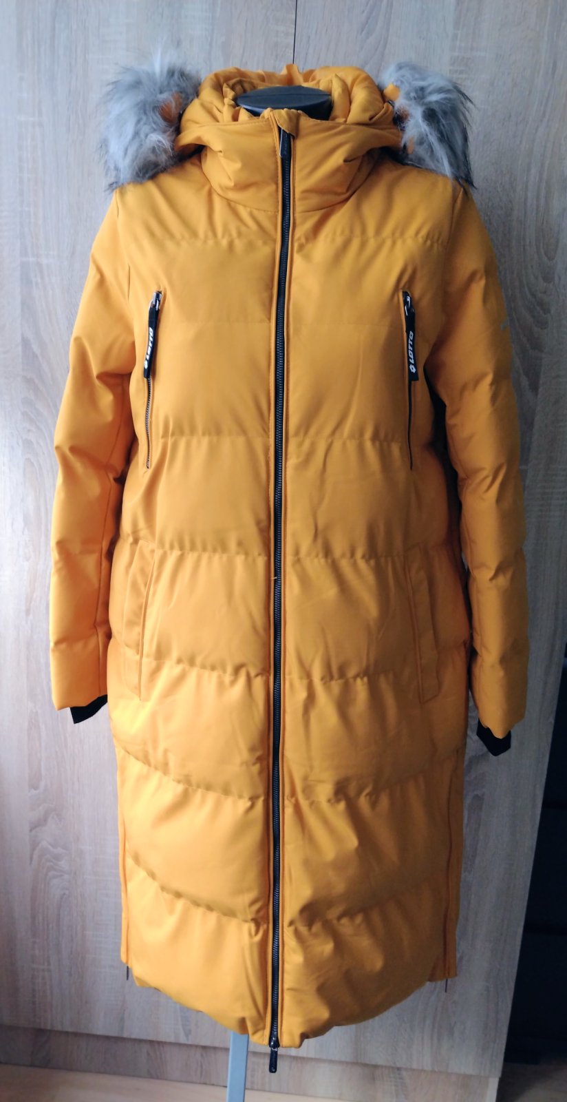 Výplň je z imitácie kačacieho peria, bunda má dvojcestný hlavný zips, vnútorná manžeta rukáva z pružného úpletu s otvorom na palec, bočné zipsy v spodnej časti kabáta, nenosený.