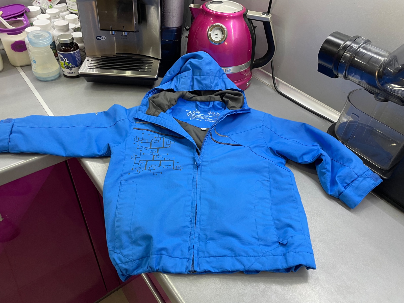 Bunda bola nosená na bicykel. Má malinké zatrhnutie na spodku bundy, ale určite ešte vhodná do školky alebo na ihrisko.