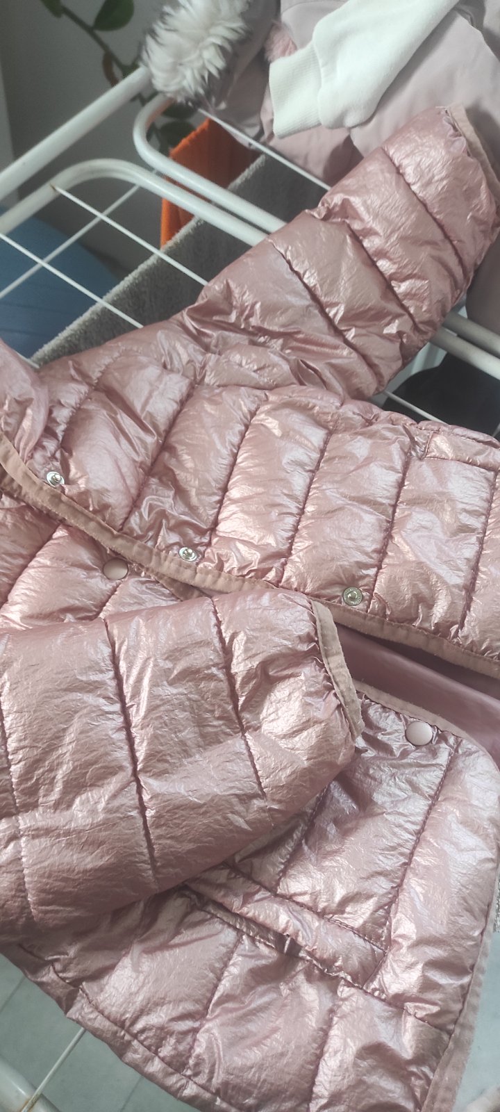 Krásna, mäkkučká bundička na prechodné obdobie, je v super stave, akurát cvočky na vačkoch majú trošku obitý lak - viď foto... nie je to podľa mňa nijak rušivé... V golieri je schovaná tenučká kapucňa
