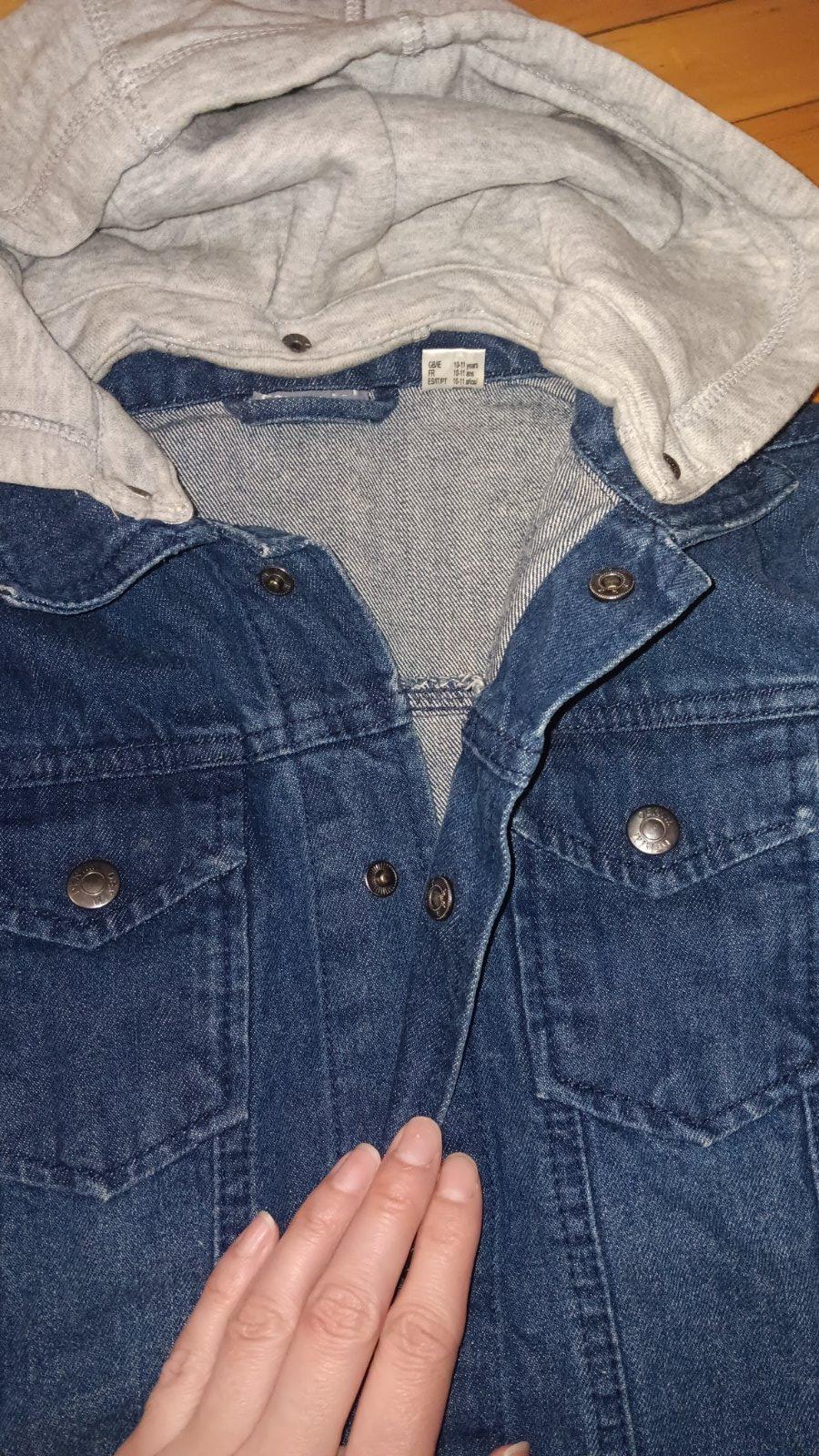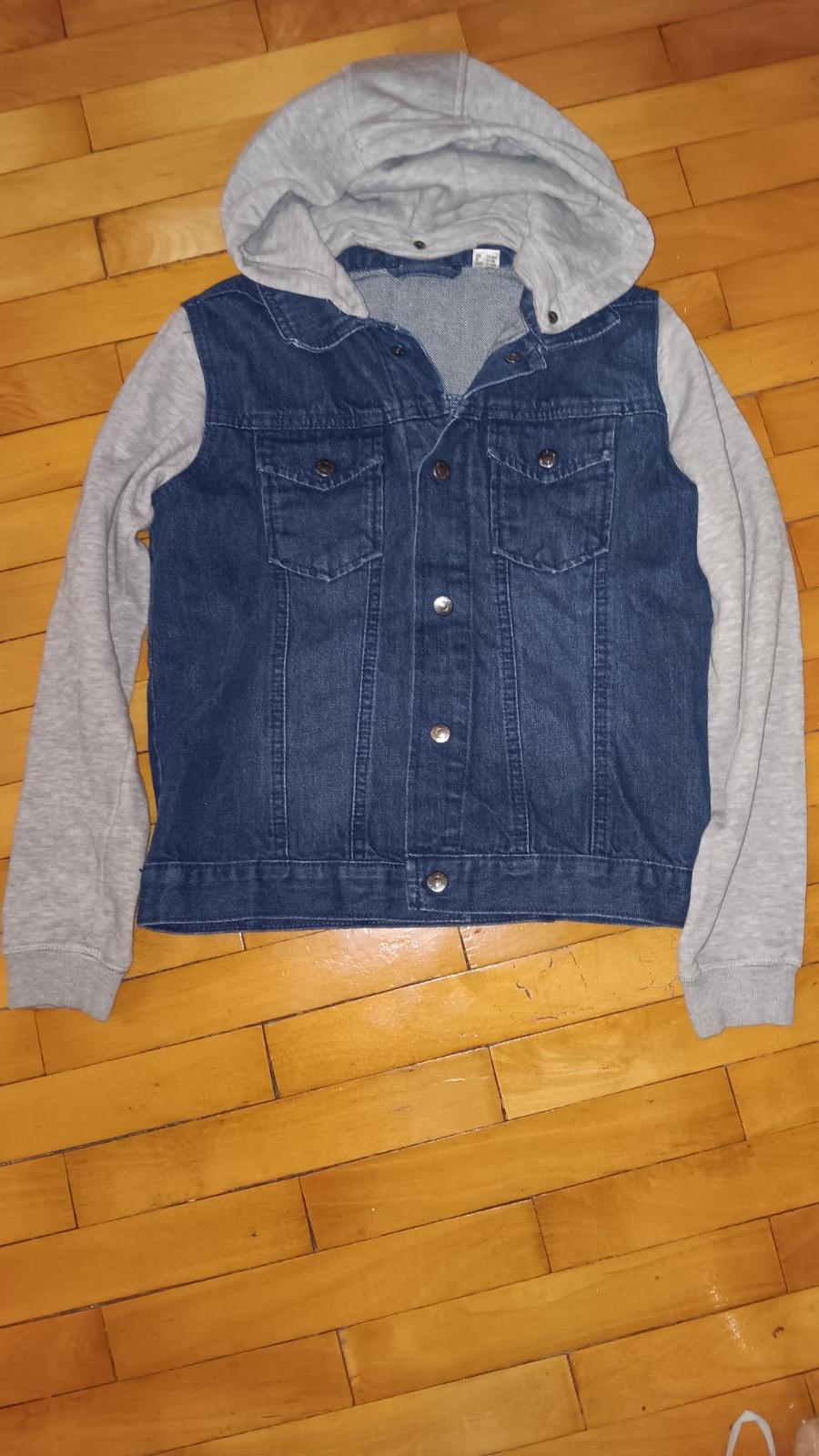 Predám rifľovú bundu s rukávmi z tričkoviny so zapínaním na gombíkové cvoky, vo výbornom stave, veľ. 146. Rozmery: bočná dĺžka 31cm, dĺžka vpredu 46 cm, šírka vpredu cez prsia 42cm, rukáv 61 cm + 1...