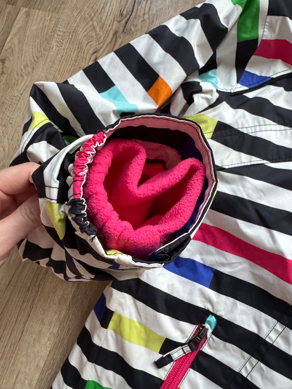Rozmer: dĺžka rukáva meraná od pleca 60cm, šírka cez hruď pri zapnutej bunde 51cm, dĺžka bundy 66cm meraná na chrbtovej strane od švíku na krku po spodok.