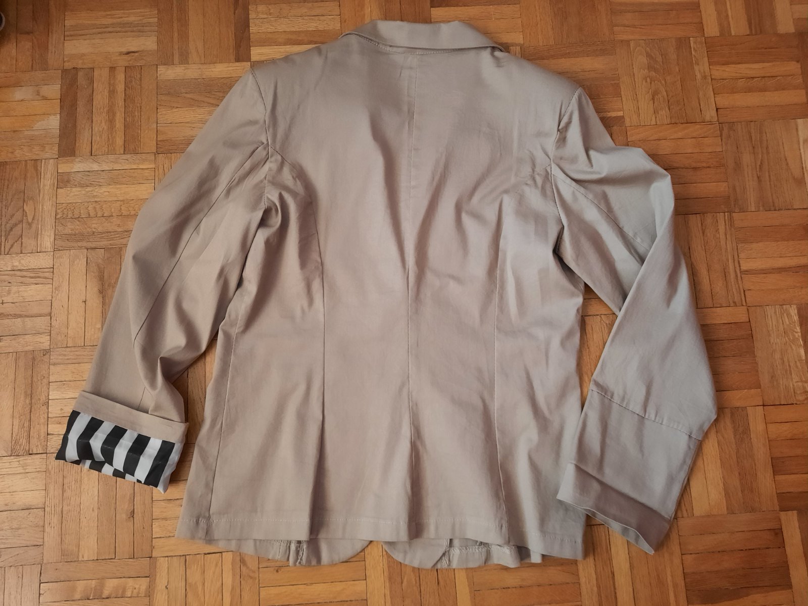 Super sako nepodšité so zapínaním na 1 gombík. Rukávy sa dajú vyhrnúť- vo vnútri sú podšité pásikavou látkou. V ramenách sú vypchávky. Farba je jemná kapučínová. Vačky vpredu sú len ozdobné. Veľmi dobrý stav.