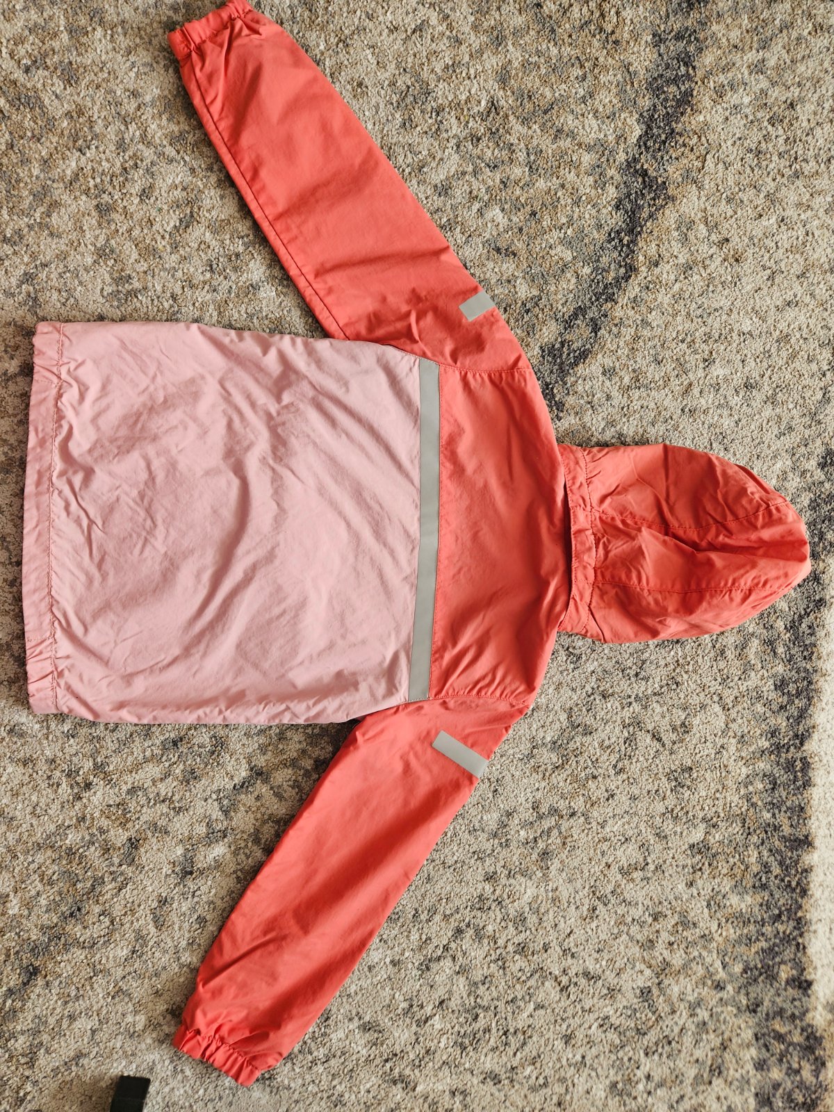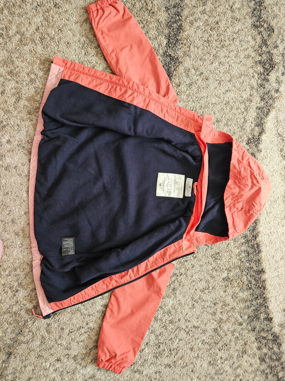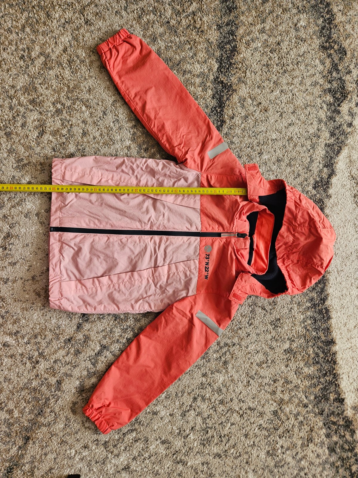 lososová farba, zapínanie na zips, vnútro podšité tenkou podšívkou, aj rukávy, kapucňa v golieri, šuštiaková veľkosť: 7 rokov materiál: polyester značka: F&D rozmery: dĺžka od pleca dole 52 cm, šír...