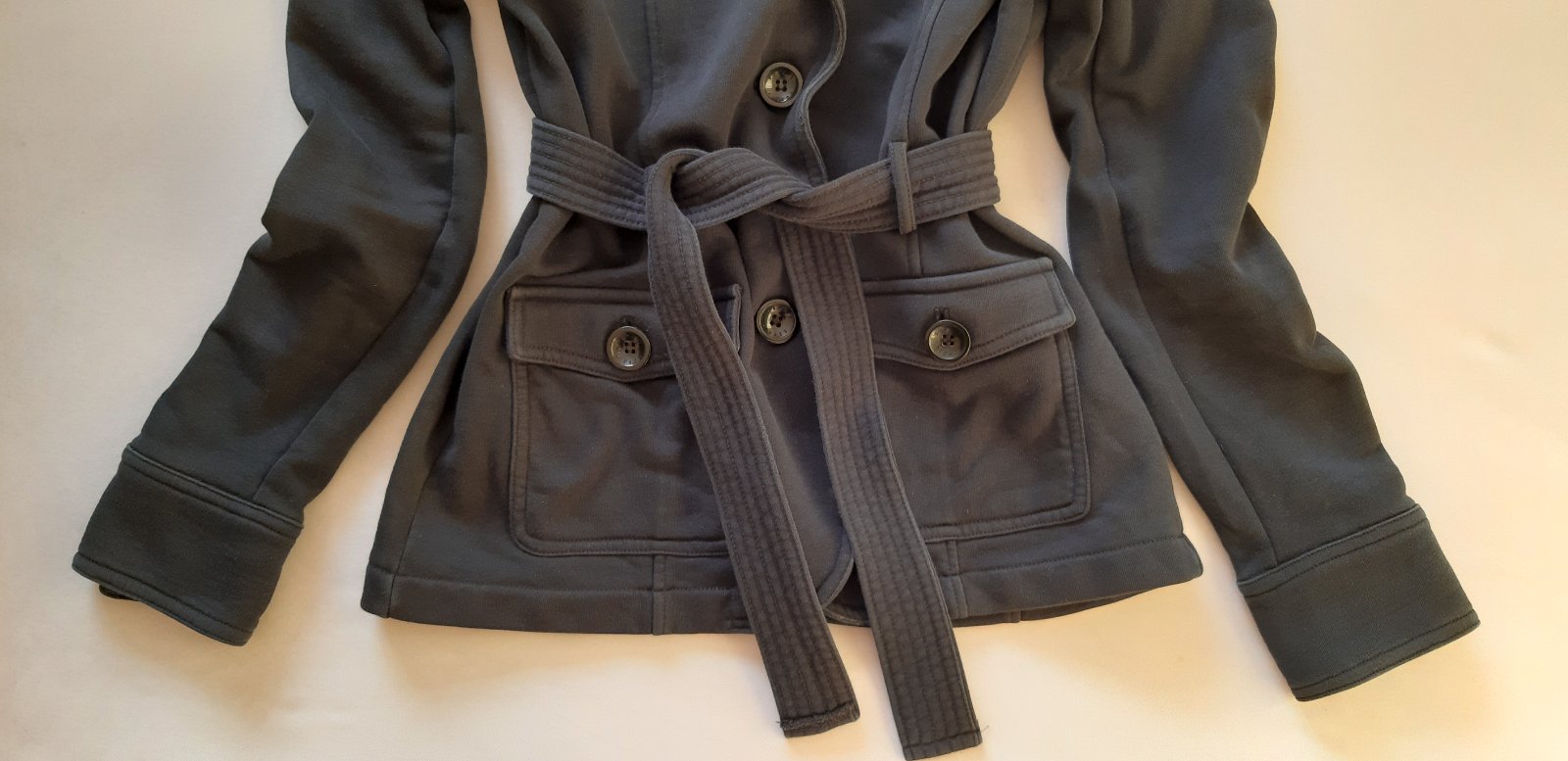 Kabatik na prechod s dvojradovym zapinanim akurat mu chyba jeden gombik na ramene inak bez poskodenia