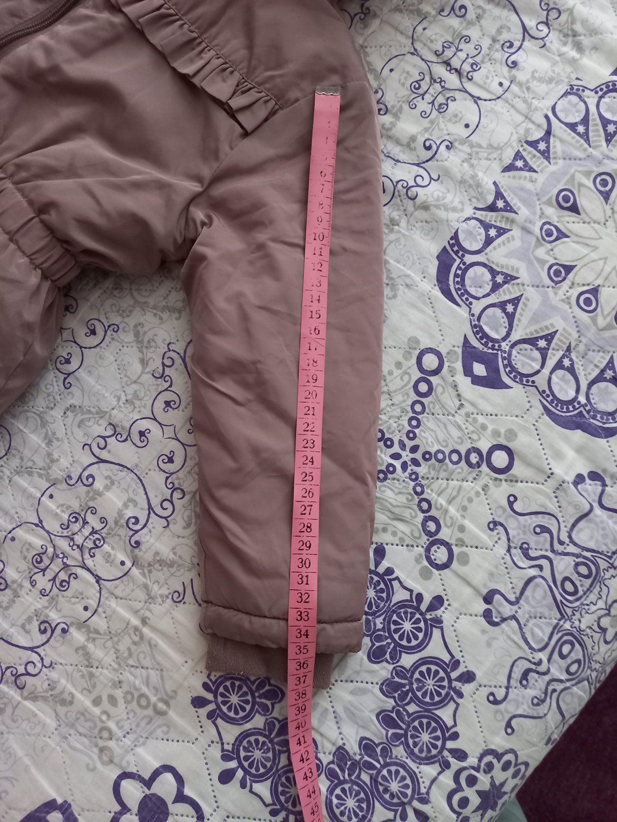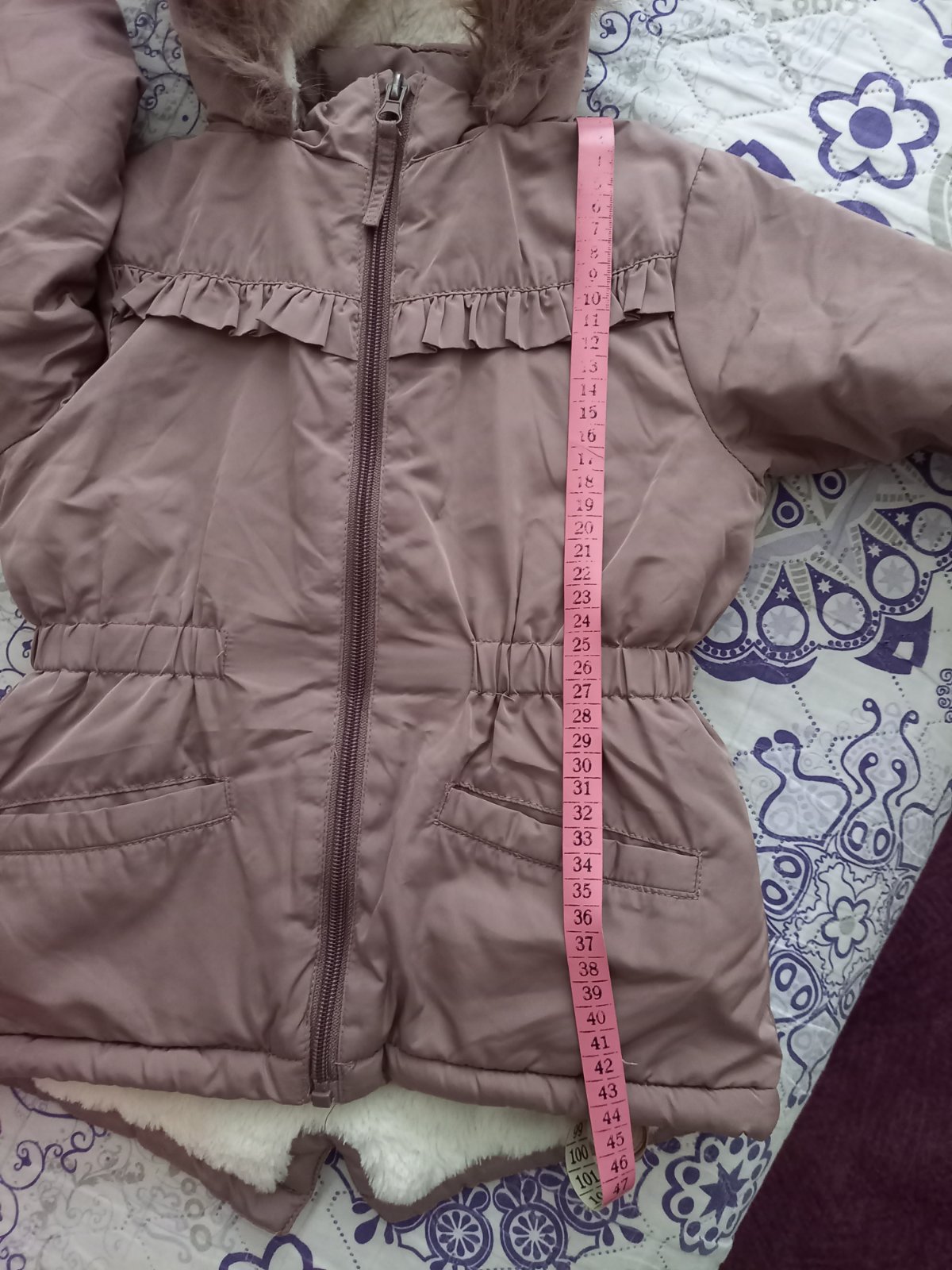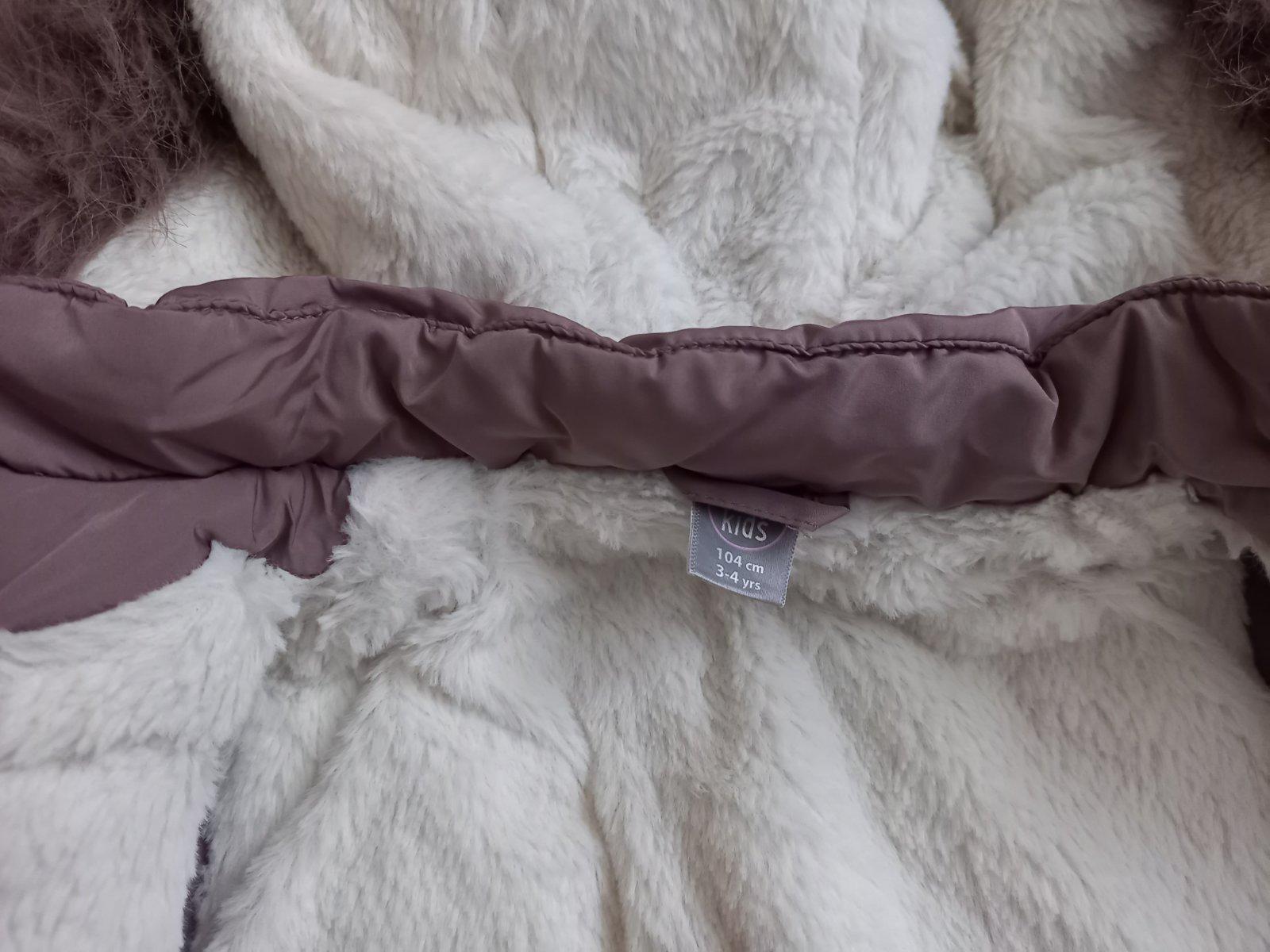 Dievčenská zimná bunda, veľkosť 104, značka F&F. Párkrát oblečená na striedačku s inými. Vidieť nosenie, nepoškodená. Rozmery sú na fotkách, zapínanie na zips a cvoky, na rukávoch patenty (viď foto...