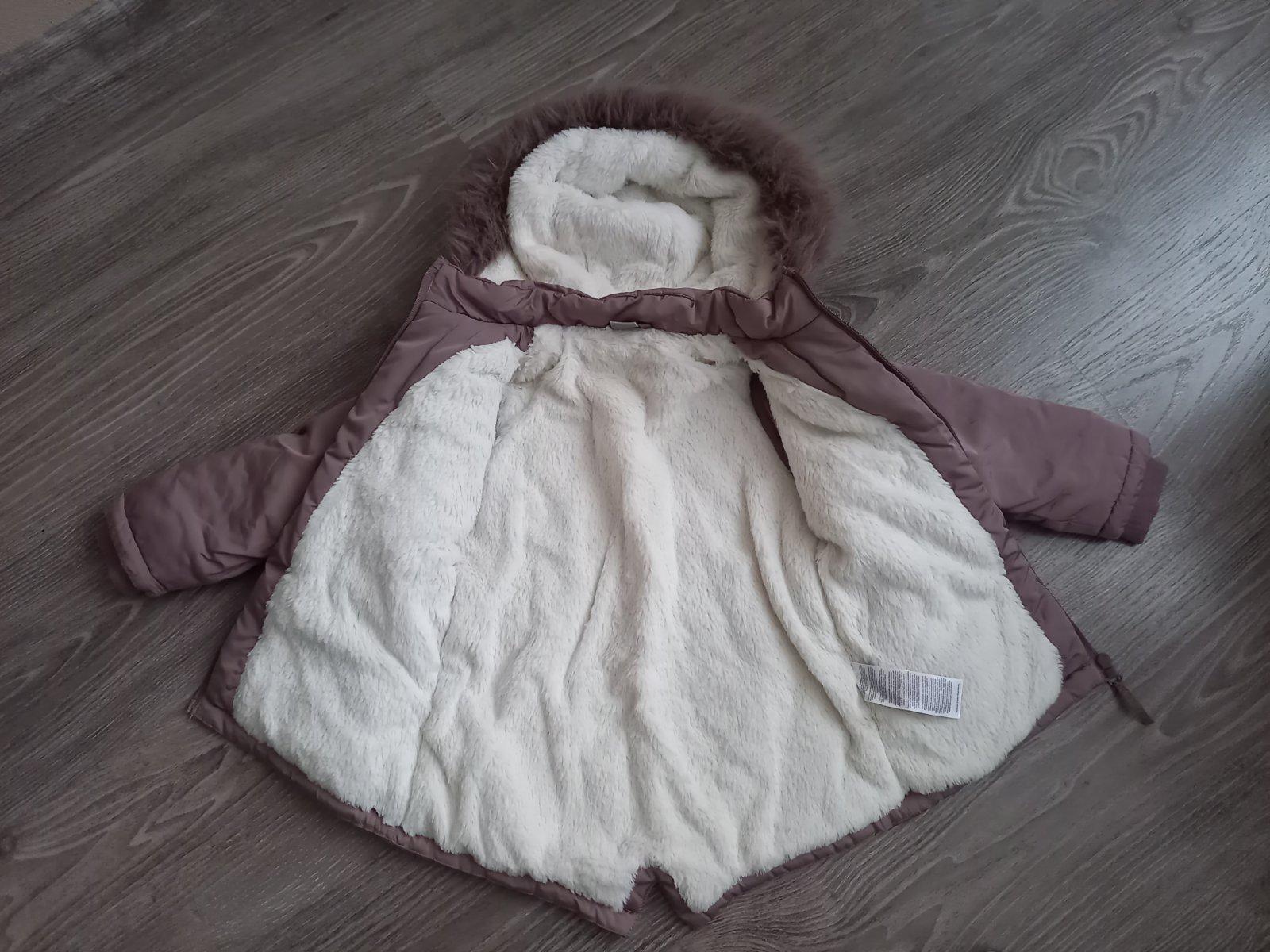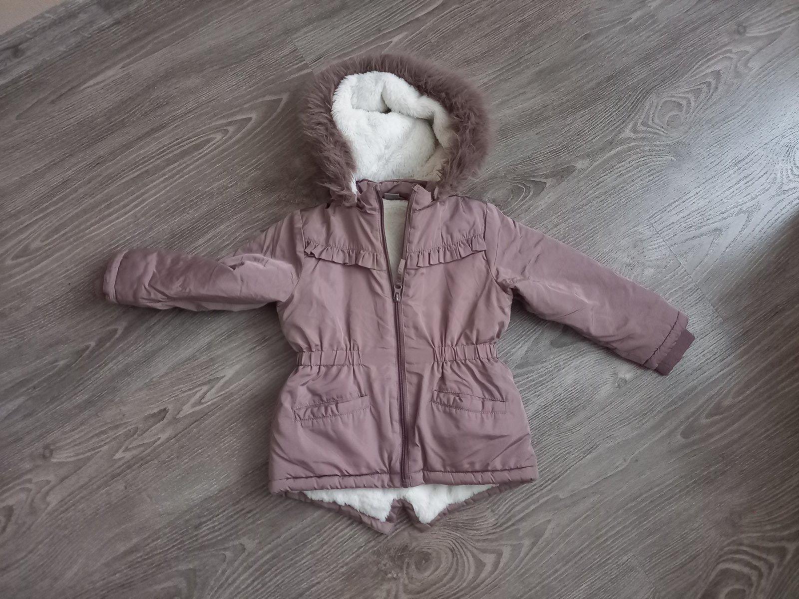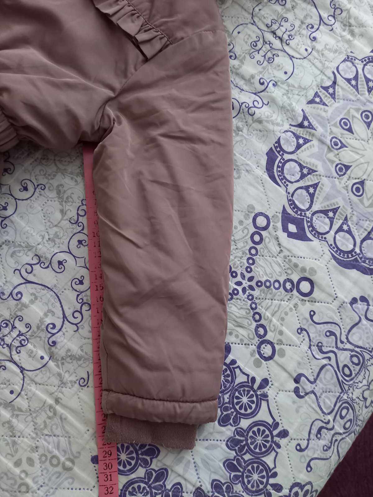Dievčenská zimná bunda, veľkosť 104, značka F&F. Párkrát oblečená na striedačku s inými. Vidieť nosenie, nepoškodená. Rozmery sú na fotkách, zapínanie na zips a cvoky, na rukávoch patenty (viď foto...