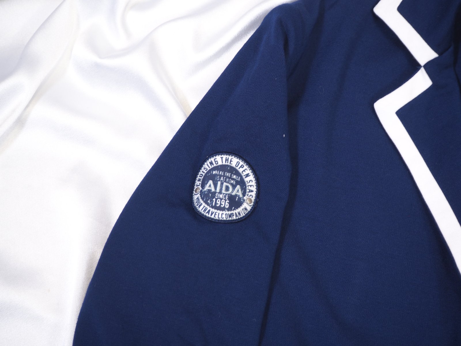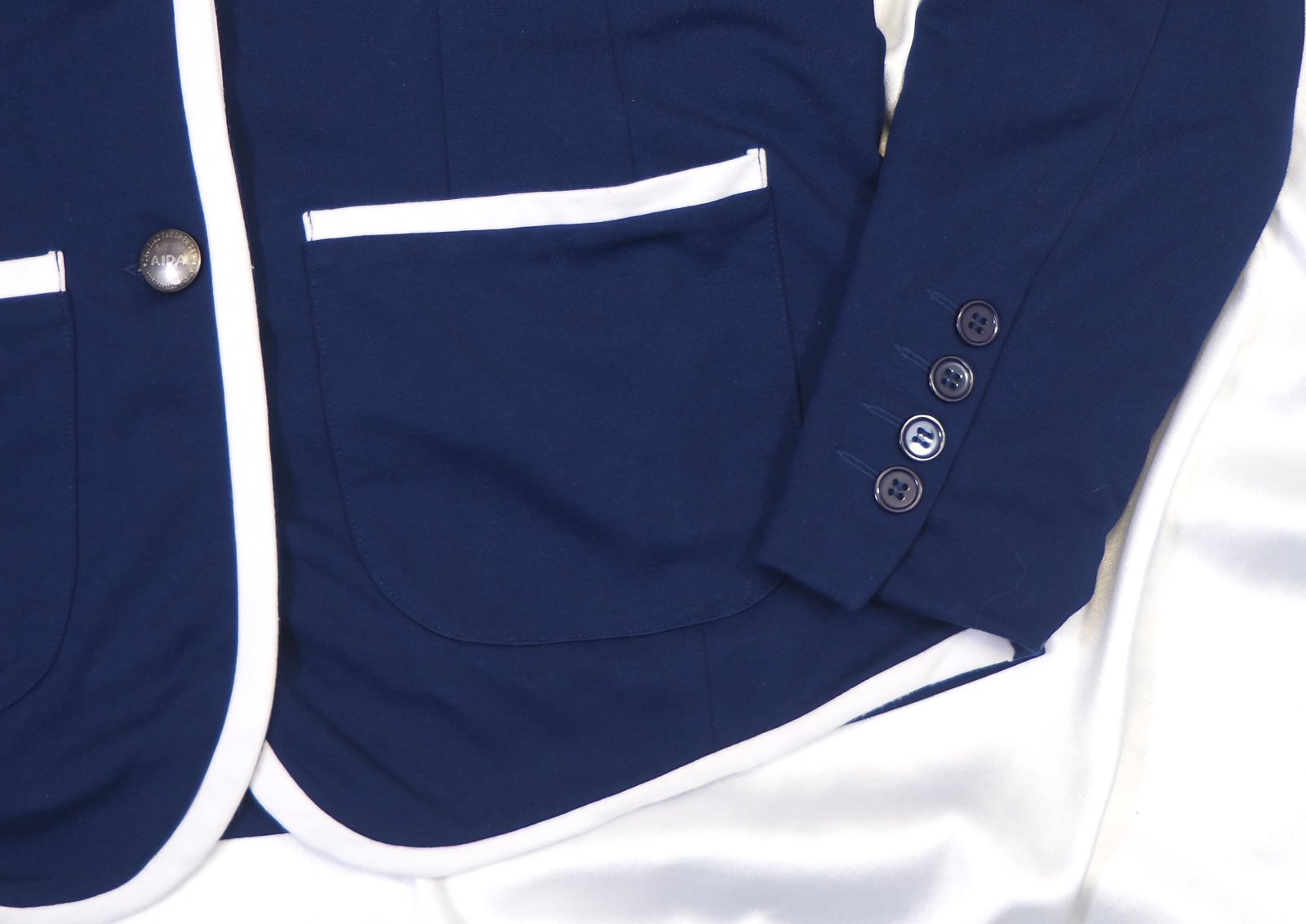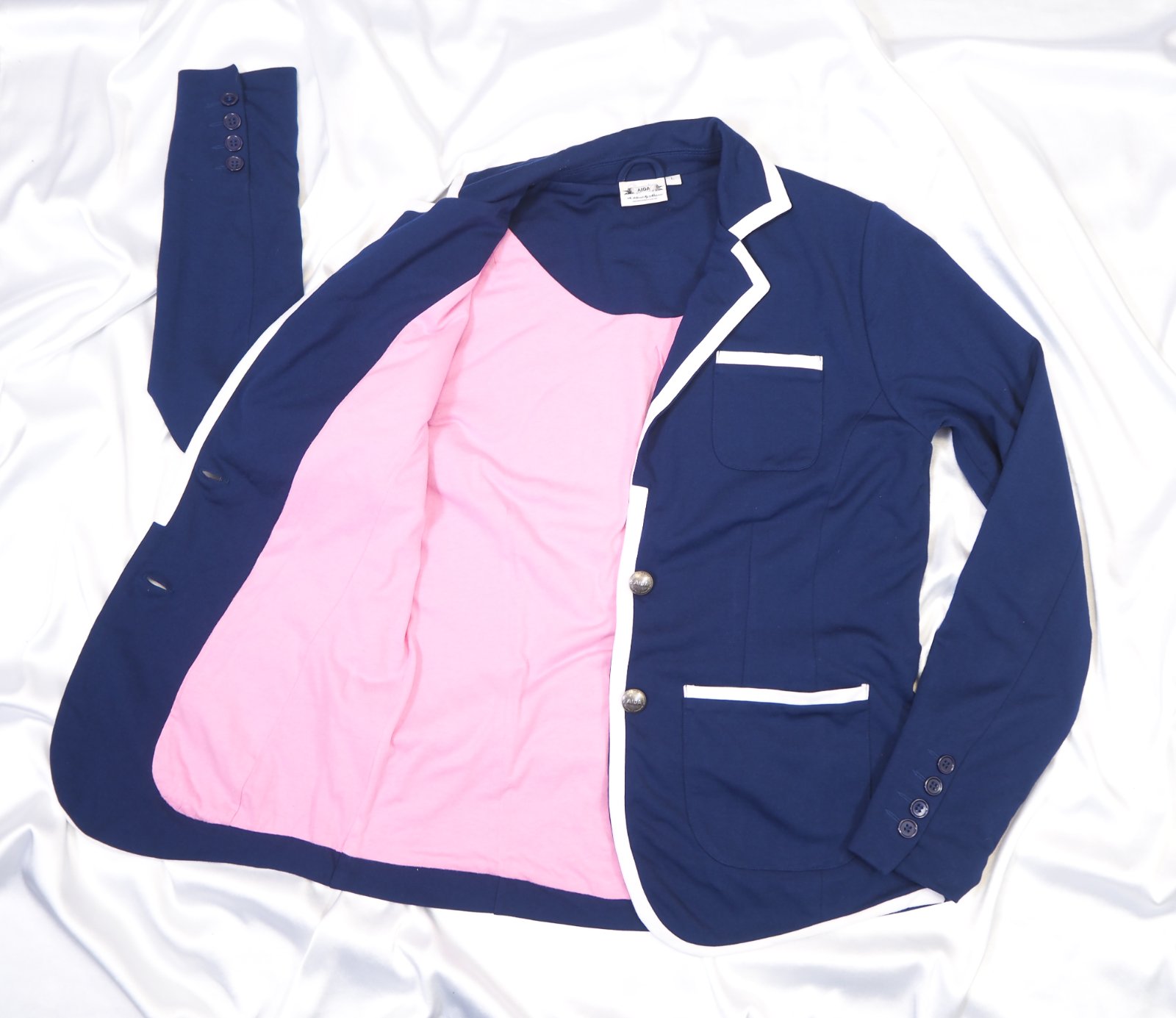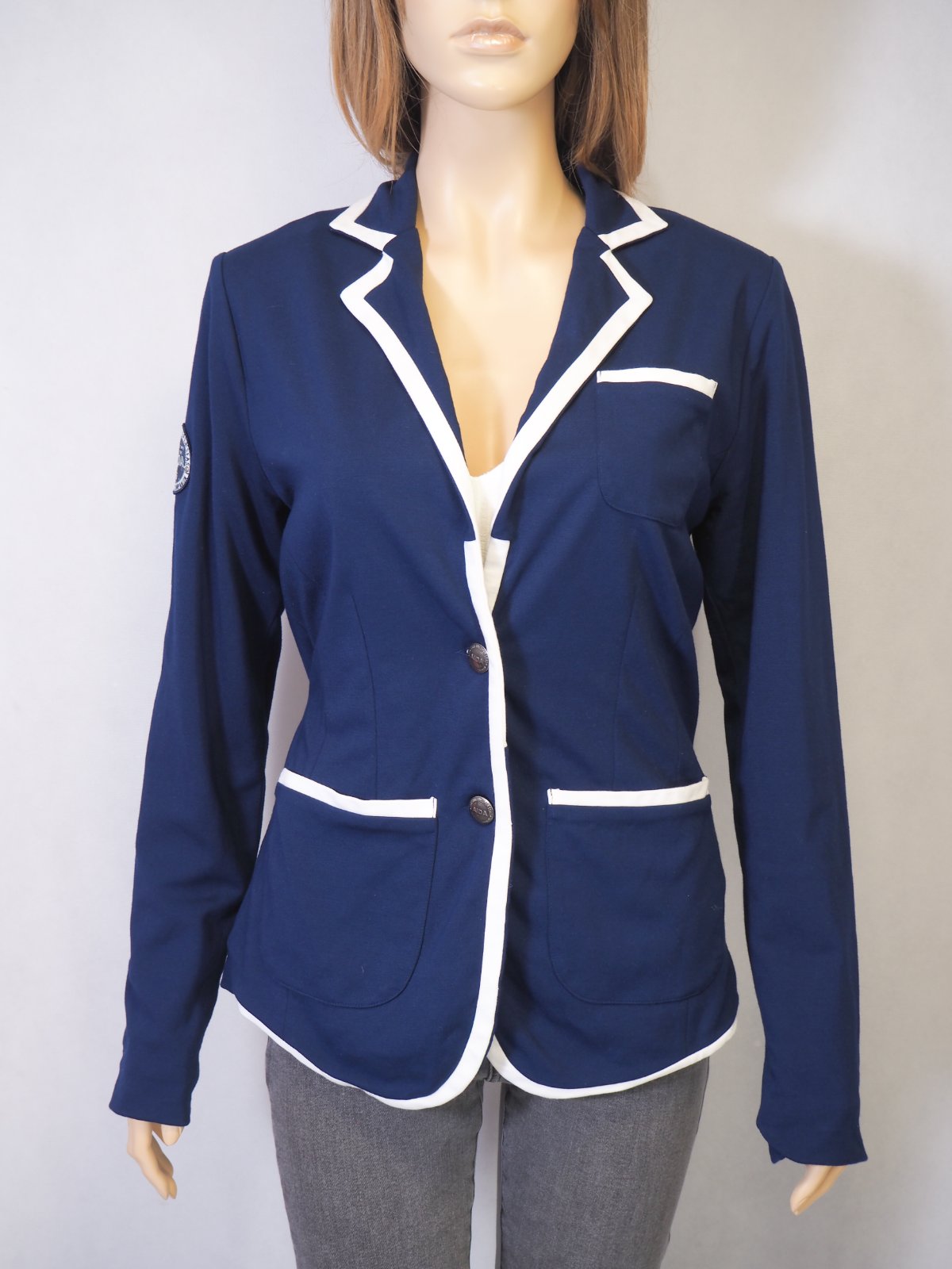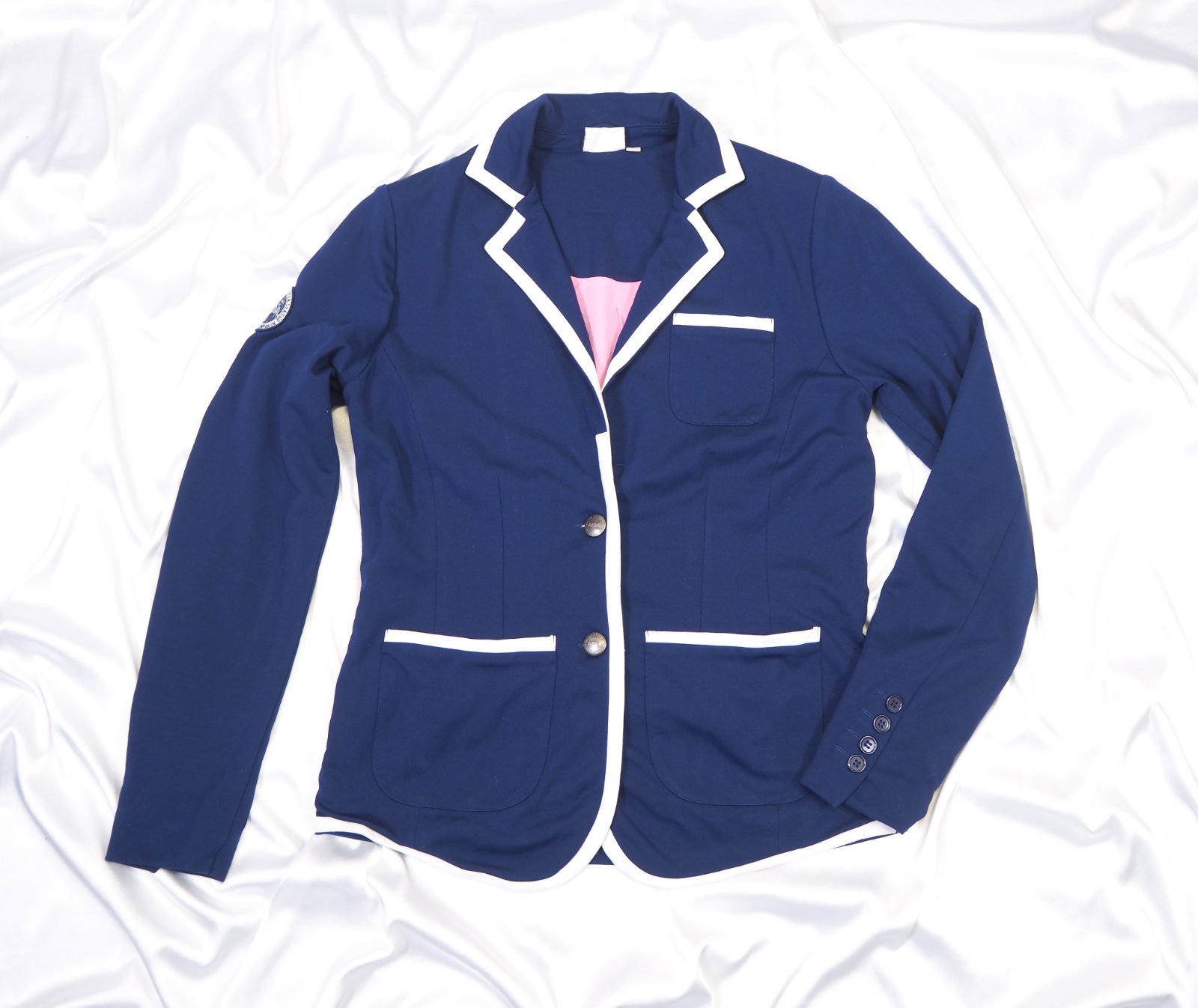 Luxusné úpletové sako tmavomodrej farby s bielym lemovaním, ružová podšívka, vypracované do detailov, na rukáve nášivka značky, materiál 67% umelý hodváb, 29% polyester, 4% elastan, ako nové.