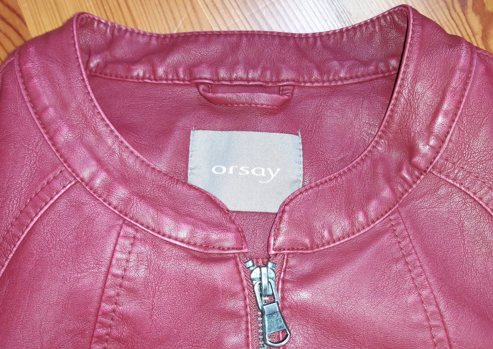 Koženková (nie kožená) bordová bunda so zapínaním na zips a dvomi prednými vreckami na zips.