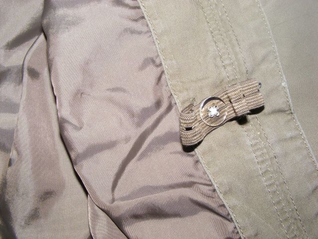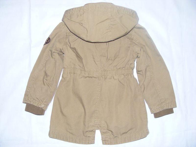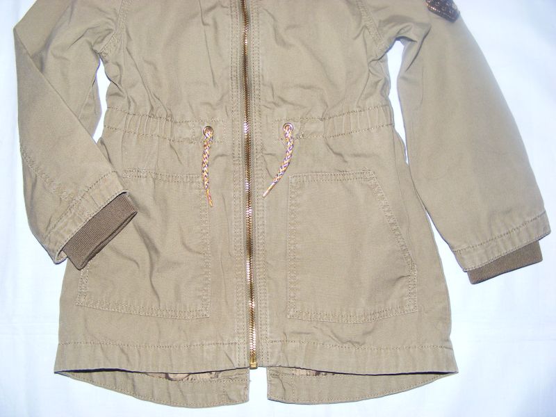 Jarná - prechodná bundička zn. H&M, zapínanie na zips, podšitá, funkčné bočné vrecká, kapucka odnímateľná na patenty, zvnútra sa dá regul. gumou regulovať šírka v páse, na rukávoch zvnútra vnútorný patent. Materiál 100% bavlna.