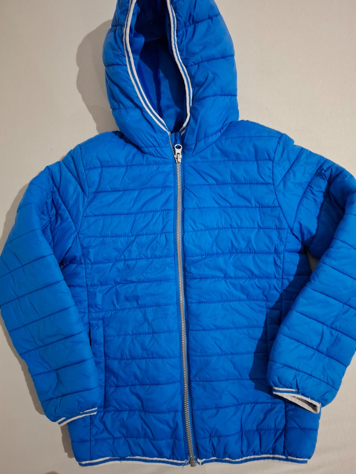 Prechodná bunda, štítok s veľkosťou odstrihnuty, ale myslím,že bola 122/128, rozmery sú na fotkách, na patentoch sa nájdu zmolky a vzadu na chrbáte zasita dierka, pozri na fotkách