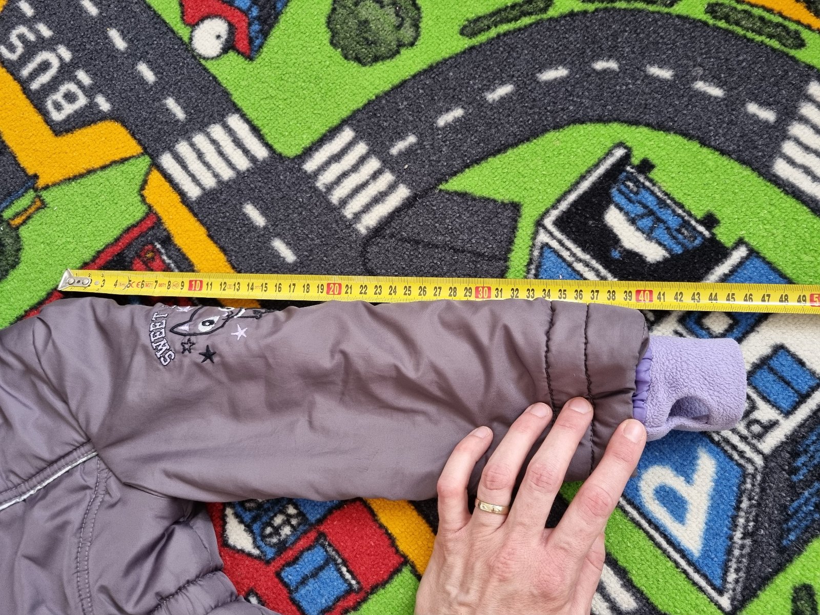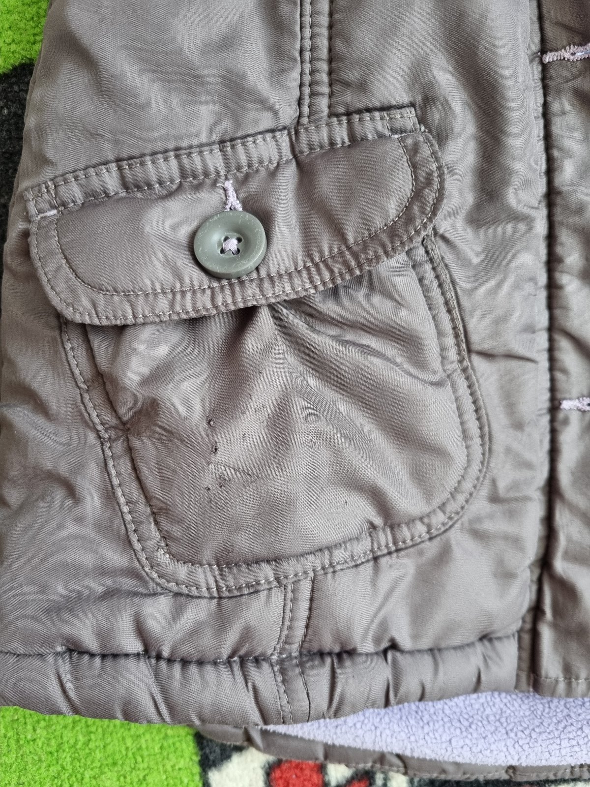 Zachovalý teplý kabátik pod zadok, zips funguje super, malá vada je šuchnutie na prednom vačku.