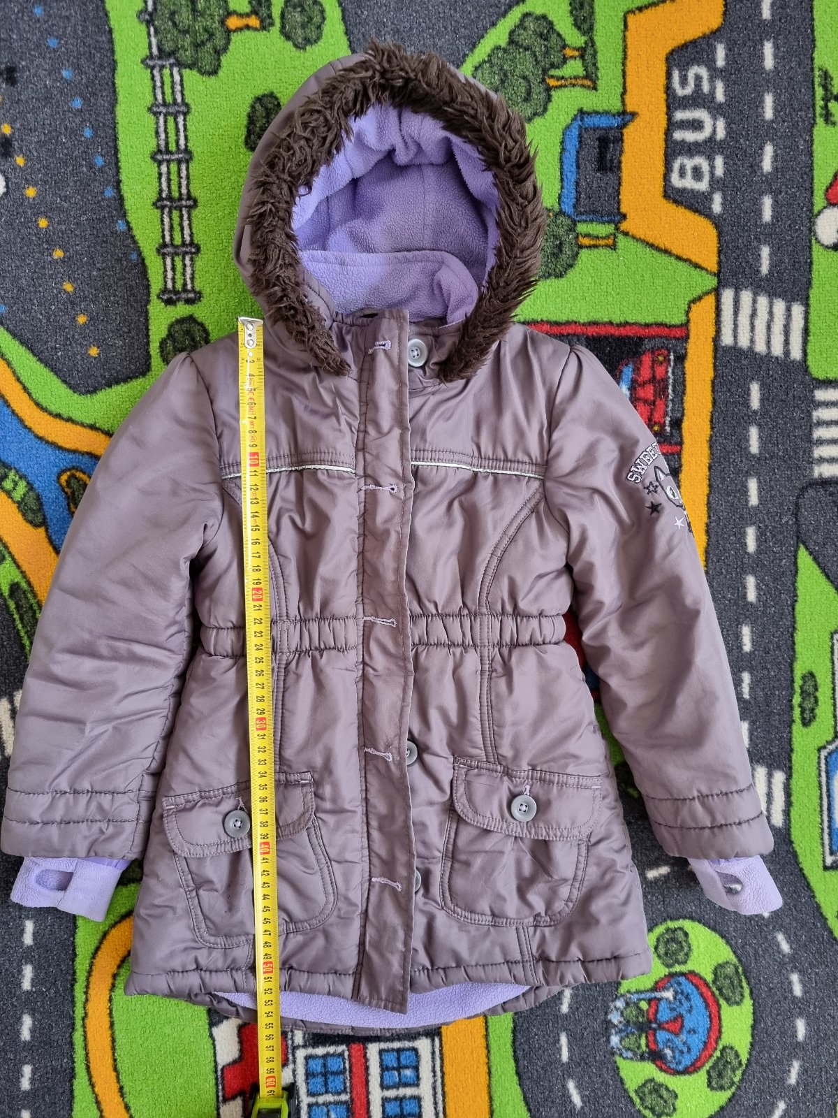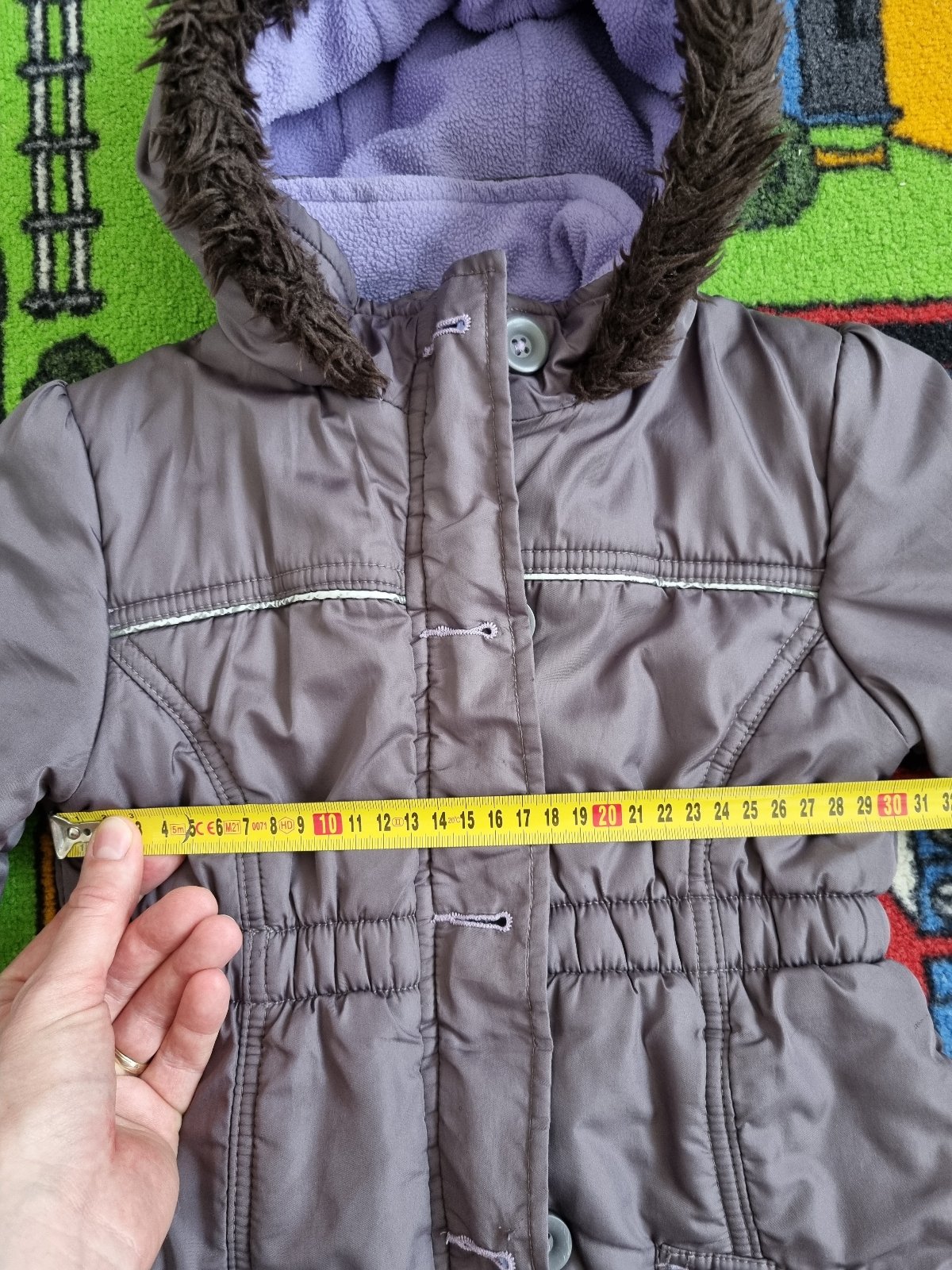 Zimna vetrovka,v pase stiahnuta,vzadu predlzena,kapuca s kozusinkou,vo vybornom stave. Akurat na poklope pre zips je malinko odrana latka,vid posledna foto