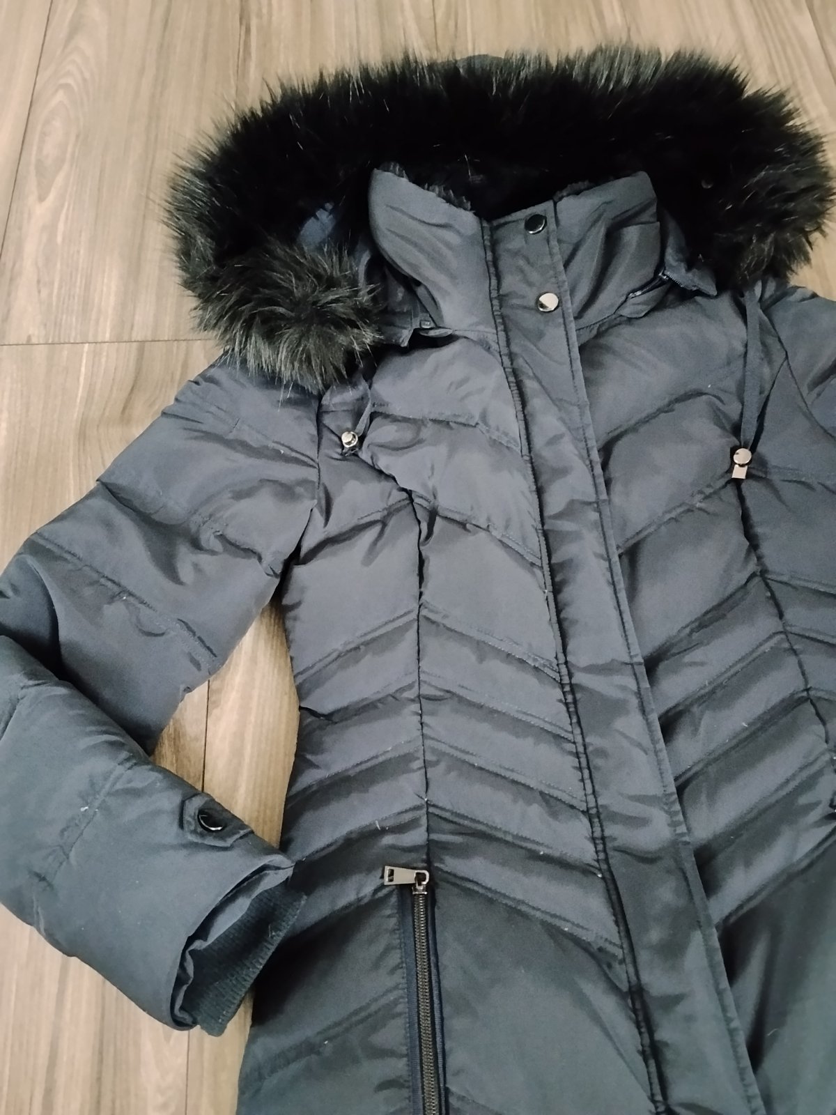 Tmavomodrá páperova bunda s kapucňou a bohatou kožušinou. Krásny ženský strih . Je zašitá viď foto a od nova vypadáva perie. Symbolickú cenu preto ponúkam.