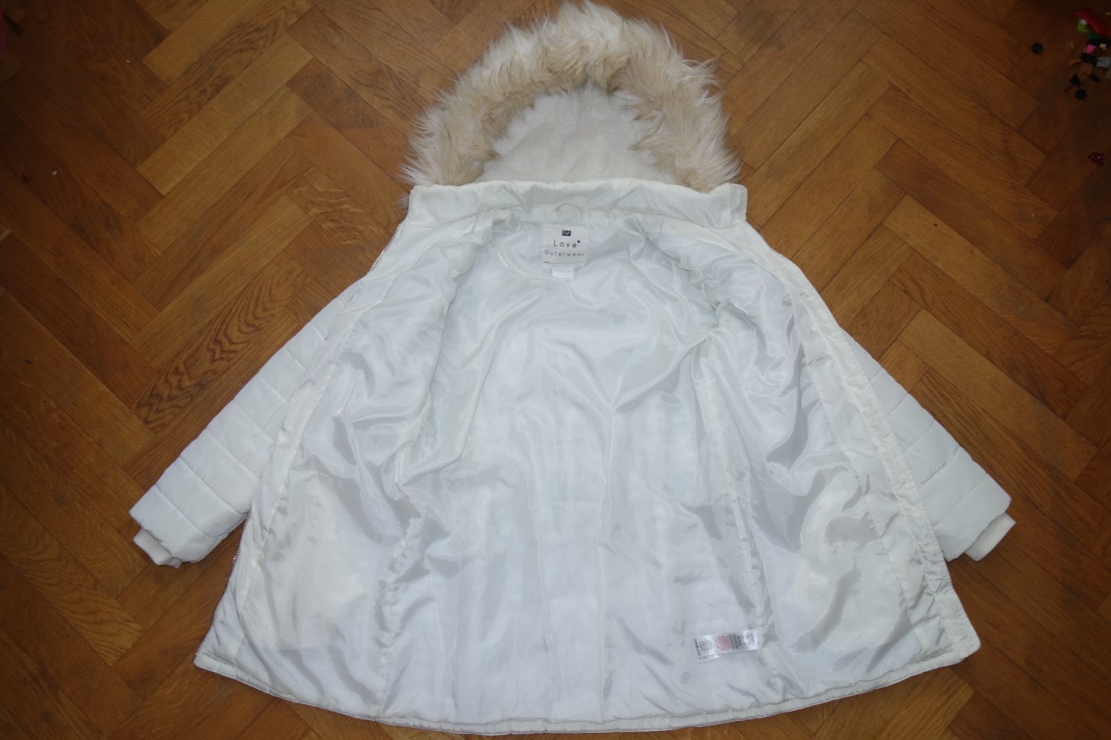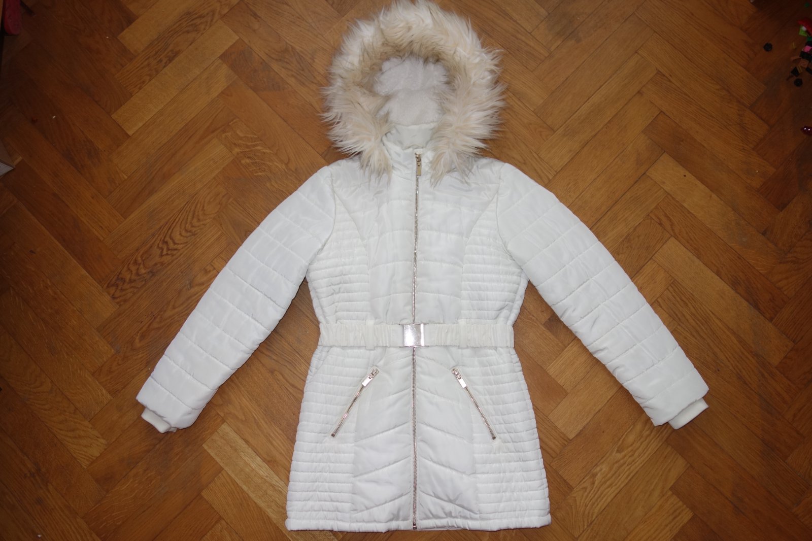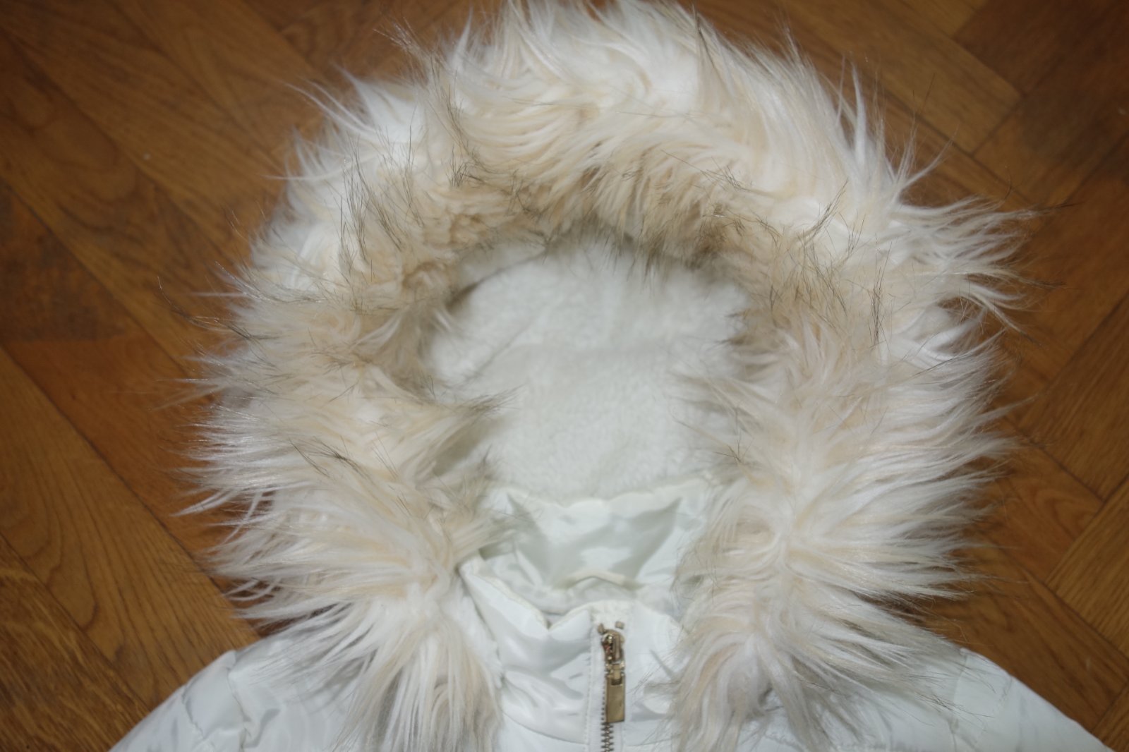 Prekrásna bunda maslovej farby so zlatými doplnkami. Teplá s teplou kožušinovou kapucňou.