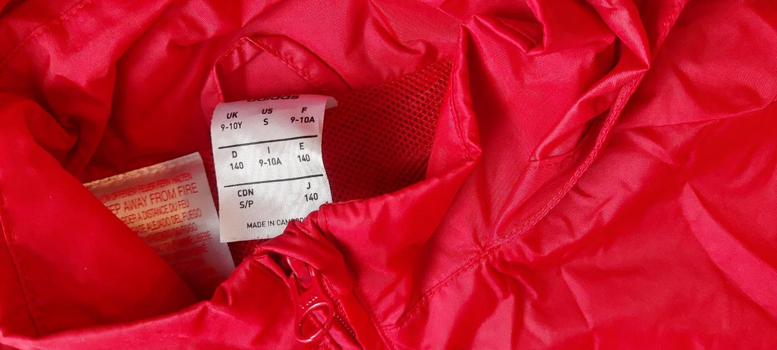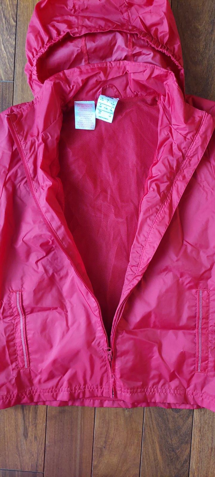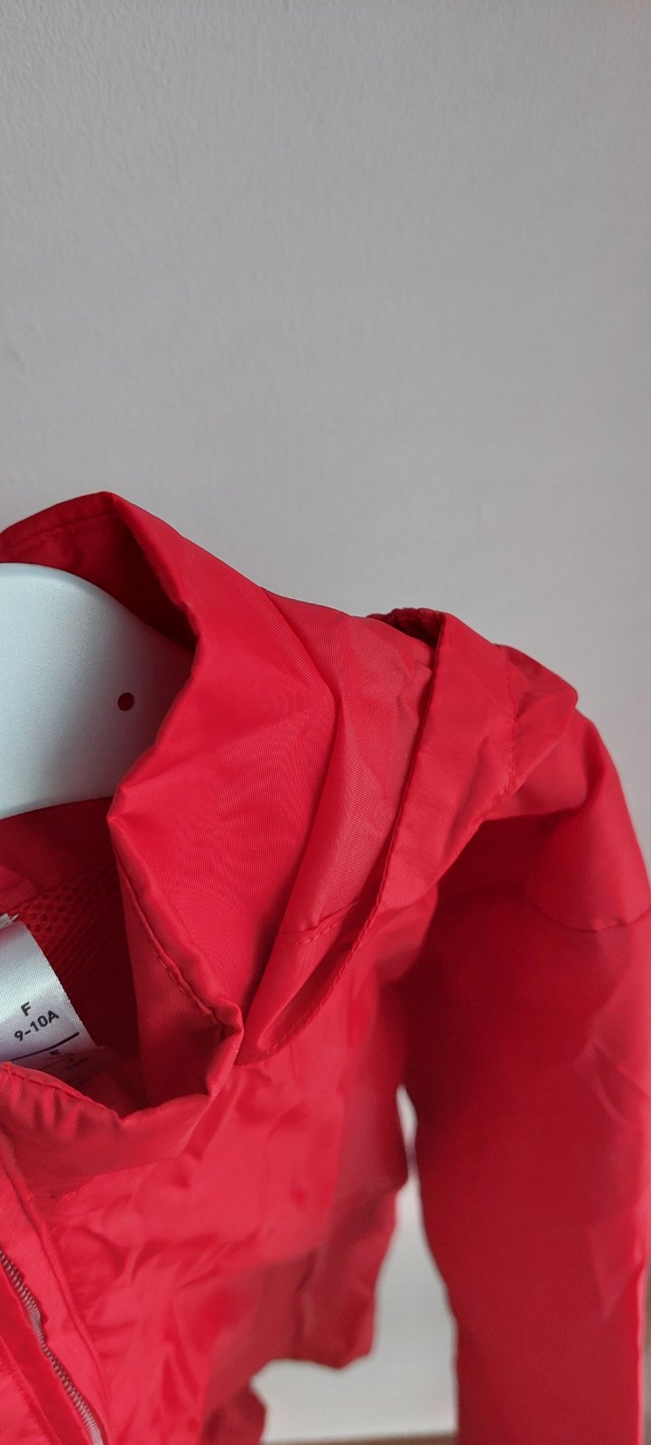 Červená šušťačka, má bočné vrecká, podšitá sieťovinou, reálna farba je vidieť na tých detailných fotkách, minimálne nosená, dcéra ju mala na tréningy pre prípad mrholenia, takmer ako nová.
