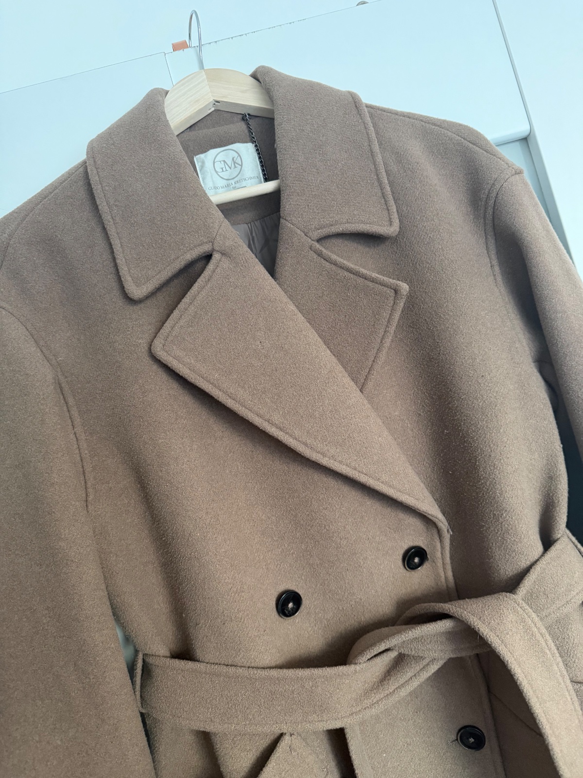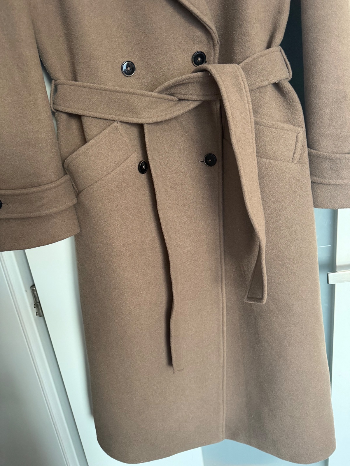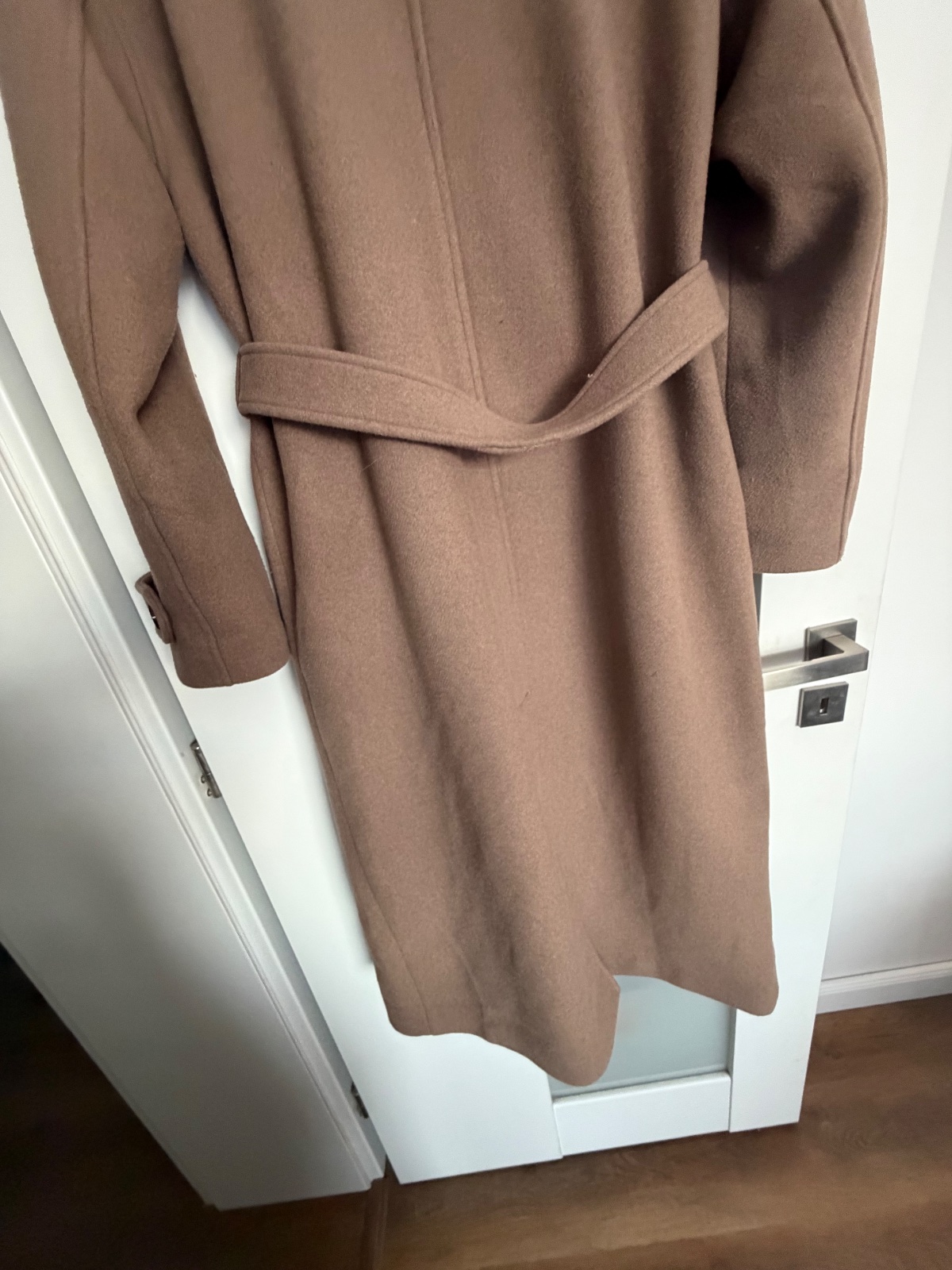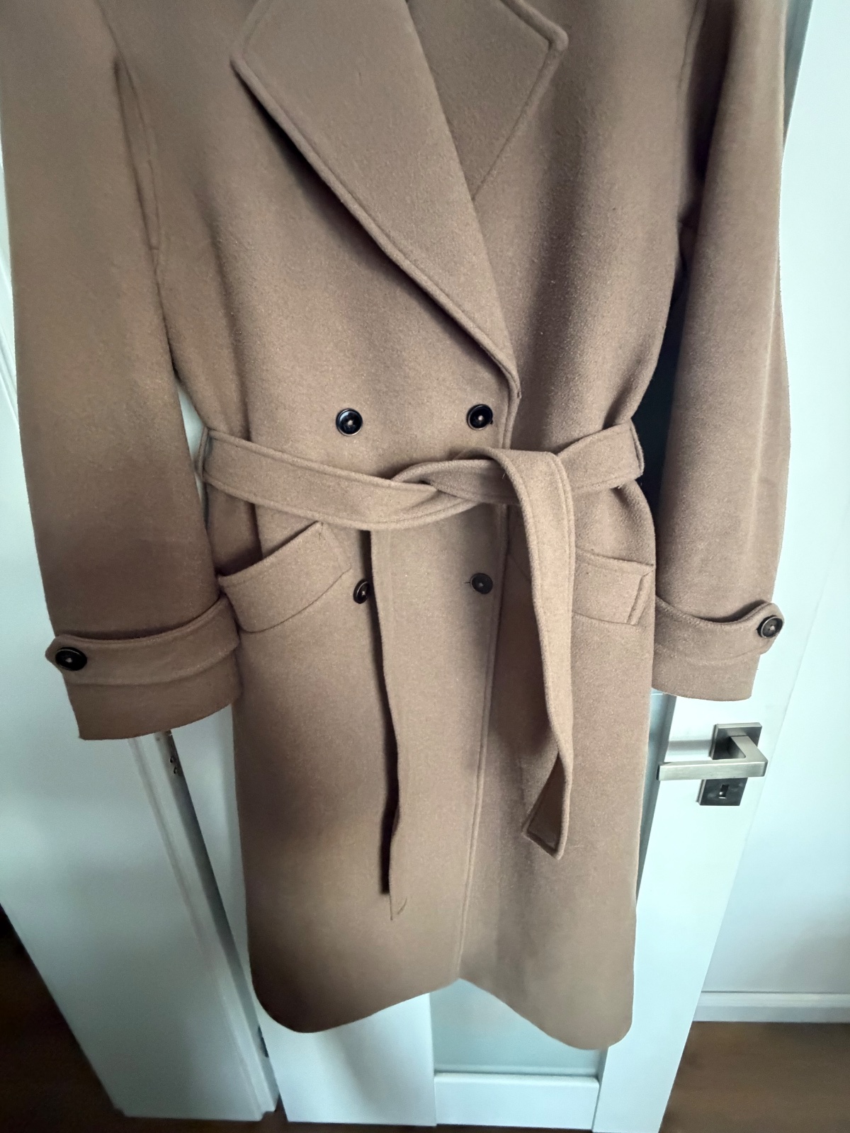 Top stav, oblečený pár krát, trendy farba taupe (presne ako na titulnej fotke), ťažko sa fotí, obsah vlny, gombíky a uväzovanie, zn.Guido Maria Kretschmer for About you, PC:229€, dl: 122, š.52, rukáv 20+56