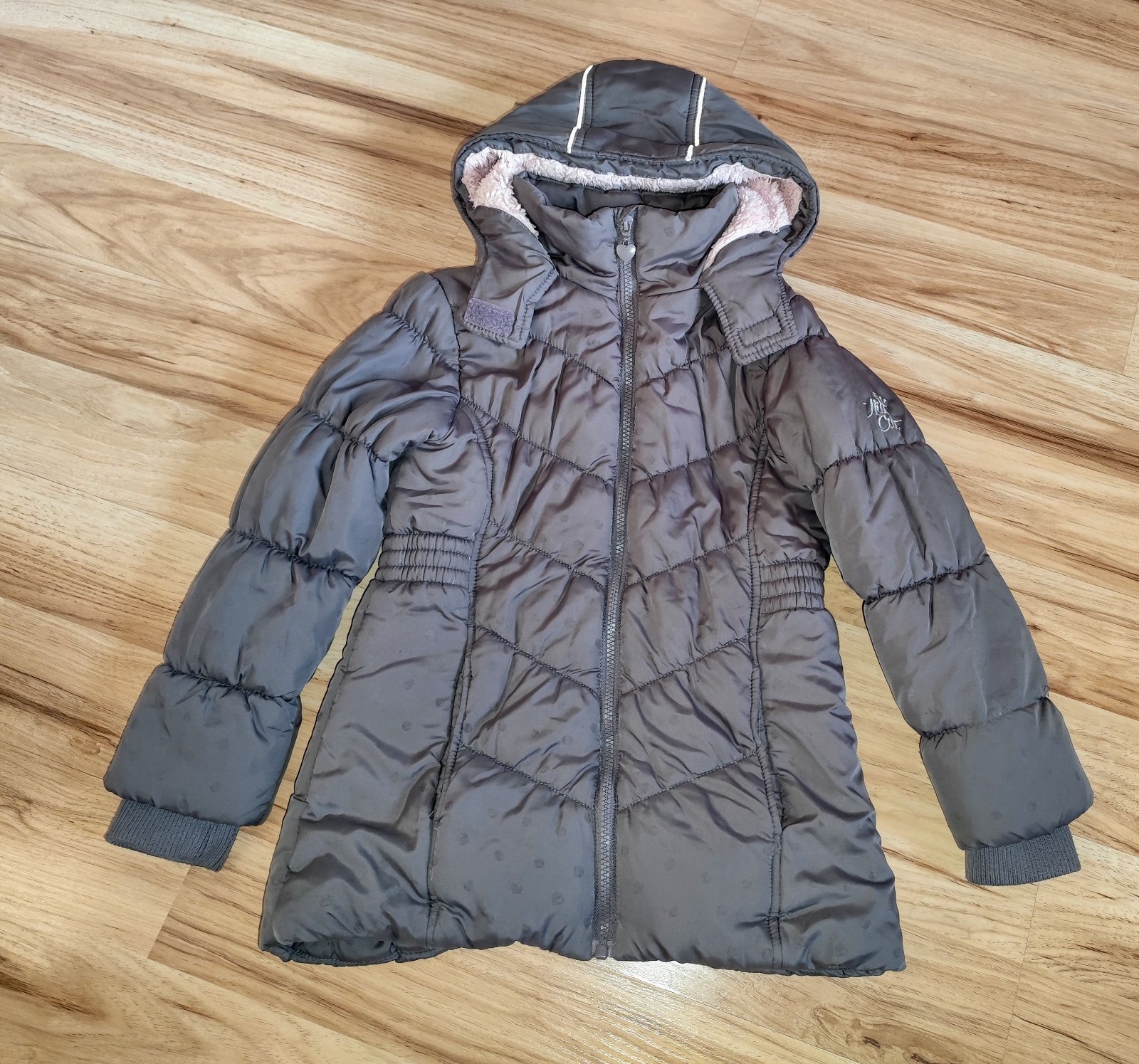 Zimná bunda/parka, oteplena, zipsy funkčné, na poslednej fotke vidieť dve drobné dieročky. Sedí na 7/8 rokov veľkosť 128.