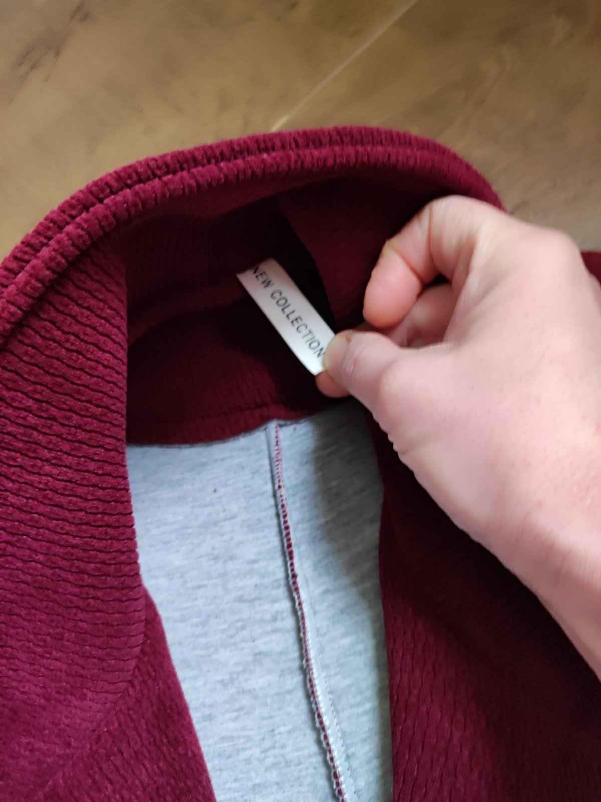 Kabát v bordovej farbe v štýlovom strihu typu pončo alebo cape. Kabát má voľný, plášťový strih s rozšírenými rukávmi a zapína sa pri krku na jeden veľký gombík. V páse je stiahnutý úzkym čiernym op...