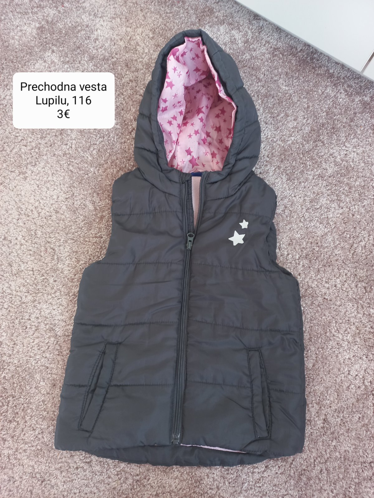 Prekrásna vesta v bezchybnom stave na zips. Vpredu 2 vrecká, vnútri 1menšie vrecko; bez kapucne. Dĺžka 46 CM.