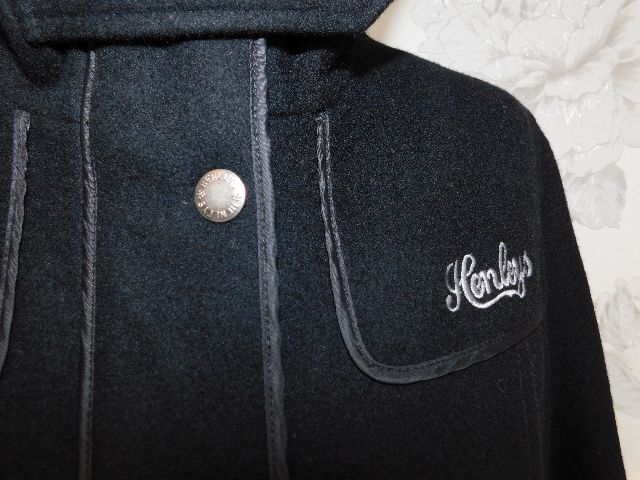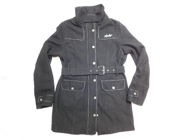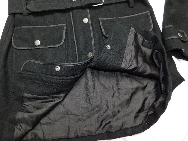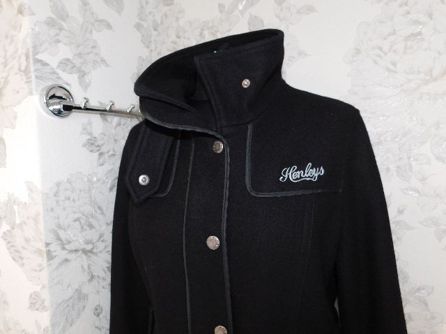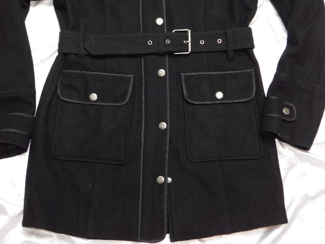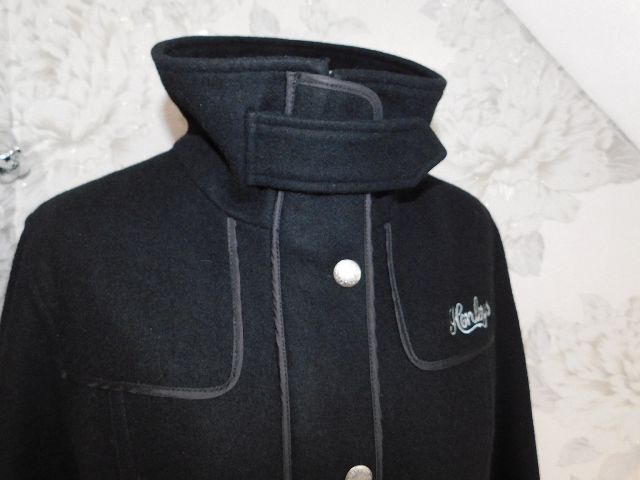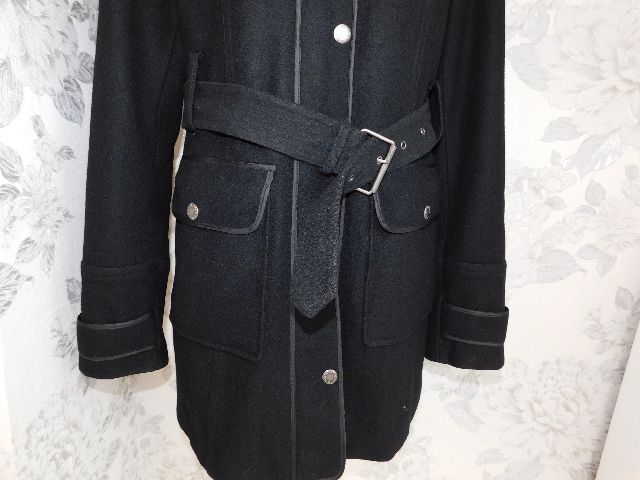 Damsky trendy vlneny kabatik,čiernej farby,s podsivkou,vhodny na miernu zimu,zapinanie na zips prekryte gombikovou legou,2 vrecka s patkami ,putka na opasok.57%wool,43%viskoza.super stav. pp2