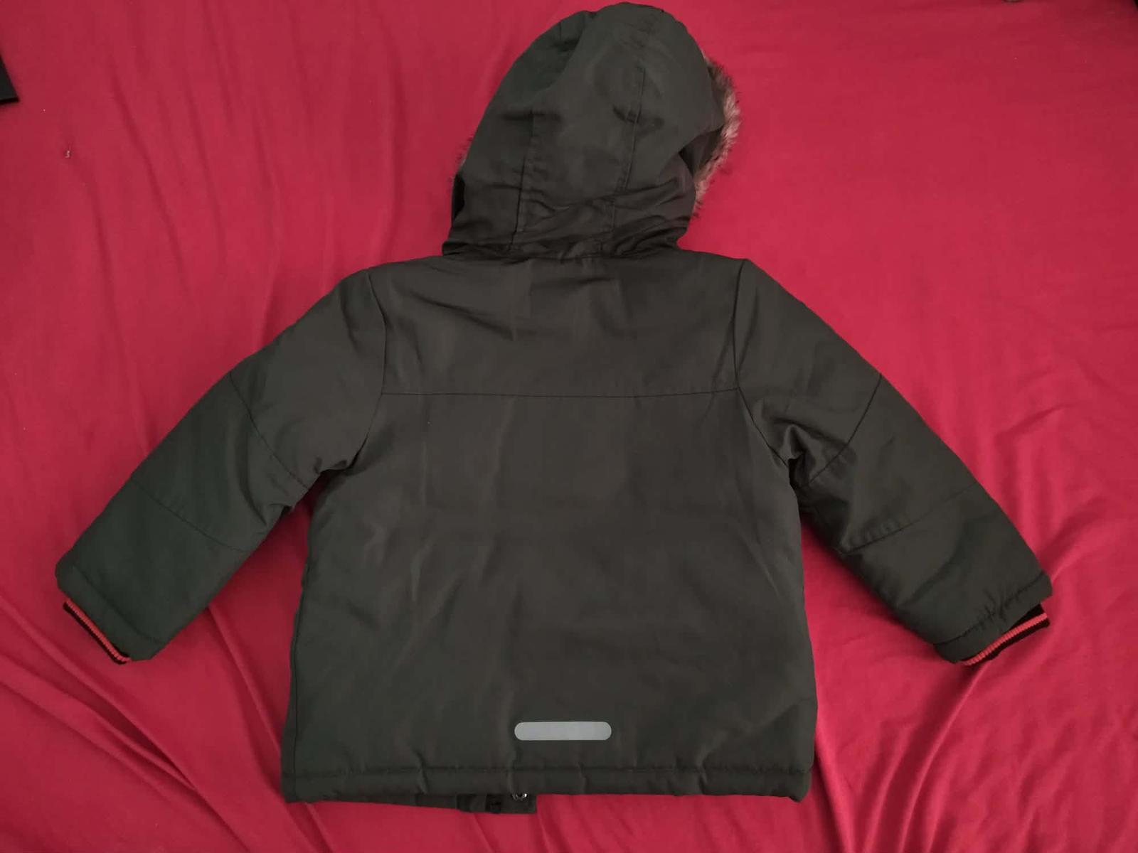 Nosenie vidno na zatepleni, inak bez poškodení. Veľkosť písaná 3-4 roky, rozmery :šírka 38cm,dĺžka 49cm,rukav od krku 39cm+2cm patent