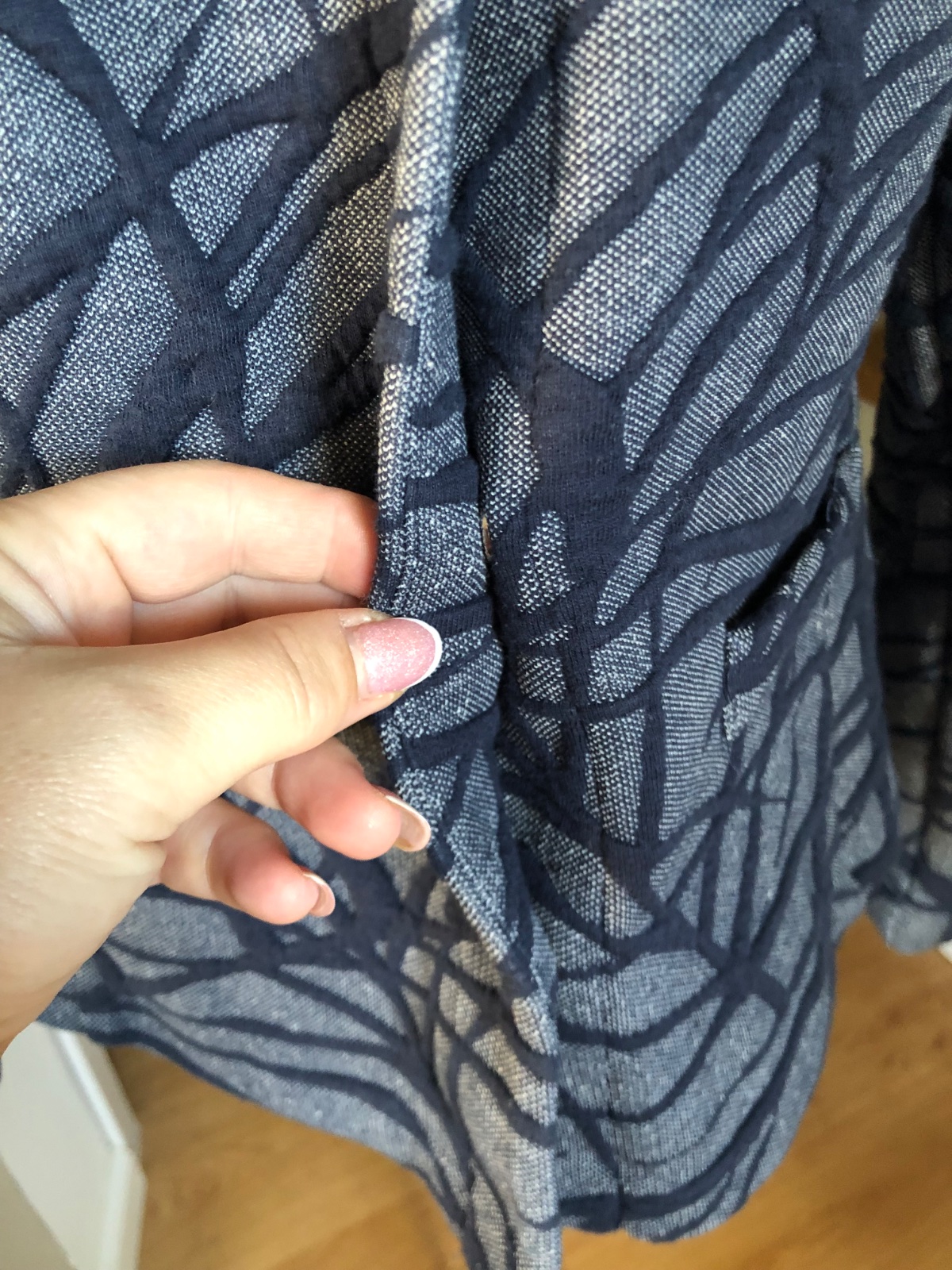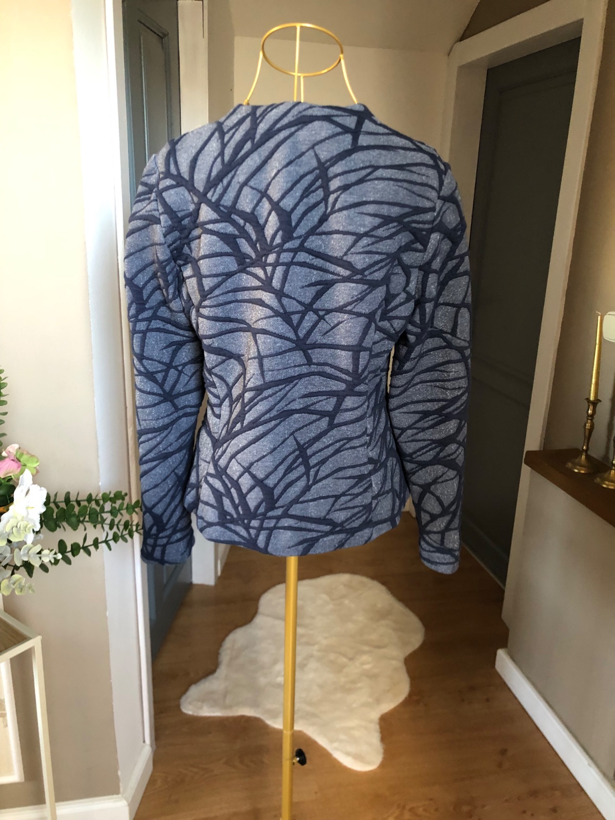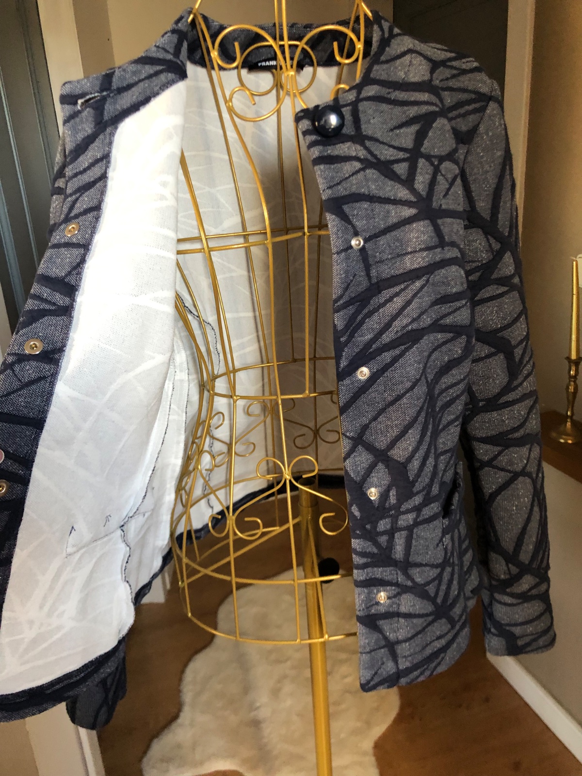 Kvalitné modré sako s tmavomodrý 3d vzorom, zapínanie na cvočky a gombík pri krku, bez podšívky, super stav.