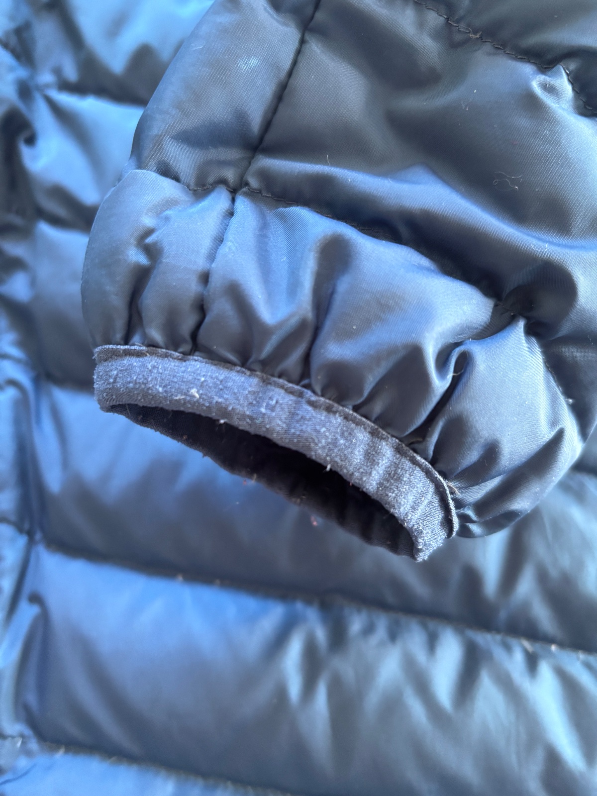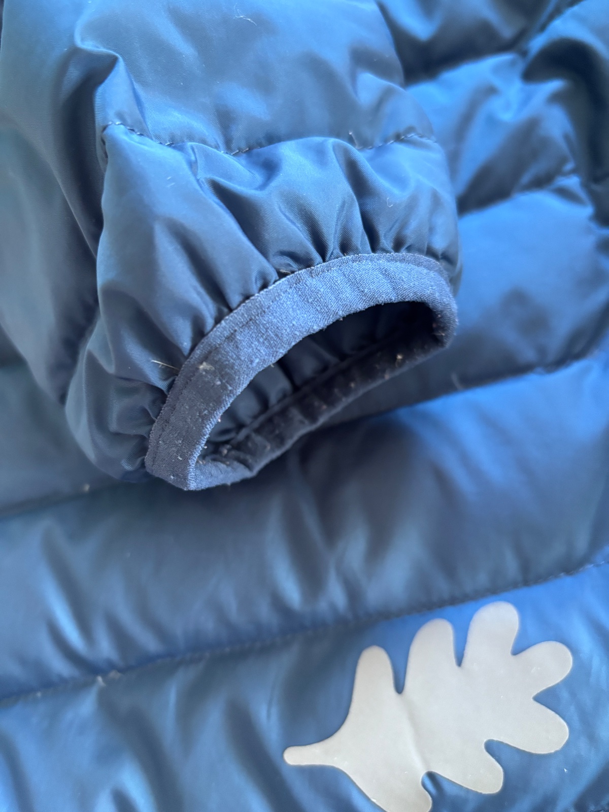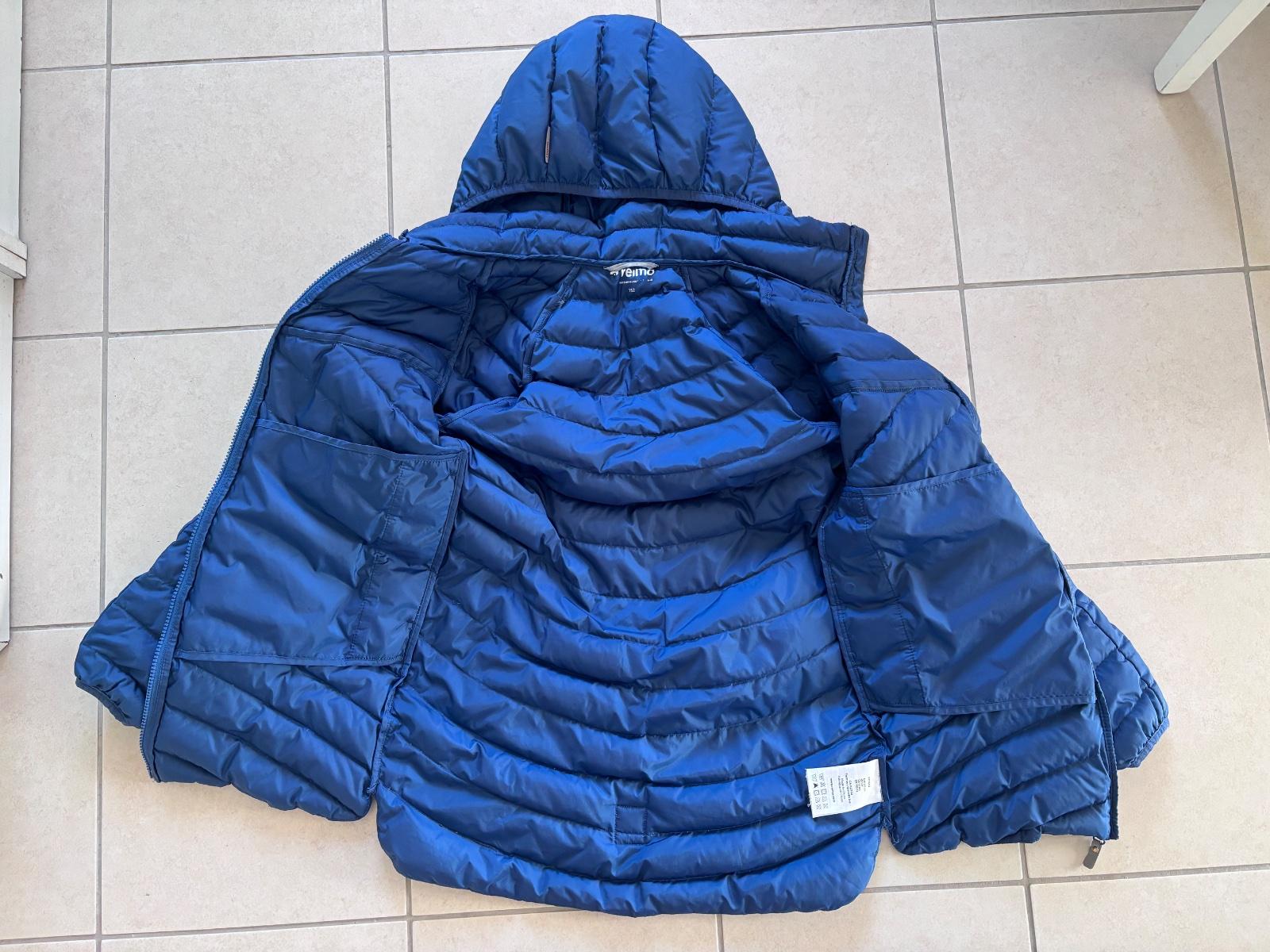 Tenšia páperová bunda. Dierky nema (jedna bola a ta je zalepena reflexnou zaplatou listocku pri vrecku), zmolky na gumickach na rukave, bežný nosený stav.