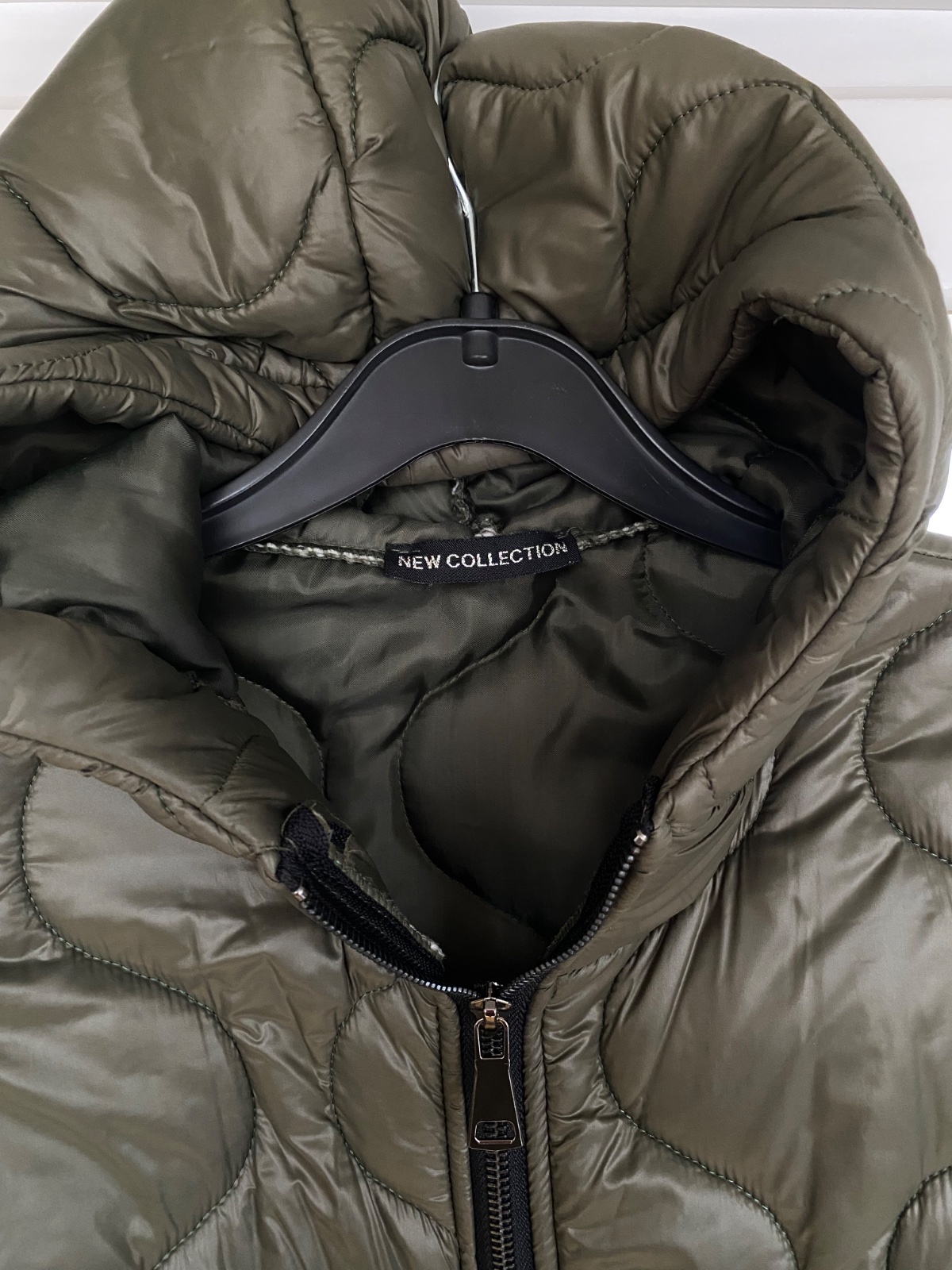 Minimálne nosená dámska vesta Vatovaná výplň, s kapucňou kožušinovou Na spodnom leme malé žmolky od prania Dĺžka je 54 cm,šírka v páse je 47*2 cm