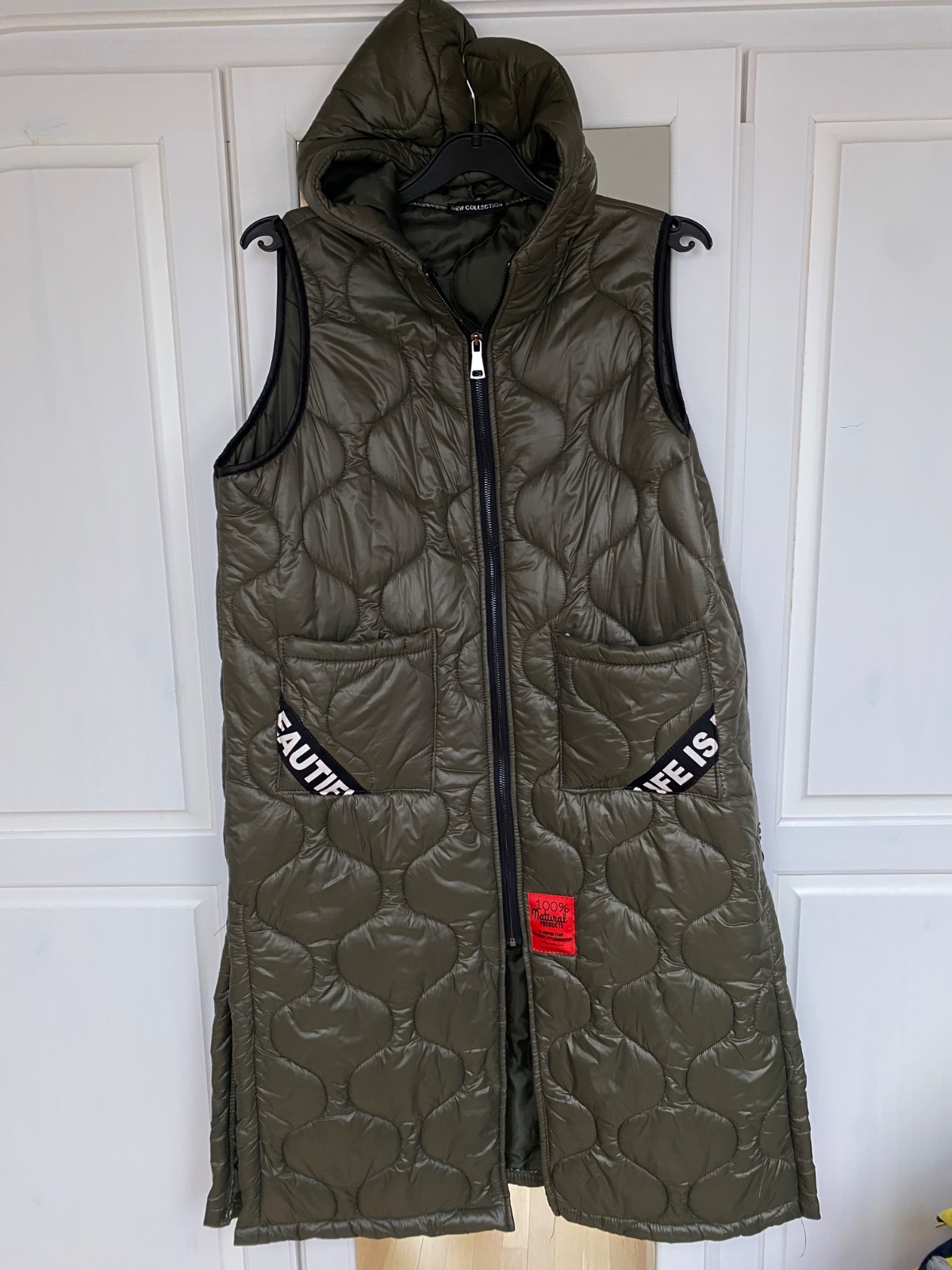 Krásna dlhá dámska vesta v top stave, minimálne nosená, v olivovej farbe. Veľkosť M/ L.