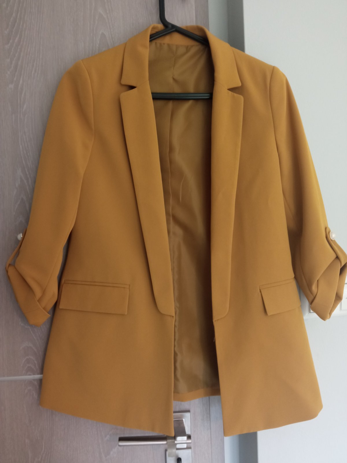 - ľahký, prechodný kabátik - bez zapínania - semišový materiál - dlhé rukávy - bodkované vnútro - dve vrecká na prednej strane - golier s klopami - materiál: 95% polyester, 5% spandex - dĺžka: 78 c...