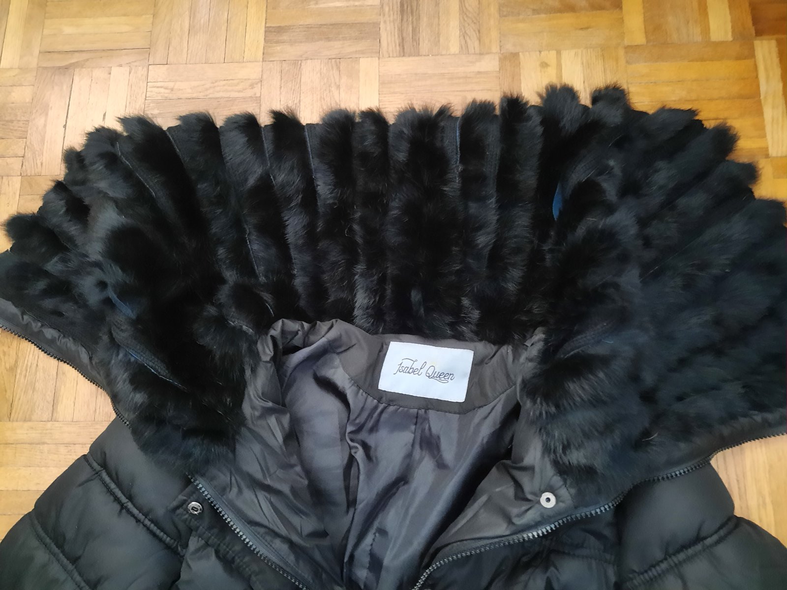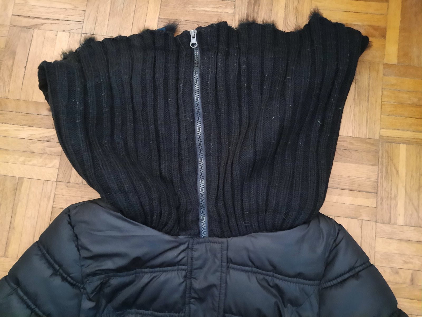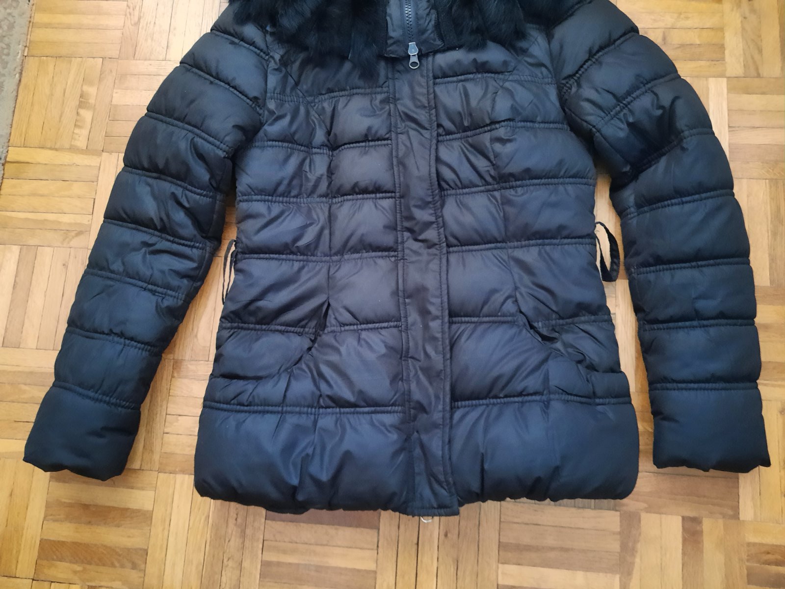 Krásna prešívaná bunda s veľkým golierom. Ten golier sa dá nosiť ako rolák, ale aj stiahnuť na ramená. Opasok nemám- dá sa v pohode nosiť aj bez neho, príp.s iným. Výborný stav. Vyzerá veľmi elegantne s tým golierom. Vačky sú vpredu. Zapínanie na zips+ nit. Veľkostne sedí na XS-S.