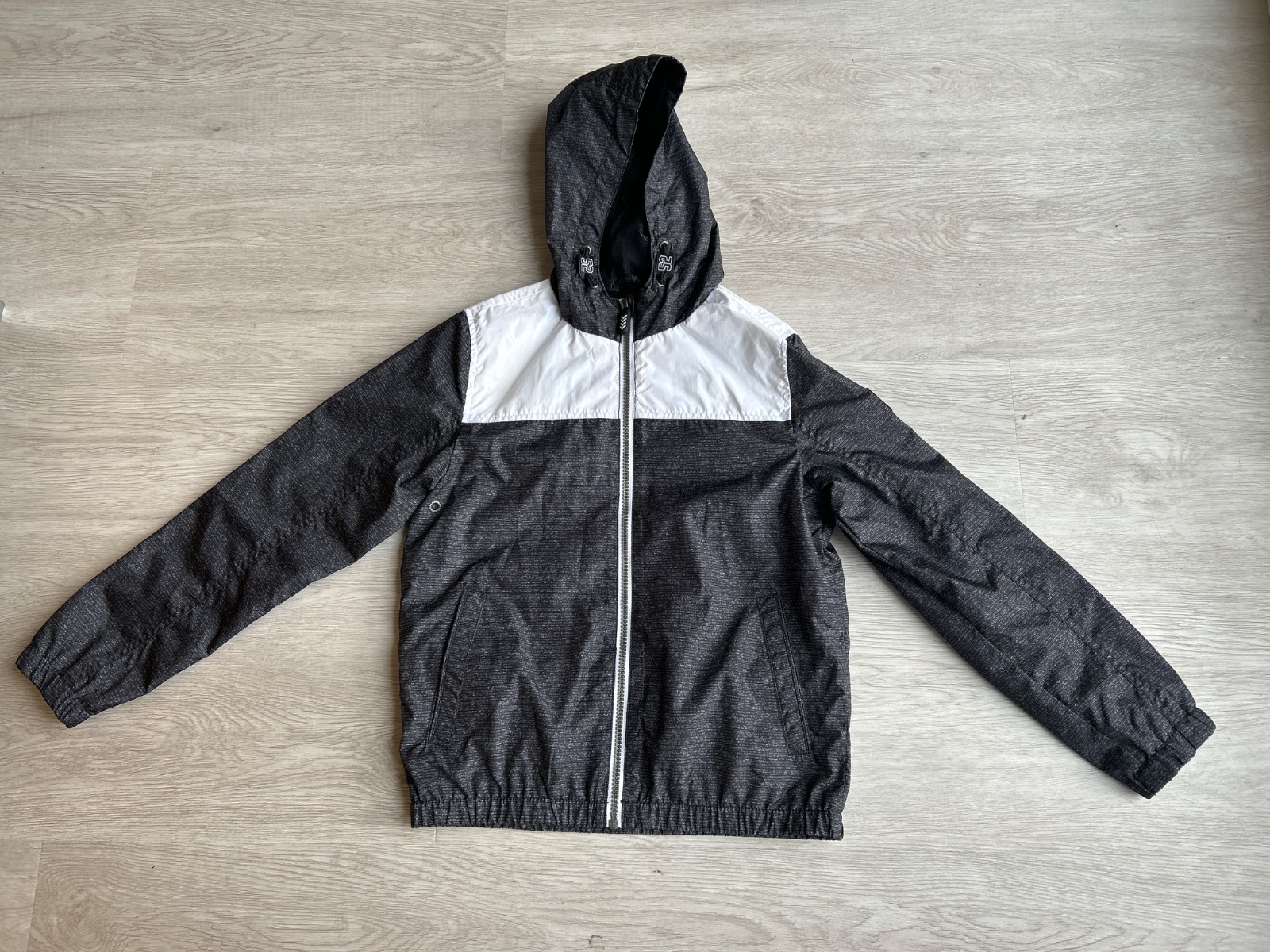 výborný stav kvalitná, praktická bundička - stojačik pri krku proti vetru, vydrží aj jemný dážď kapucňa odnímateľná podšitá látkou dĺžka od krku 57 cm šírka 42 cm rukáv od krku 60 cm