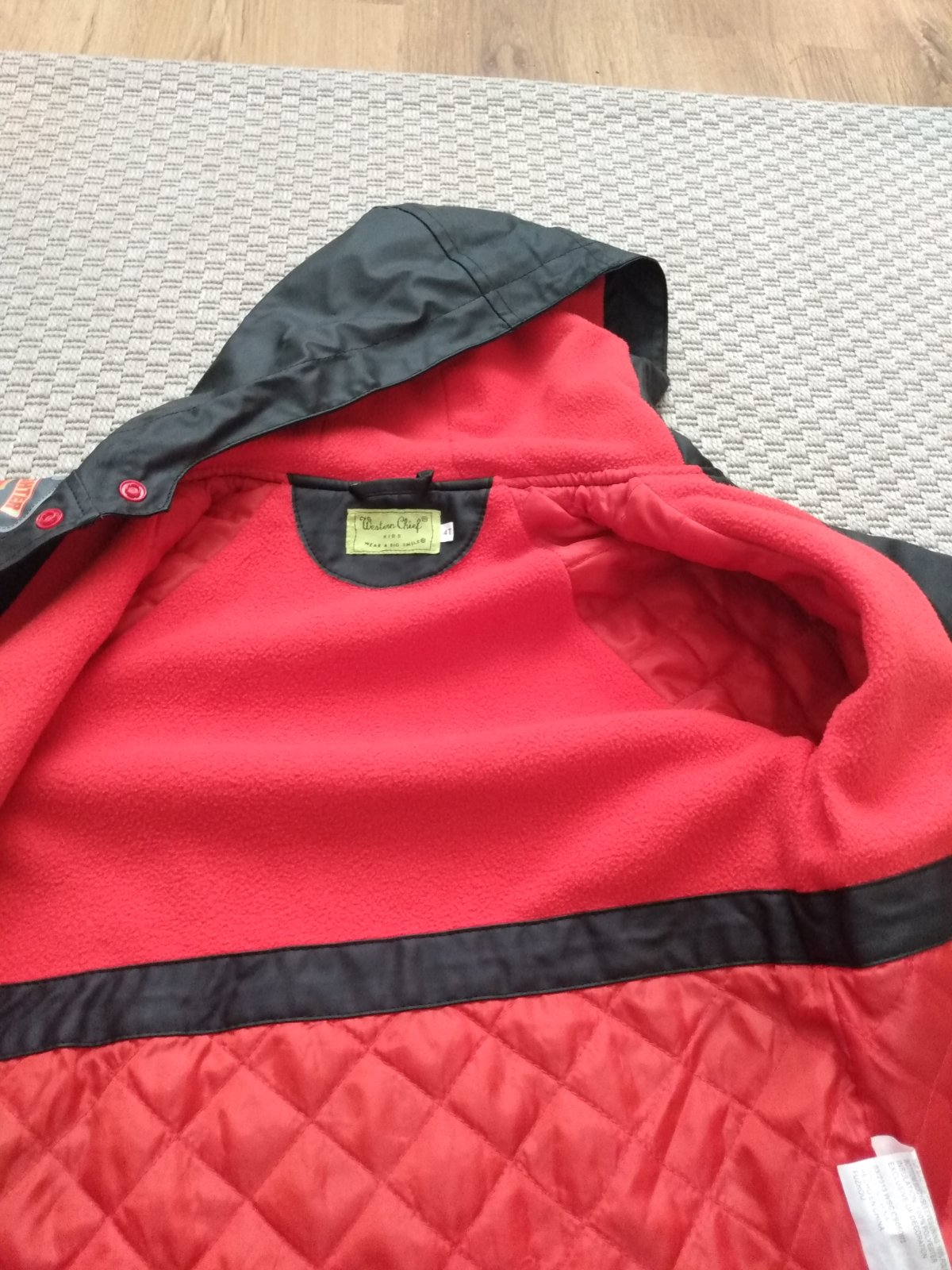 Krásna nepremokavá zateplená bundička pre malých požiarnikov. Dĺžka bundy od pleca dole 51cm, šírka bundy 40cm, dĺžka od začiatku kapucňe až po koniec rukáva 44cm (neviem odhadnúť kde začína plece, preto som odmerala celý rukáv)
