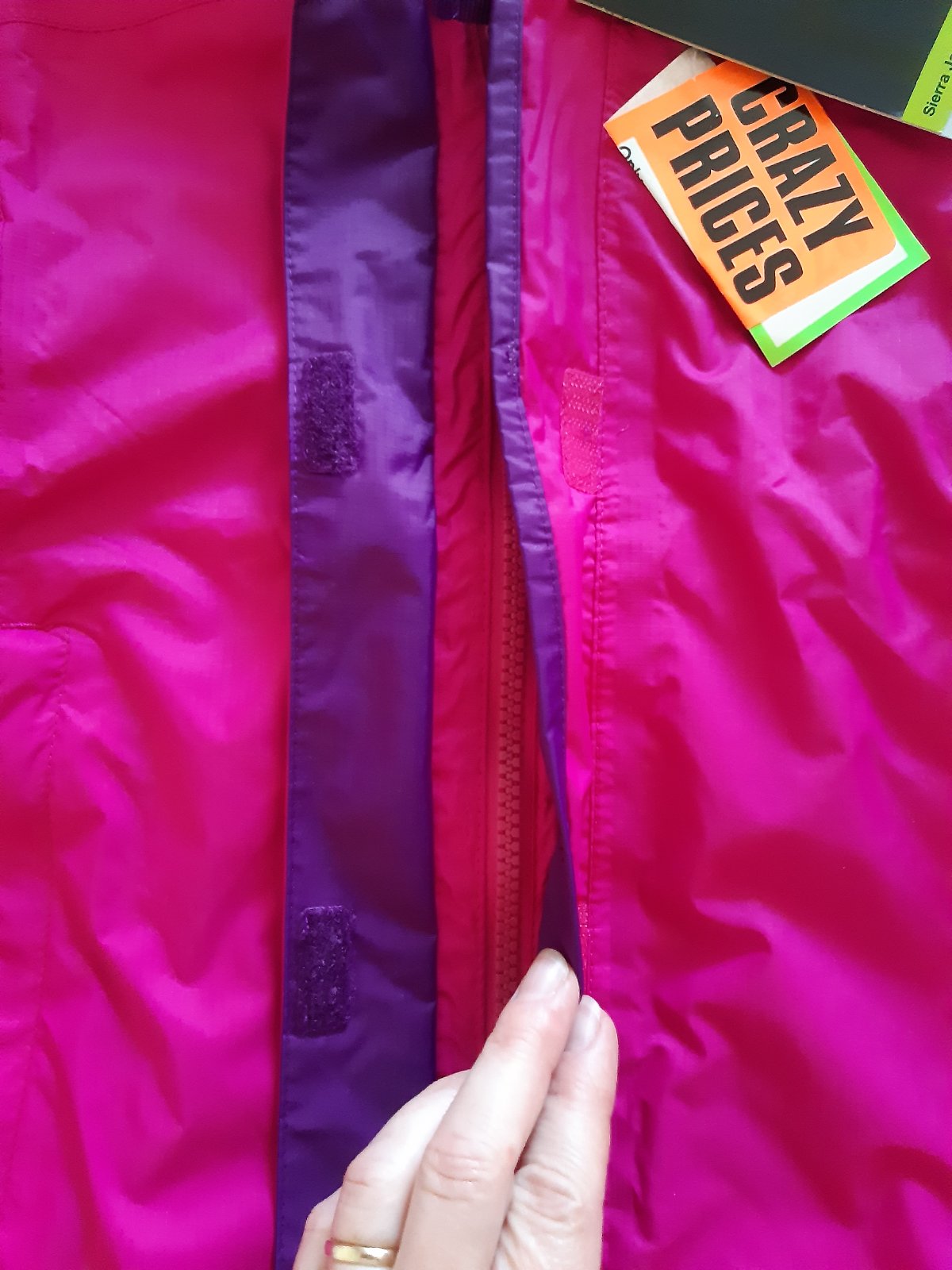 Vetrovka s visackou. Tenucka, futrovana. Na jednom mieste je futro jemne zatiahnute. V golieri ma zhrnutu kapucnu.