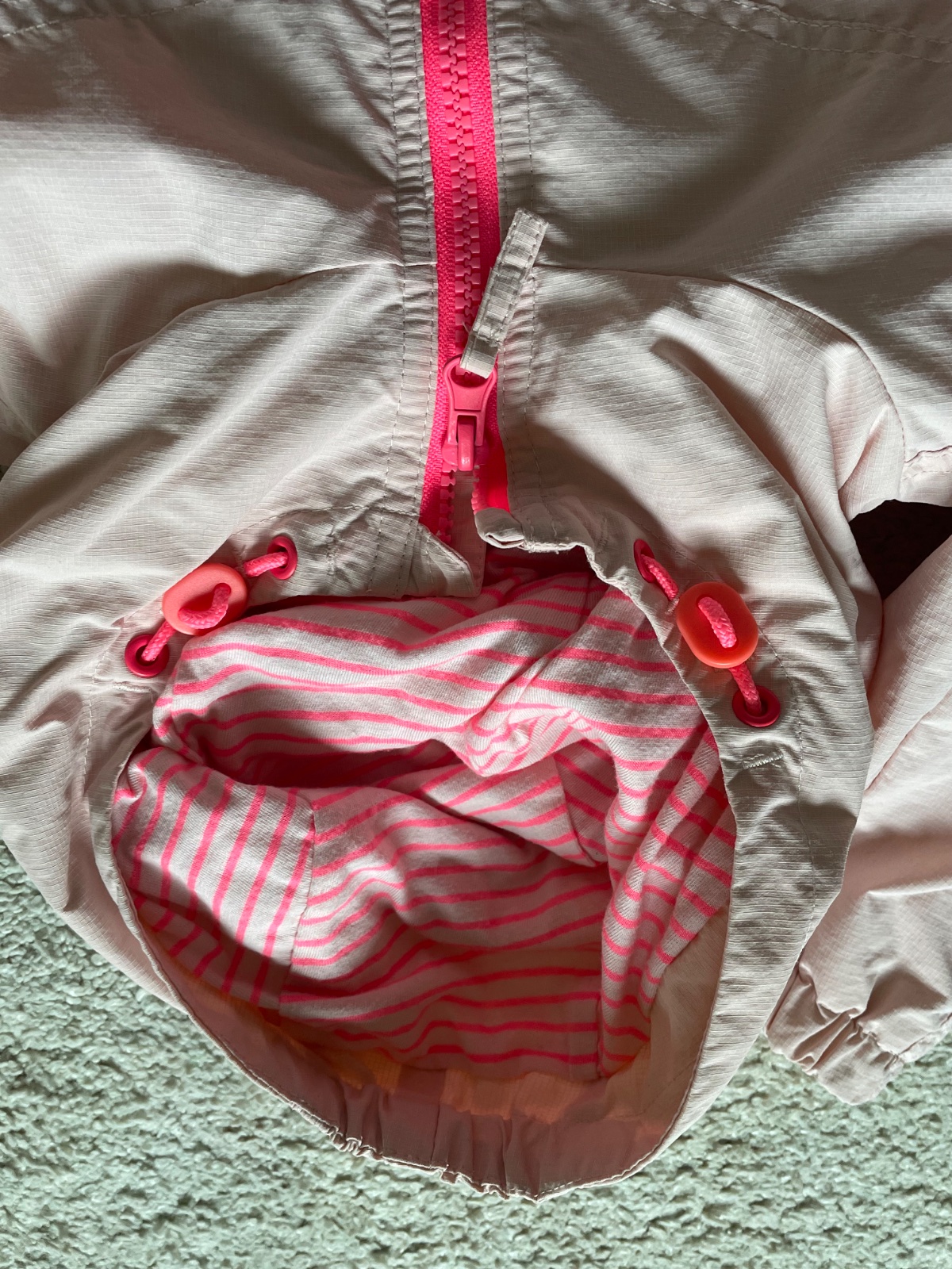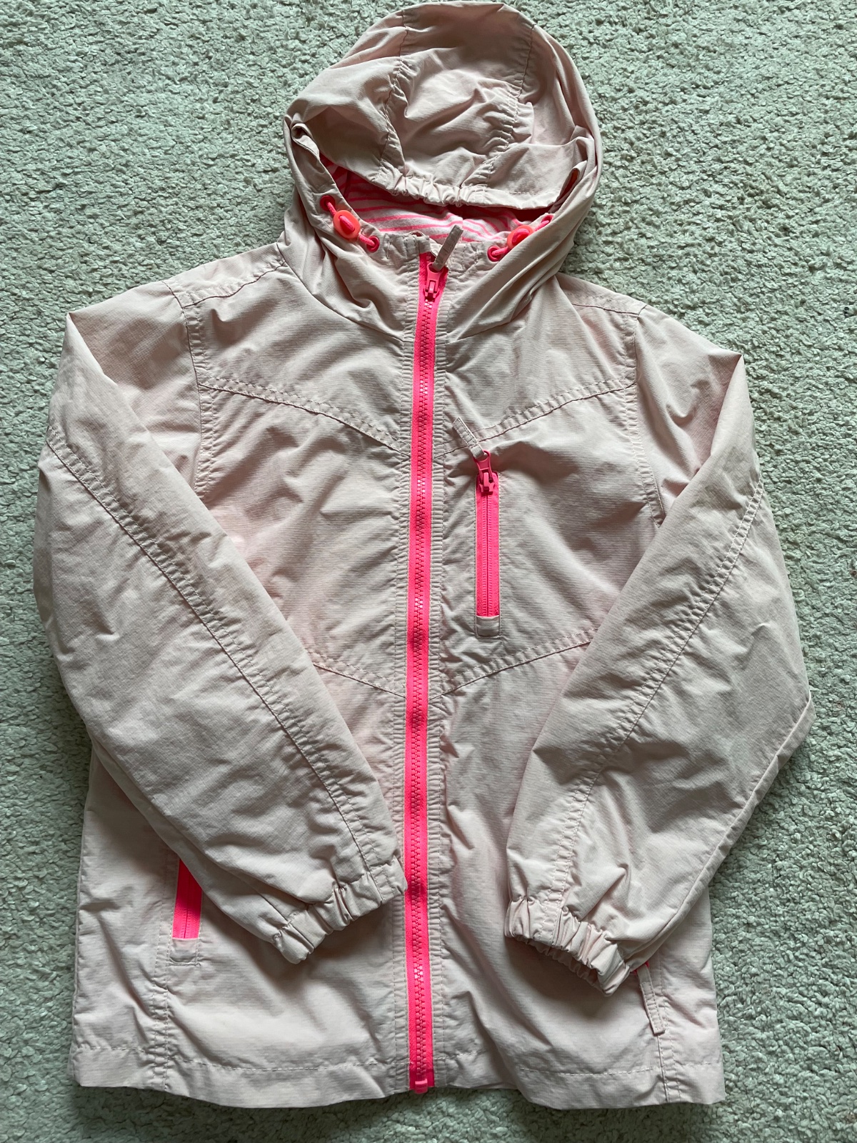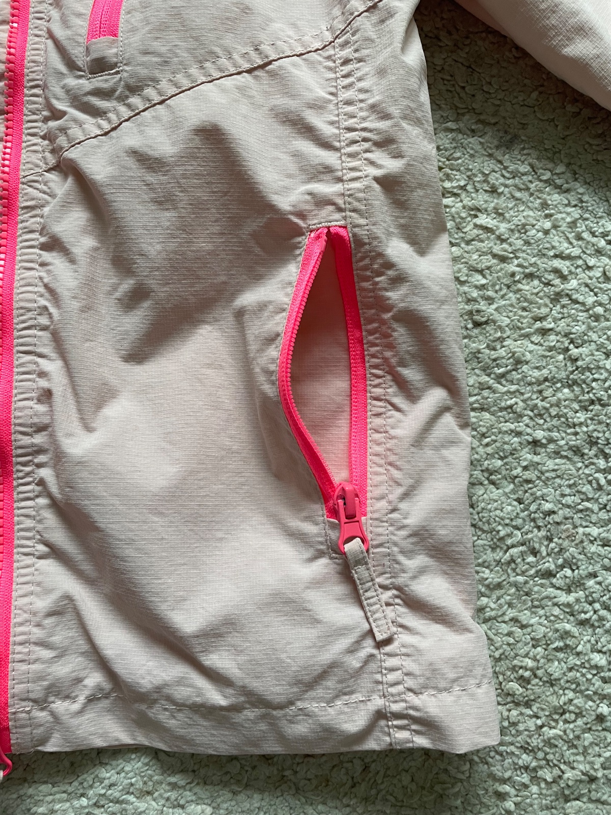 Dobrý nosený stav bez poškodení, len na patentoch rukávov sú trocha žmolky. Veľmi teplá a pohodlná, veľkosť 140, ale dá sa nosiť oveľa dlhšie. Farba metalízová bledoružová.