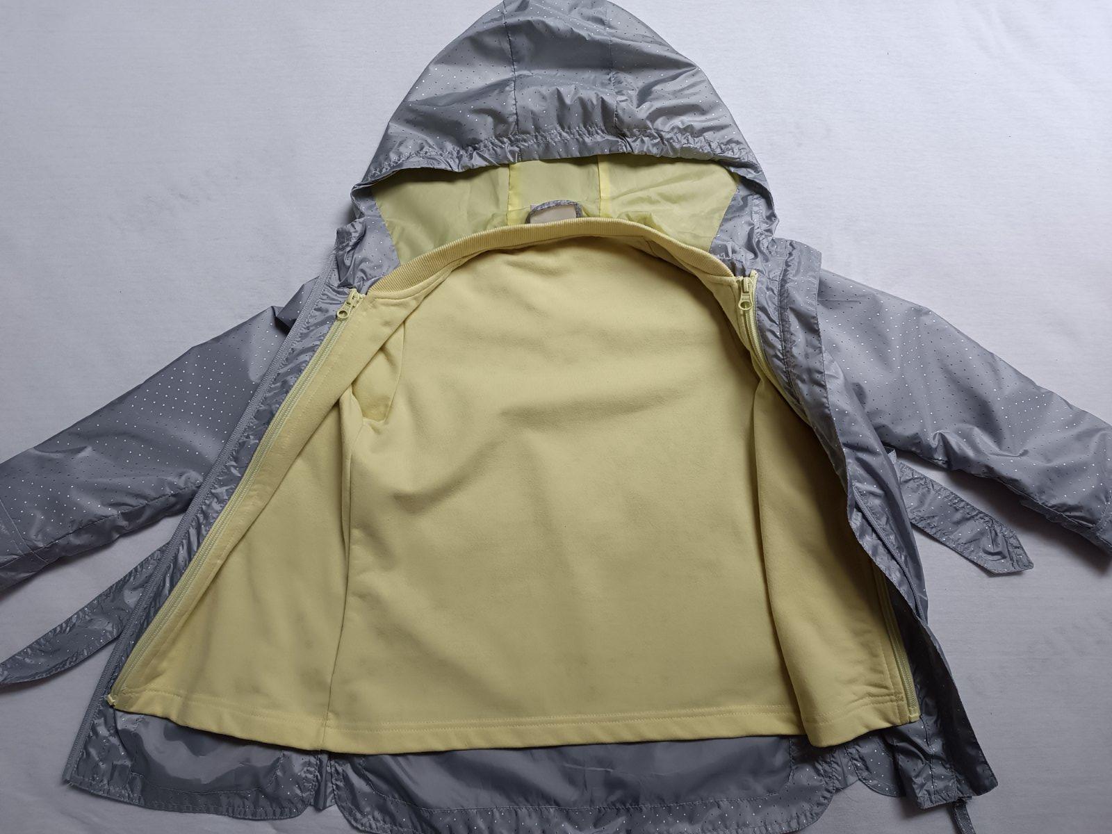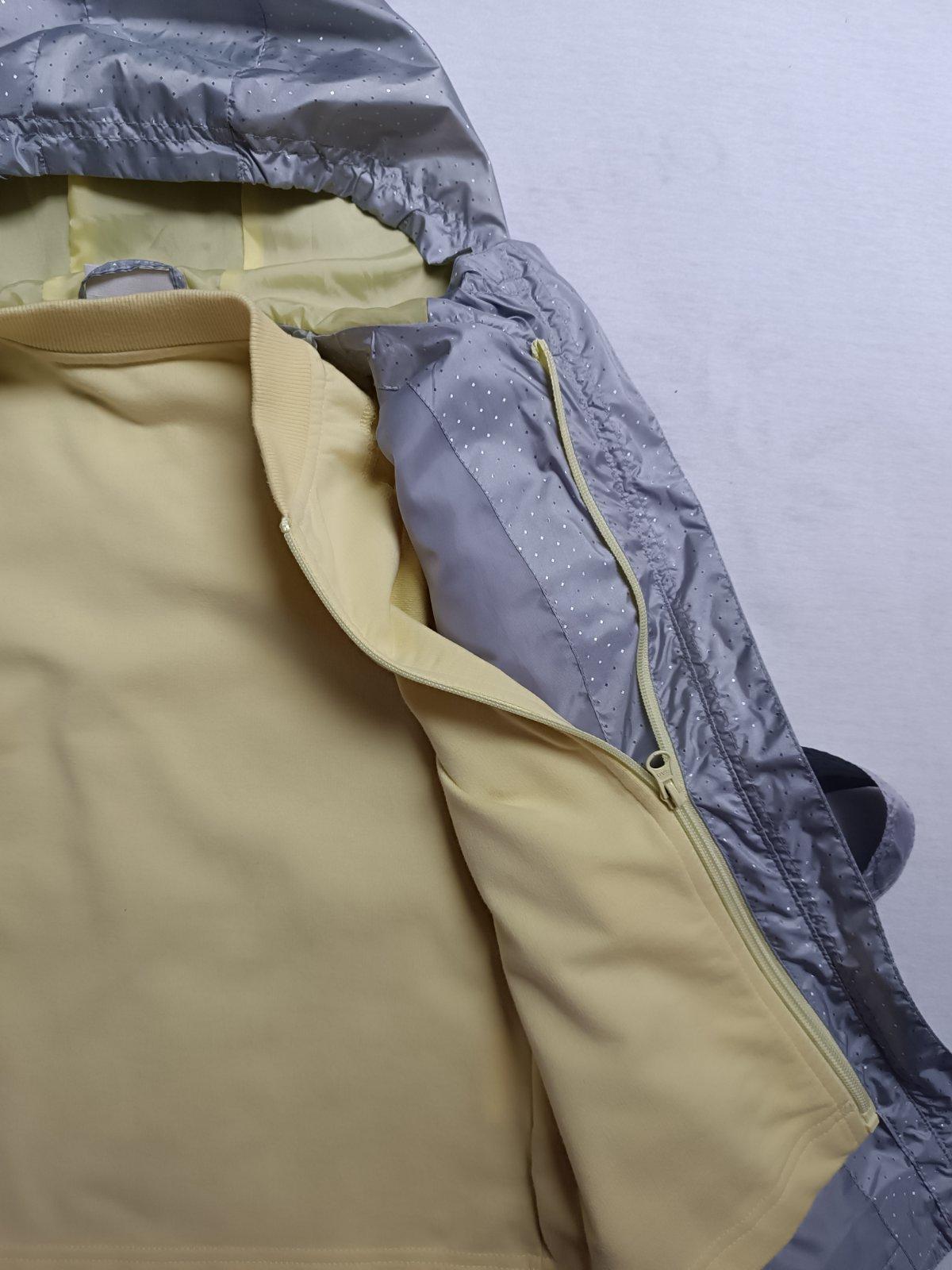Ako nová, bez známok nosenia. Oblečená možno 3 krát. Je to 2v1 jeden diel odzipsuješ od druhého. žltý diel (bavlna ) ja ako keby svetrík so stojačikom. Druhý diel šedý/strieborný je ako šuštiak. Strih mierne do áčka, pekne sedí .