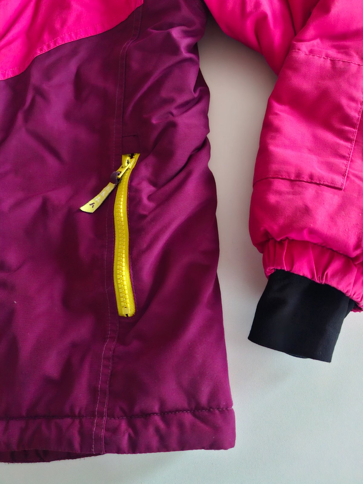 Nosená bundička, bez funkčných poškodení, má pár zatiahnutých nitiek a výplň na niektorých miestach (napr.na ramenách) nie je rovnomerná,no určite sa dá ešte využiť. Rozmery: prsia-2x49cm, dĺžka od...