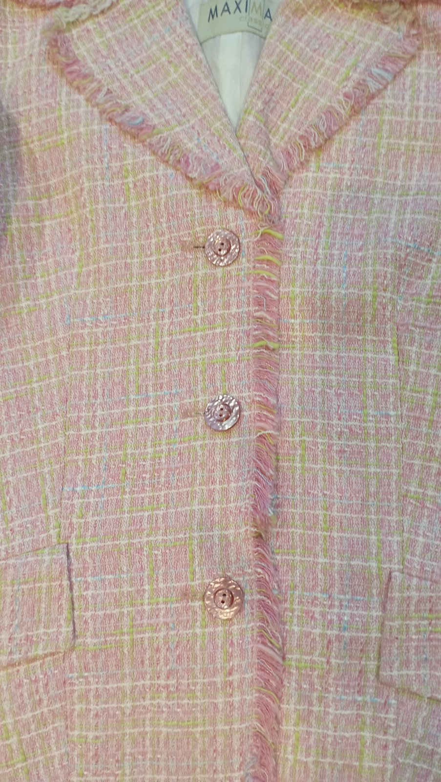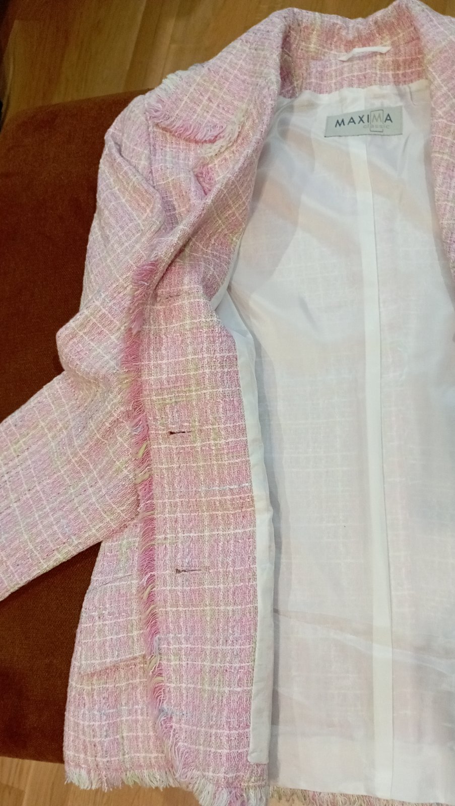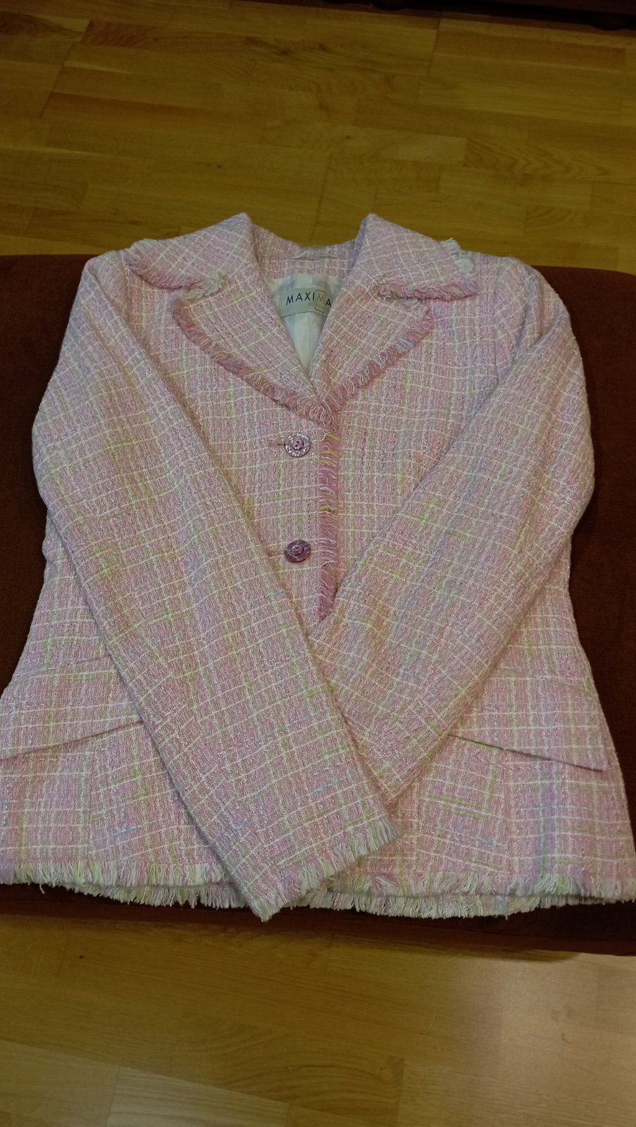 Skvelé pohodlné ružové sako s kvetmi Mierne elastické, prispôsobí sa postave Bez poškodenia Dĺžka 73cm, šírka pod pazuchami zadný diel 52cm, rukáv 48cm