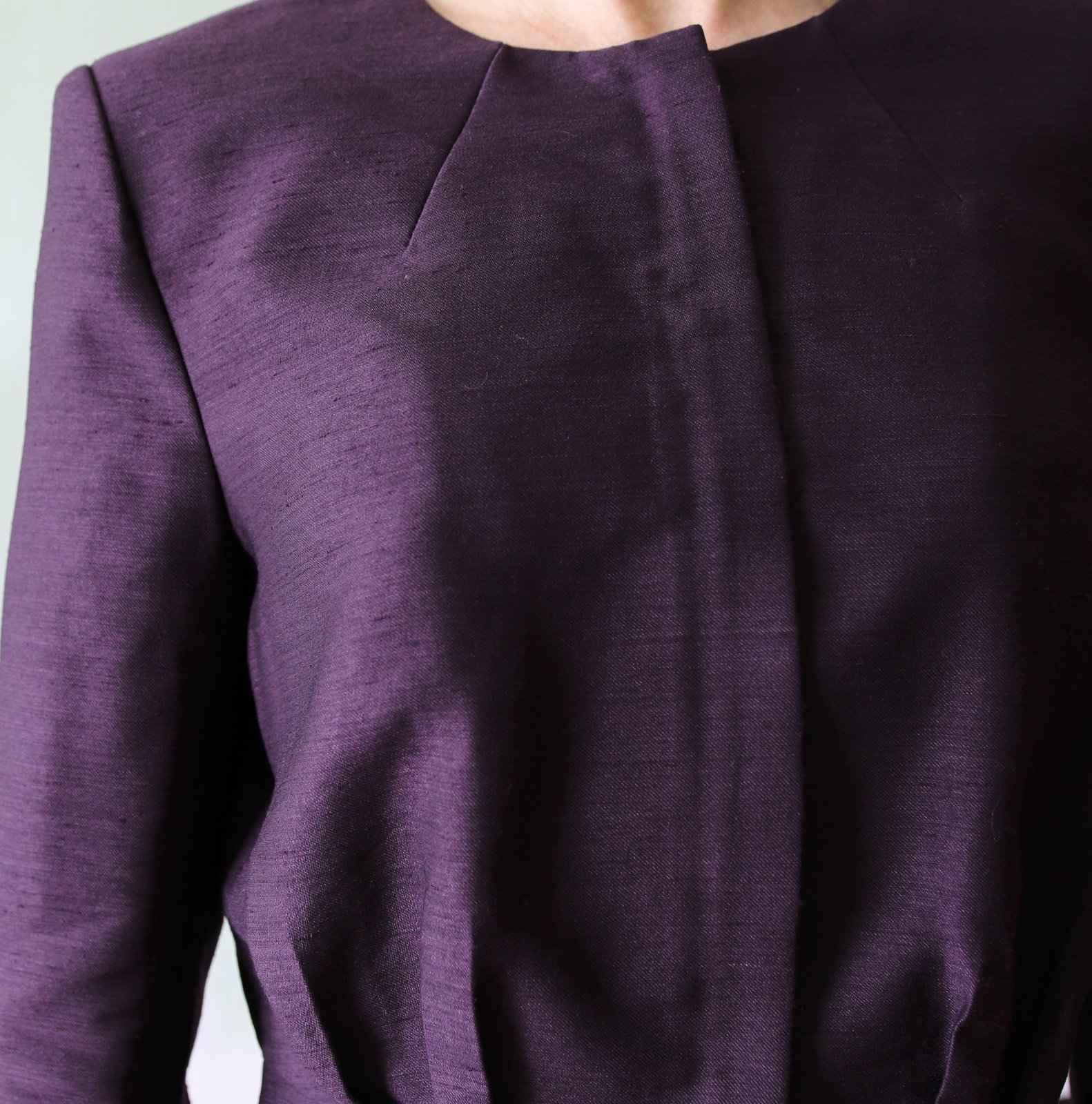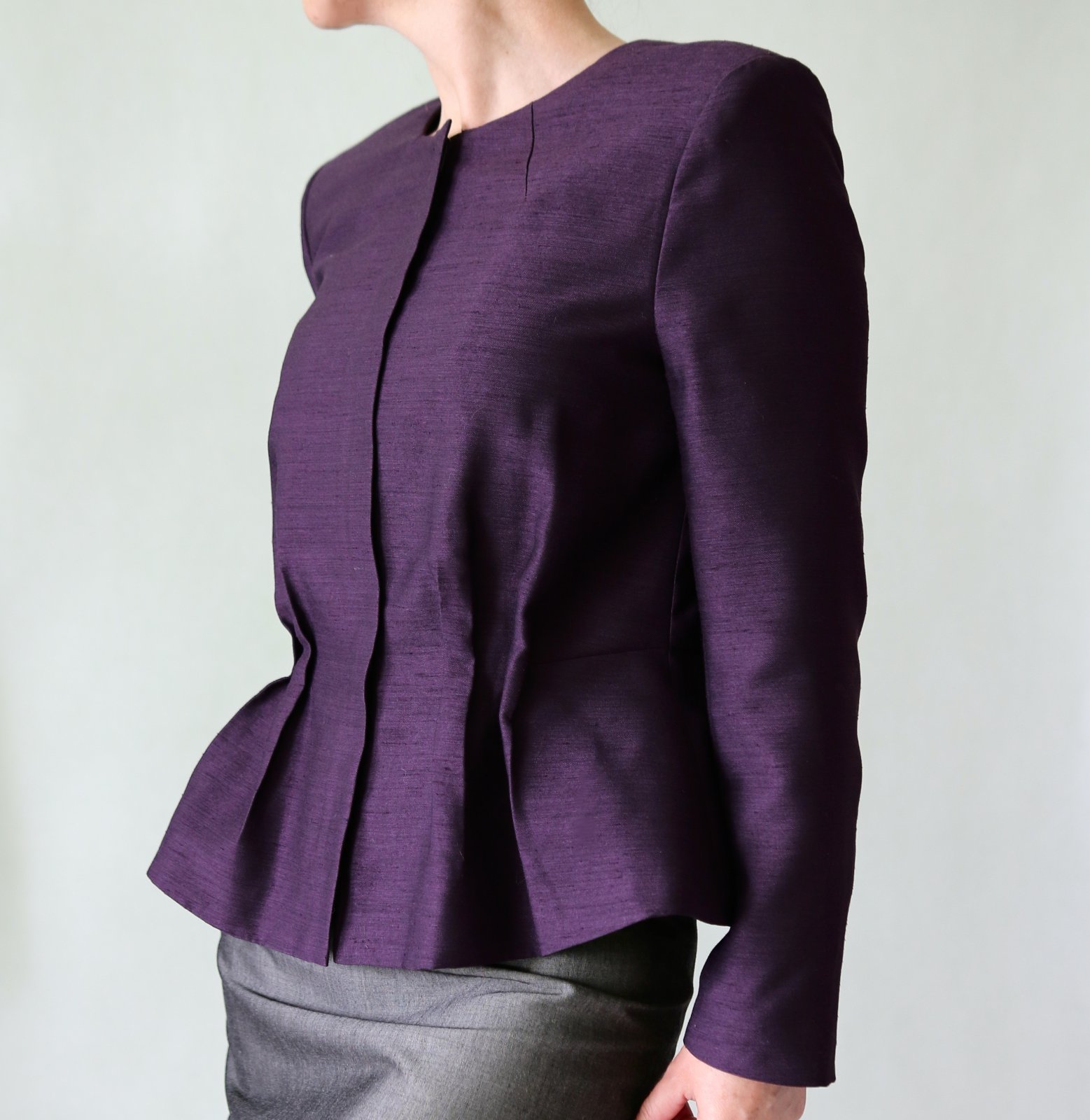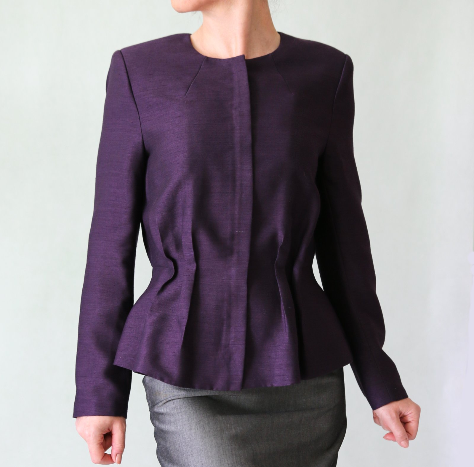 Zvláštne sako z veľmi peknej tmavofialovej látky s nerovným povrchom, krásnym jemným leskom, imitujúce dupionový hodváb. Sako má moderný okrúhly výstrih bez goliera, skryté zapínanie na zips a v páse je stiahnuté nezvyčajnými obrátenými záhybmi. Vďaka pevnému materiálu tak vzniká peplumová sukňa. Je podšité. Vrchný materiál: 84 % polyester, 16 % viskóza, podšívka 52 % polyester, 48 % viskóza.